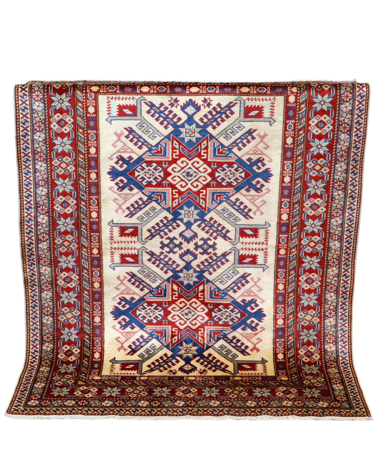 Il campo beige fa da sfondo a tre medaglioni geometrici centrali, ciascuno un piccolo scrigno di forme e tonalità vivaci. La cornice, arricchita da un fregio di motivi geometrici elaborati, racchiude l’intera composizione in un abbraccio di eleganza e simmetria. I colori vegetali, con le loro sfumature calde e avvolgenti, donano al tappeto una profondità e una bellezza senza tempo, garantendo durabilità e fascino negli anni.