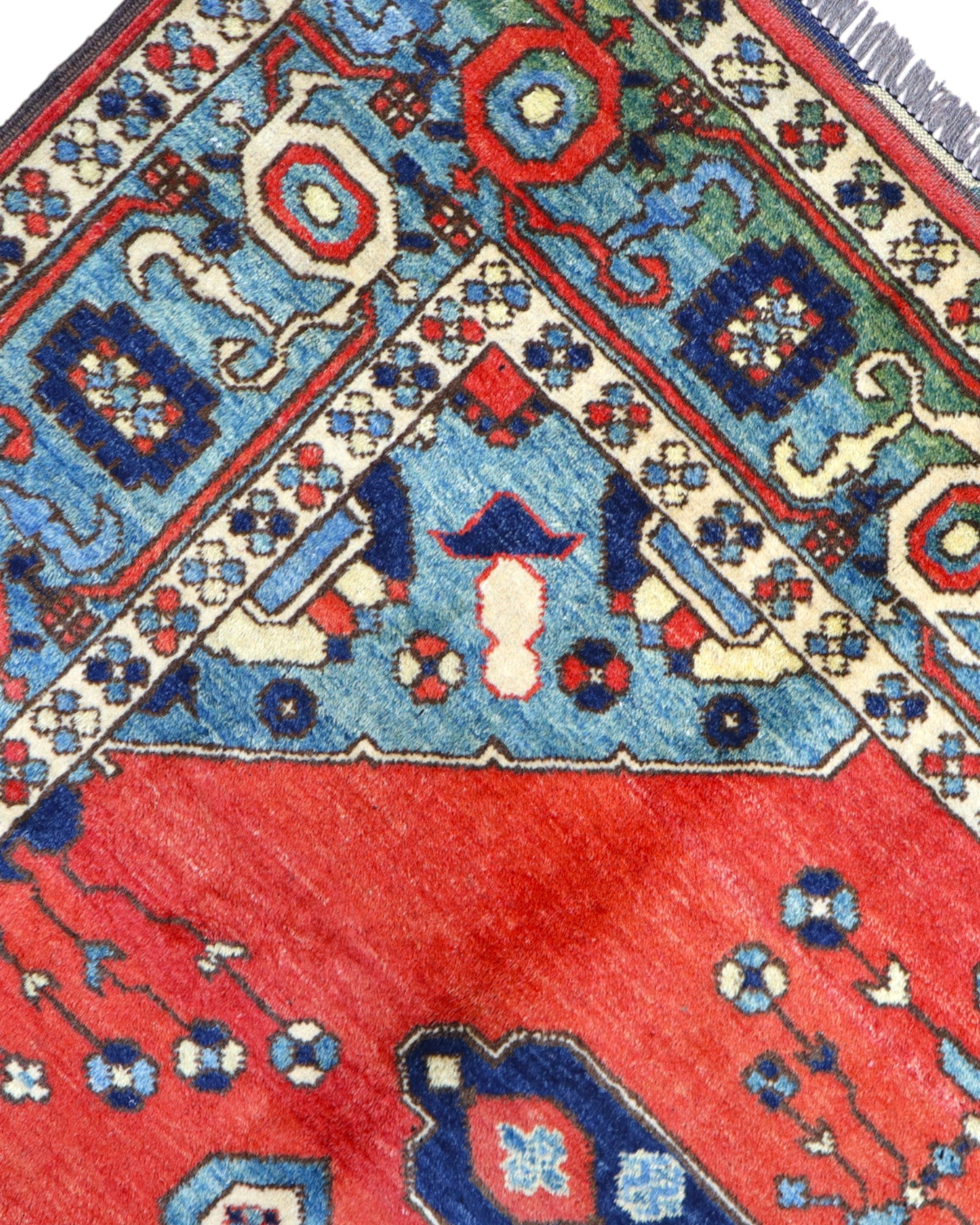 Il design si distingue per un fondo nel vibrante colore rosso, arricchito da motivi geometrici che si snodano con armonia su tutta la superficie. La combinazione di tonalità e la ricchezza dei dettagli conferisce al tappeto un'eleganza intrinseca e una magnificenza che non passa inosservata.