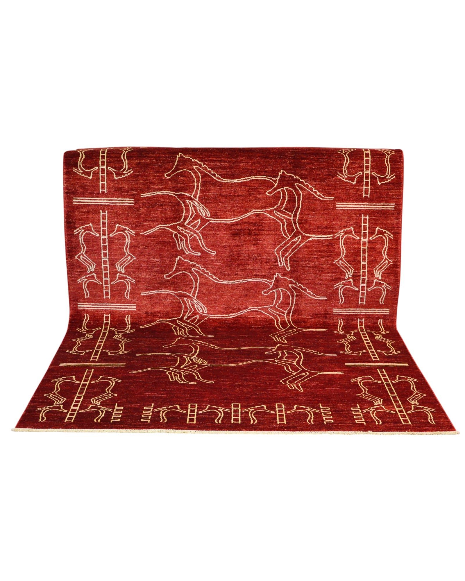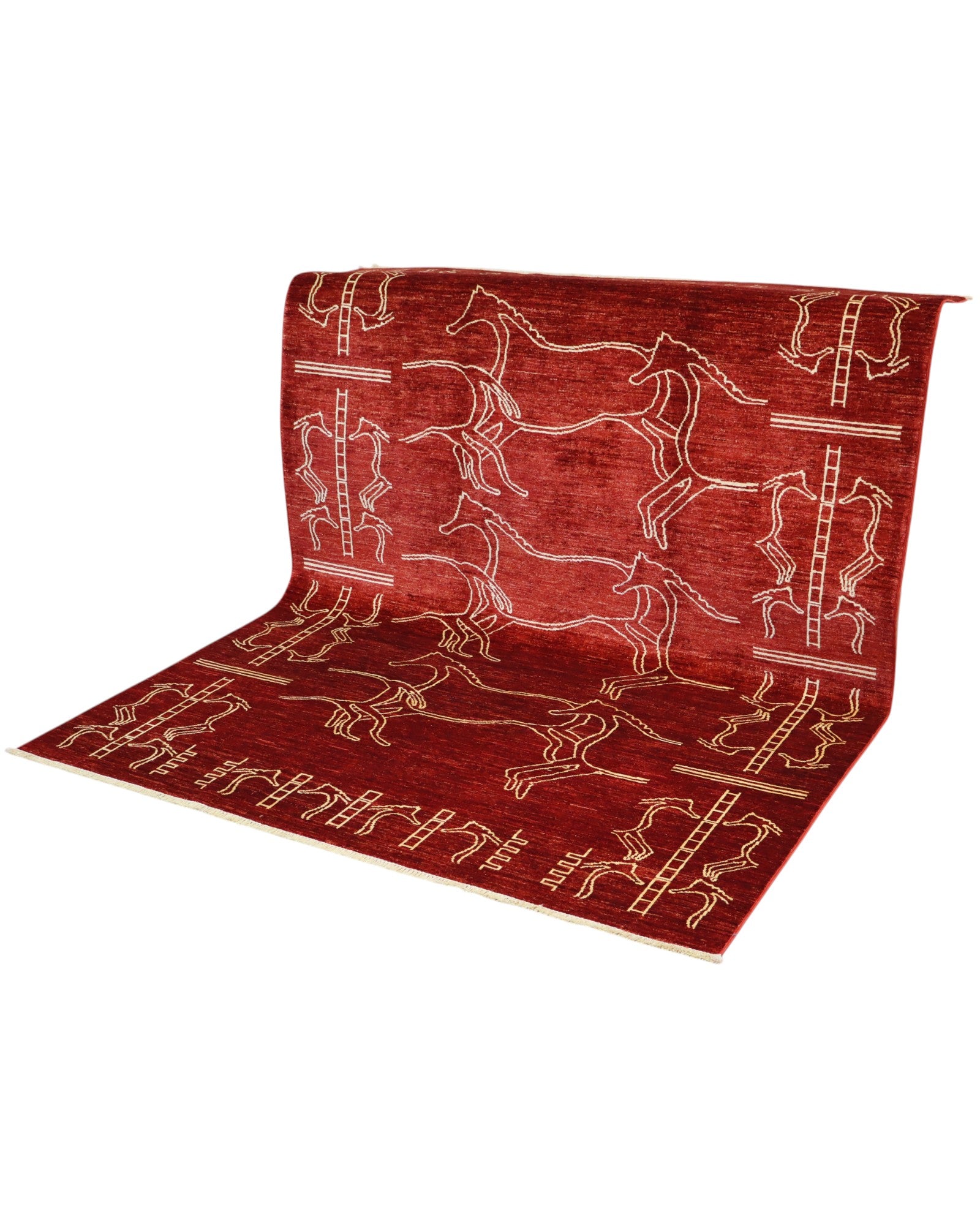 Immergiti nell'arte e nella storia con il tappeto "Cavalli di Darios", un'opera distintiva disegnata da Darios, che evoca antiche pitture rupestri. Con le sue dimensioni di 234 x 180 cm, questo tappeto è un vero punto focale per la tua casa. Il design presenta un intenso fondo rosso o bordeaux, su cui risaltano figure stilizzate di cavalli in corsa, realizzate con un colore chiaro (come l'ocra o il beige). Il motivo si estende anche sul bordo, con figure e simboli geometrici che richiamano l'arte primitiva. Interamente annodato a mano sul telaio tradizionale, vanta un vello in lana che offre morbidezza e resistenza. La trama e l'ordito in cotone assicurano stabilità e longevità. L'uso di colori vegetali garantisce tonalità ricche e durature. Viene fornito con un certificato di autenticità, a garanzia della sua origine e qualità.