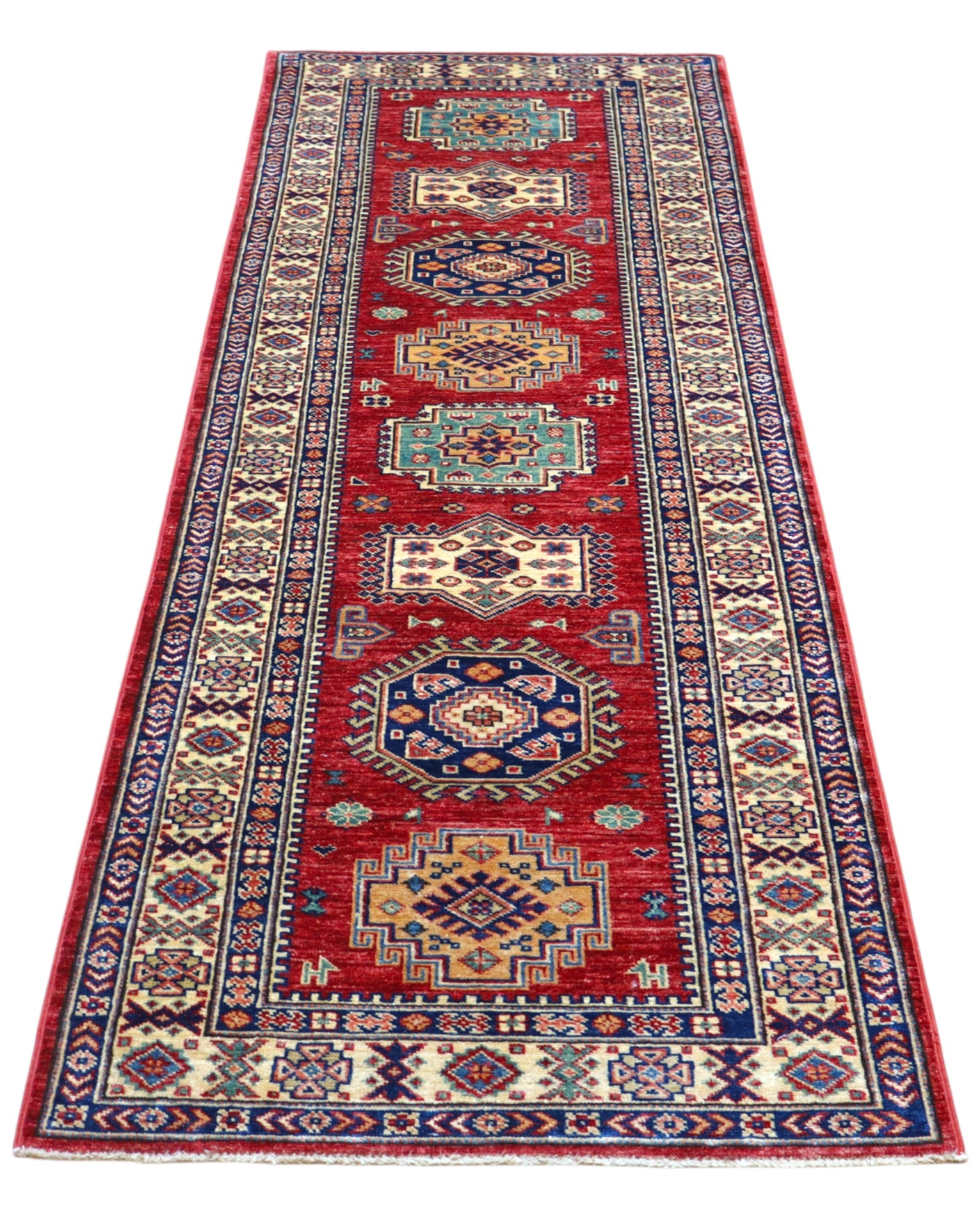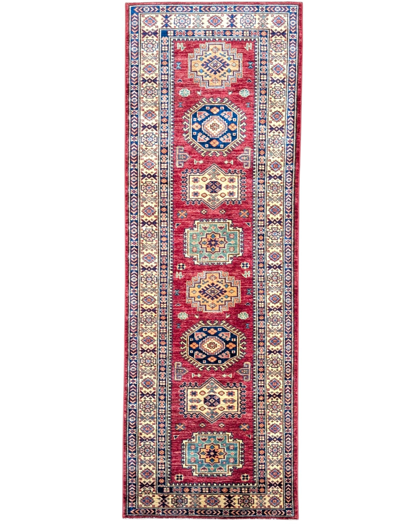 Il tappeto Kazak 236x82 cm è un corridore geometrico dal carattere forte e deciso. Sul fondo rosso vivo si alternano motivi ottagonali e medaglioni dai colori intensi come il blu, il verde, l’avorio e l’oro, creando un ritmo visivo tipico dei tappeti caucasici.