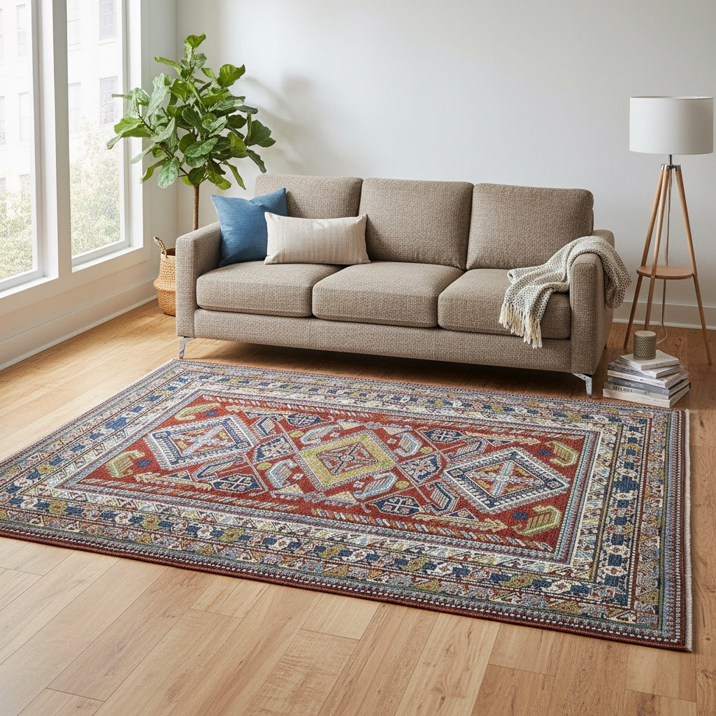 Il design presenta un fondo nel vibrante colore rosso, arricchito da motivi geometrici che si snodano con armonia su tutta la superficie. La combinazione di tonalità e la ricchezza dei dettagli conferiscono al tappeto un'eleganza intrinseca e una magnificenza che non passa inosservata.
