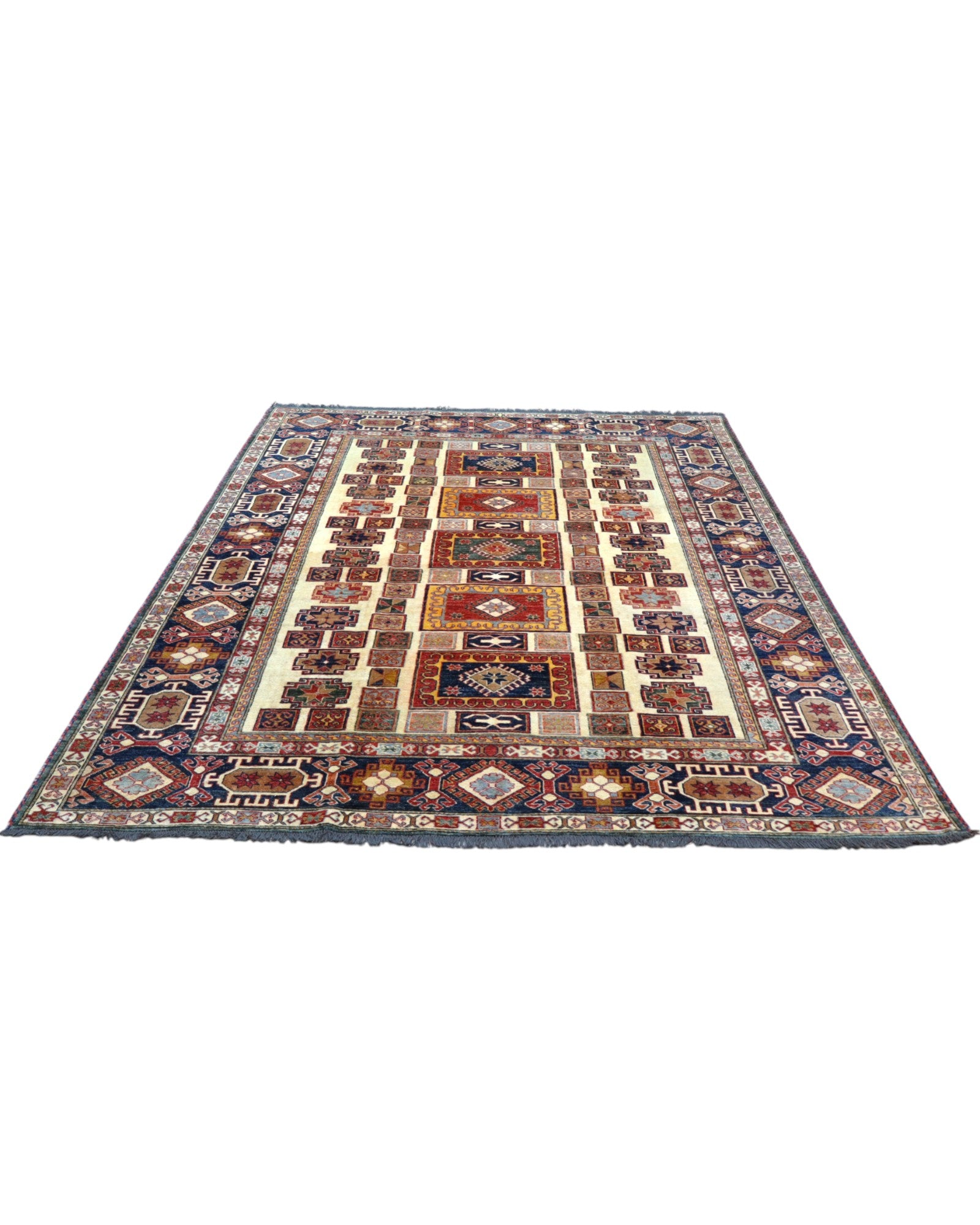 Questo tappeto Kazak è tramato ed annodato a mano su telai tradizionali da esperti artigiani, con trama e ordito in cotone resistente e vello in pura lana tinta con colori vegetali. Le sue dimensioni di 285 x 222 cm lo rendono un tappeto scenografico, ideale come elemento centrale in ampi spazi abitativi.