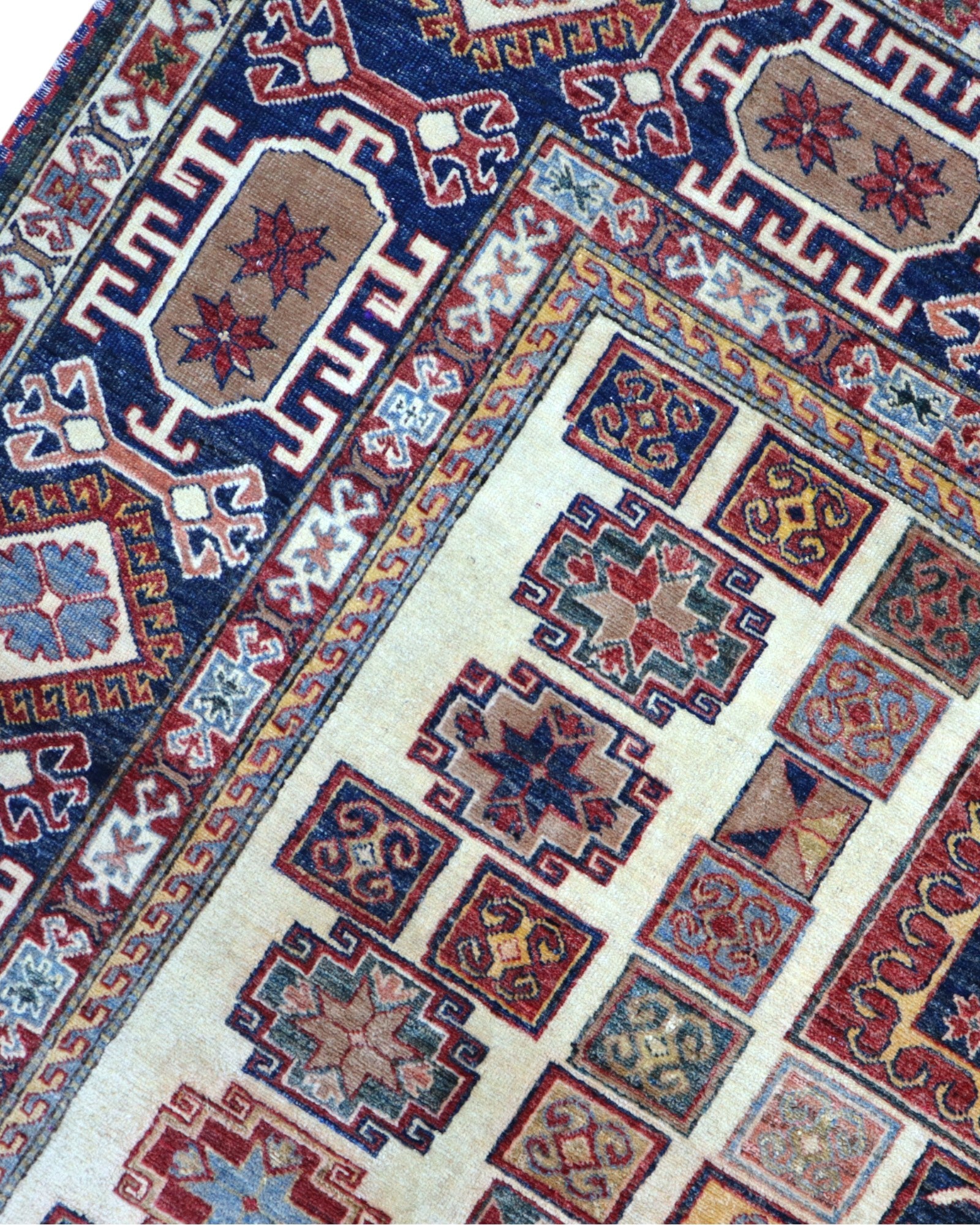 Il disegno presenta un fondo chiaro decorato da una sequenza di motivi geometrici multicolore, distribuiti in pannelli rettangolari che richiamano la simbologia caucasica tradizionale. Le bordure ricche e complesse completano il tappeto, conferendo profondità e un forte impatto visivo.