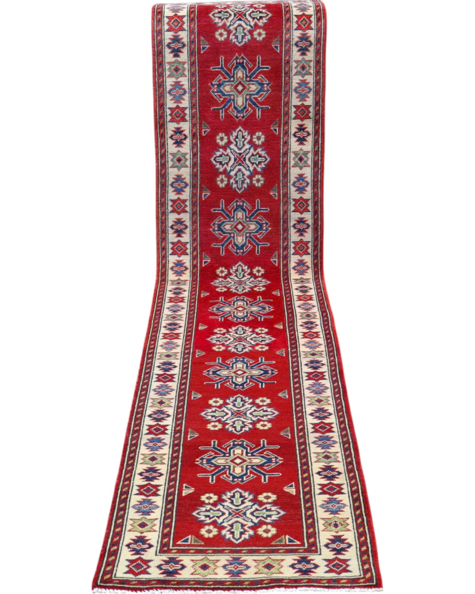 Passatoia Kazak - Geometrie Vibranti in Rosso Melograno e Beige (297 x 61 cm)