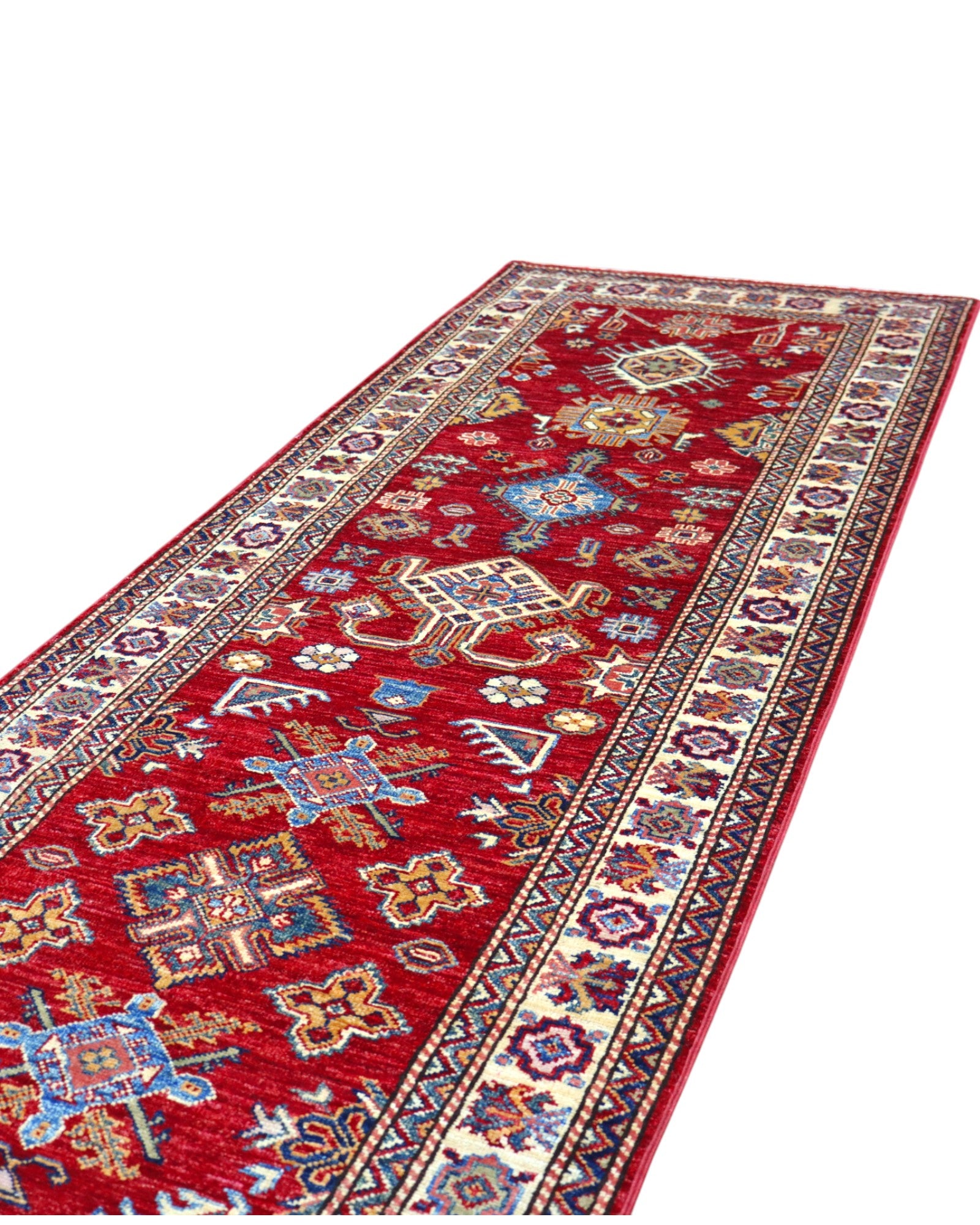 Il design si distingue per un fondo nel vivace colore rosso, arricchito da motivi geometrici che si snodano con armonia lungo la sua lunghezza. La combinazione di tonalità e la ricchezza dei dettagli conferiscono alla passatoia un'eleganza intrinseca e una magnificenza che non passa inosservata.