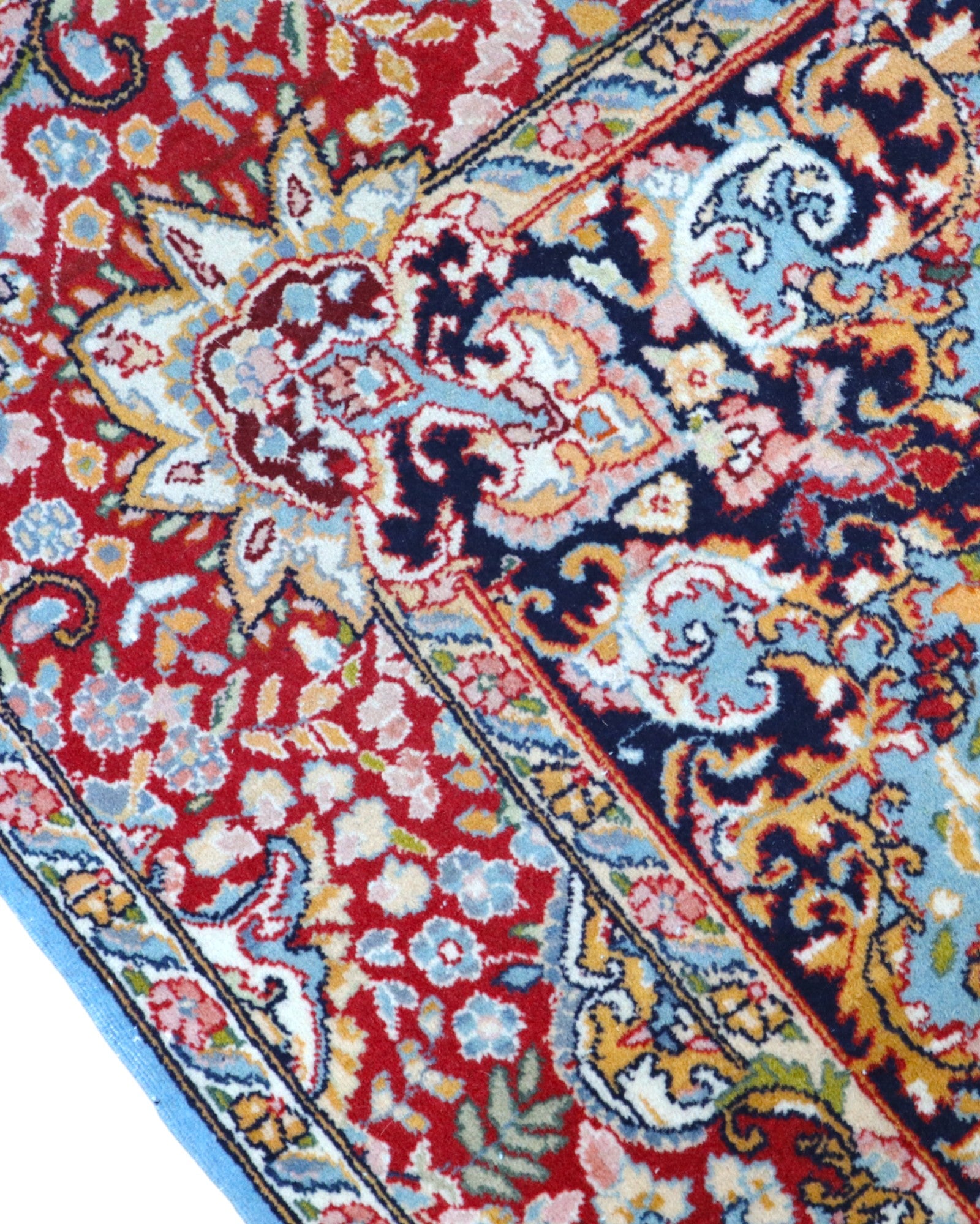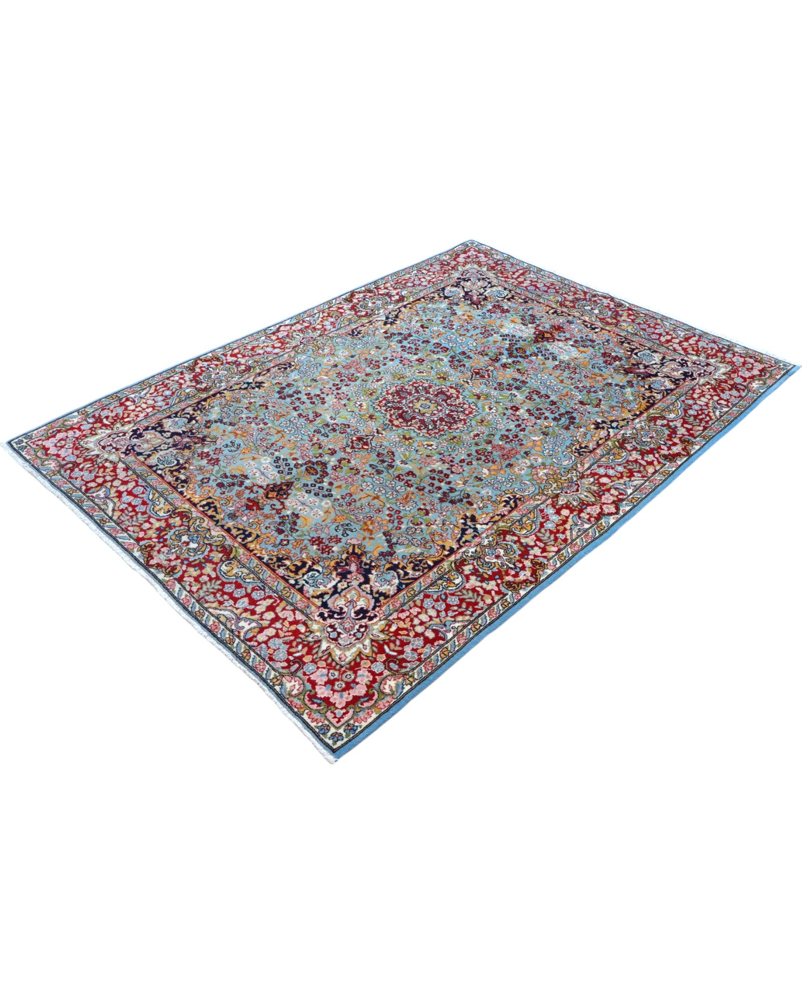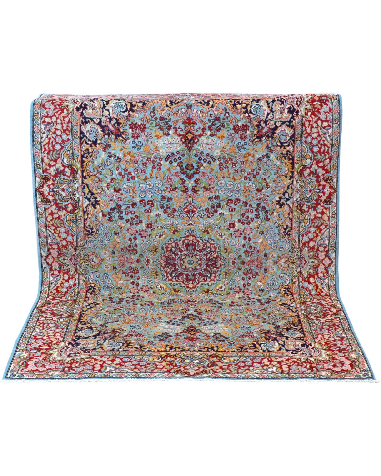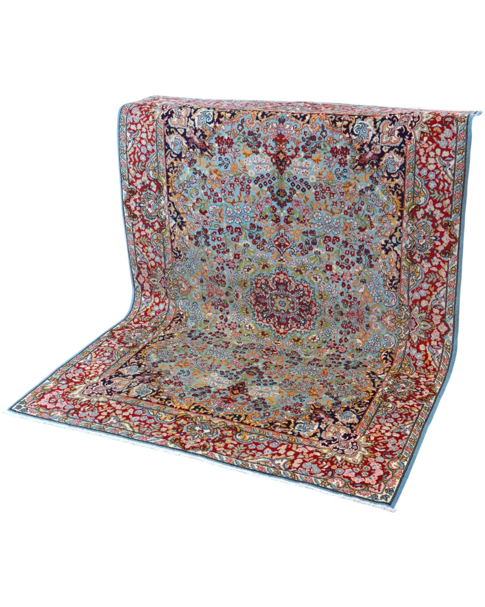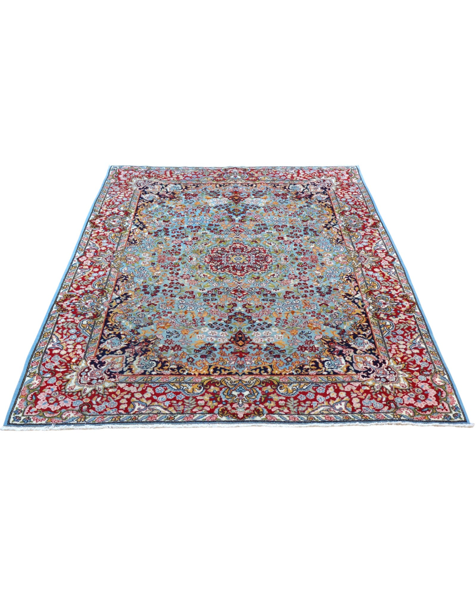 Il campo azzurro cielo ospita un intricato motivo decorativo, caratterizzato da dettagli raffinati e volute armoniose. La combinazione di colori vegetali e dettagli complessi conferisce al tappeto profondità, eleganza e fascino autentico, che si manterrà nel tempo.