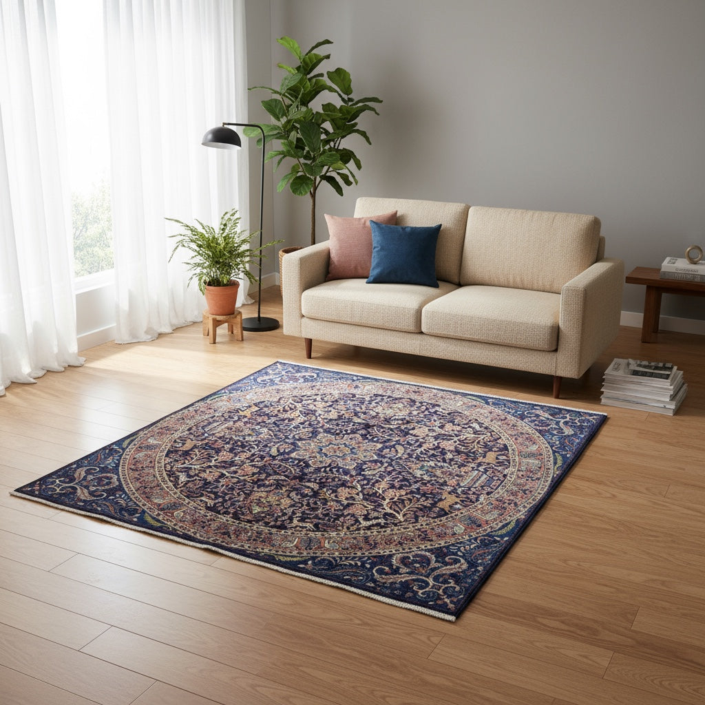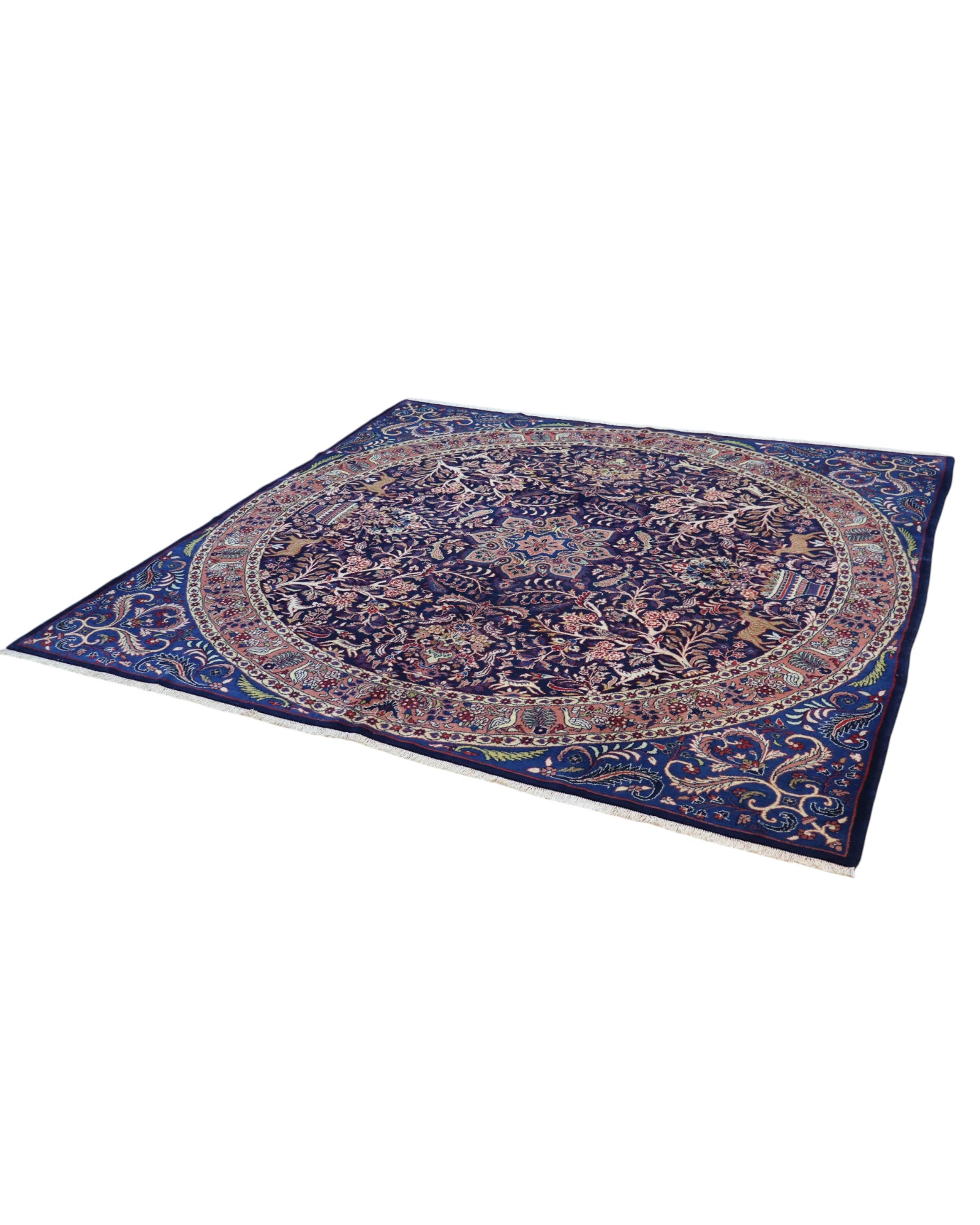 Il fondo blu, arricchito da motivi floreali e un maestoso medaglione centrale, esprime armonia ed eleganza intramontabile. La ricchezza dei dettagli e la raffinatezza dei disegni rendono questo tappeto un elemento distintivo capace di impreziosire con classe qualsiasi spazio abitativo.
