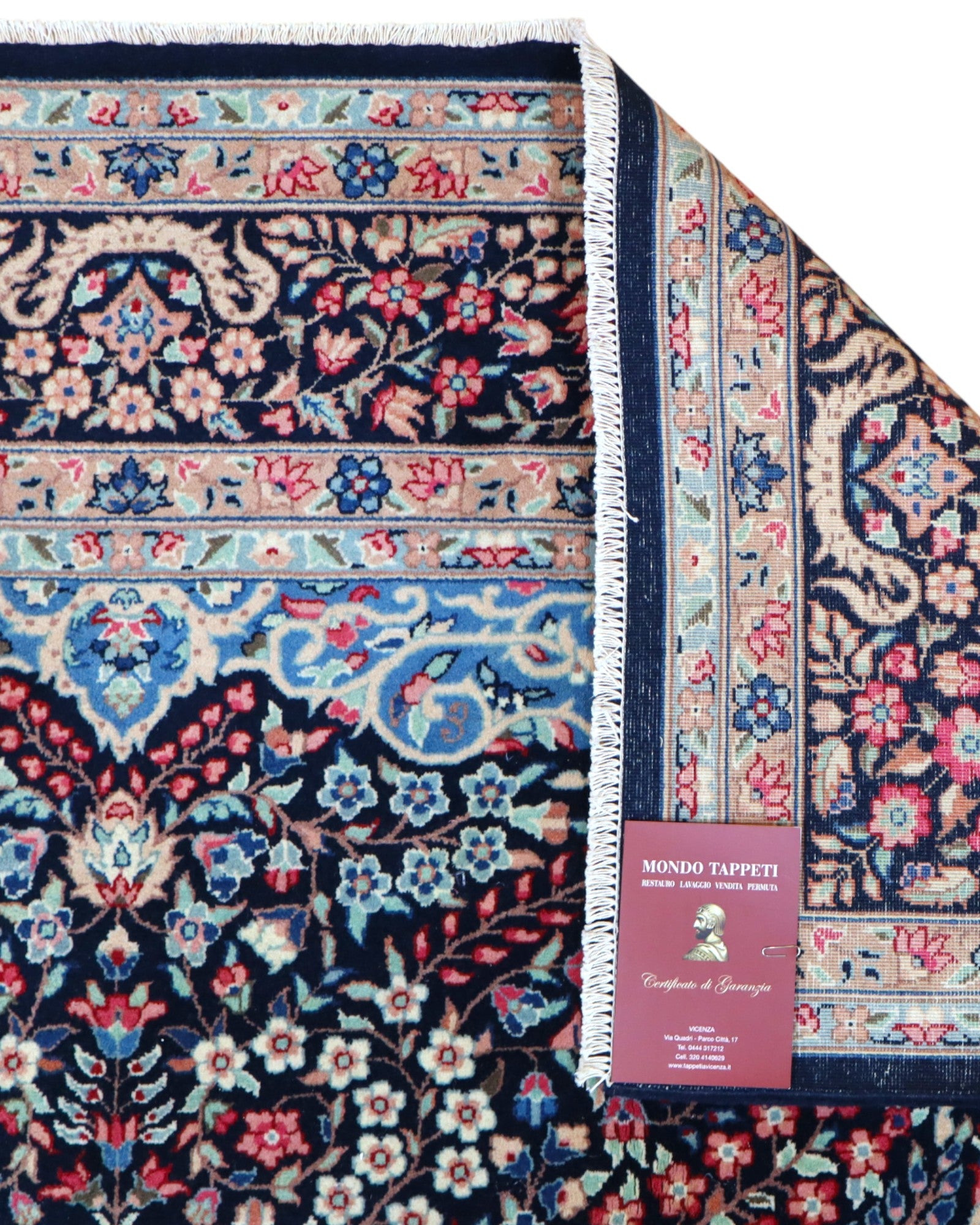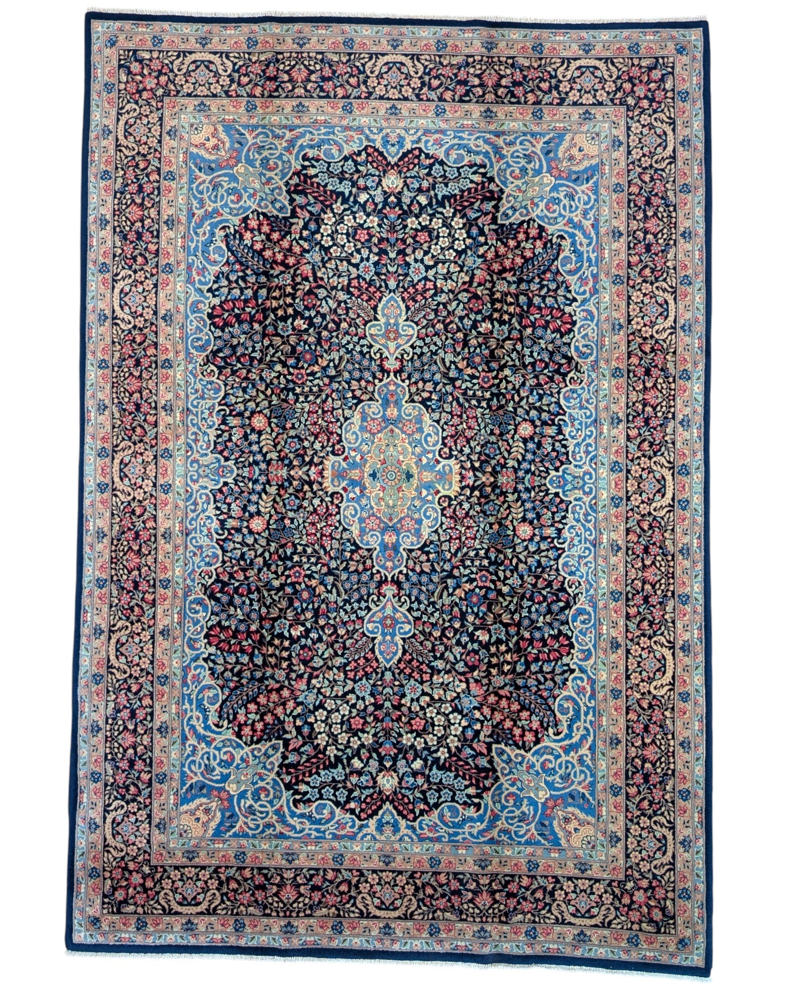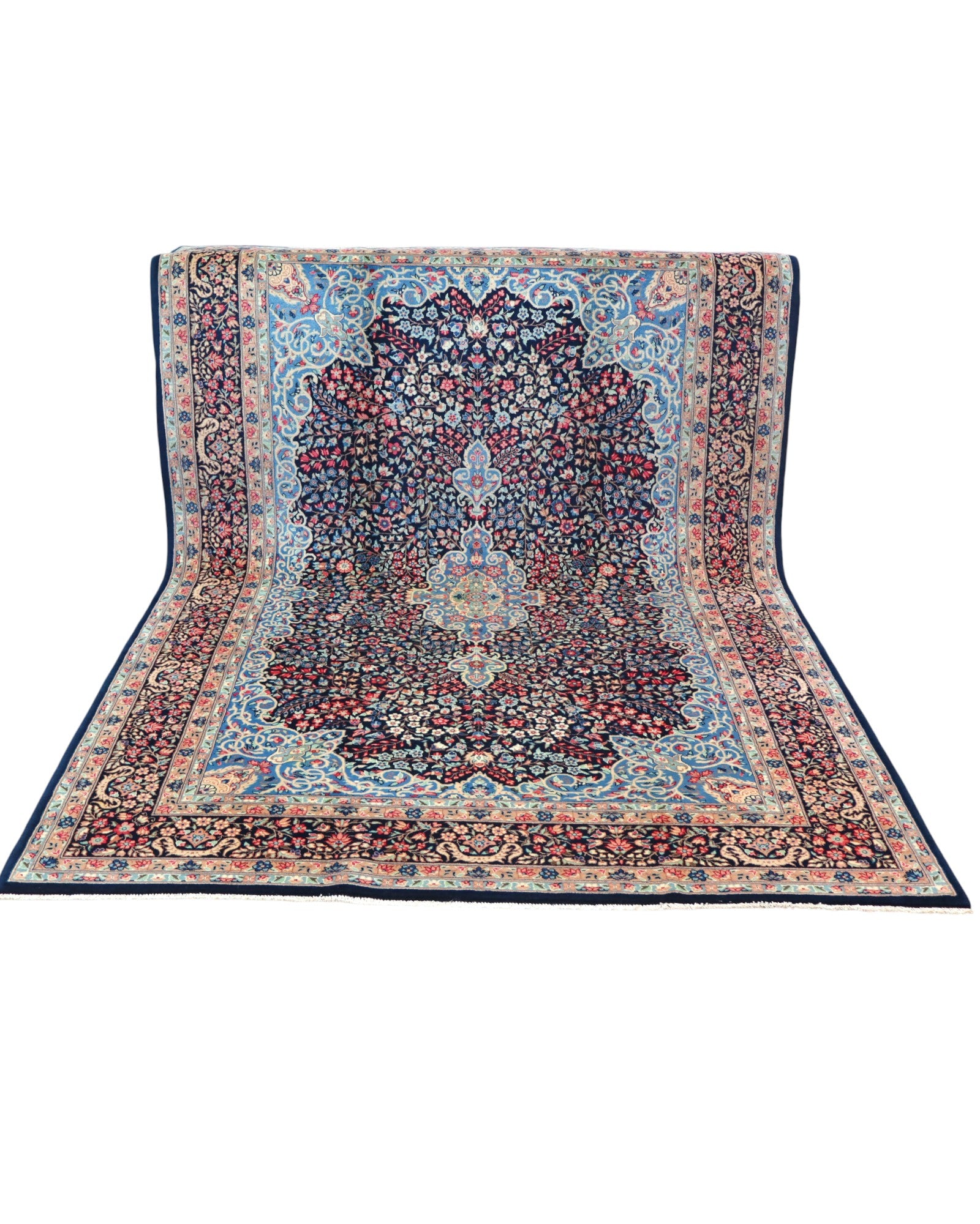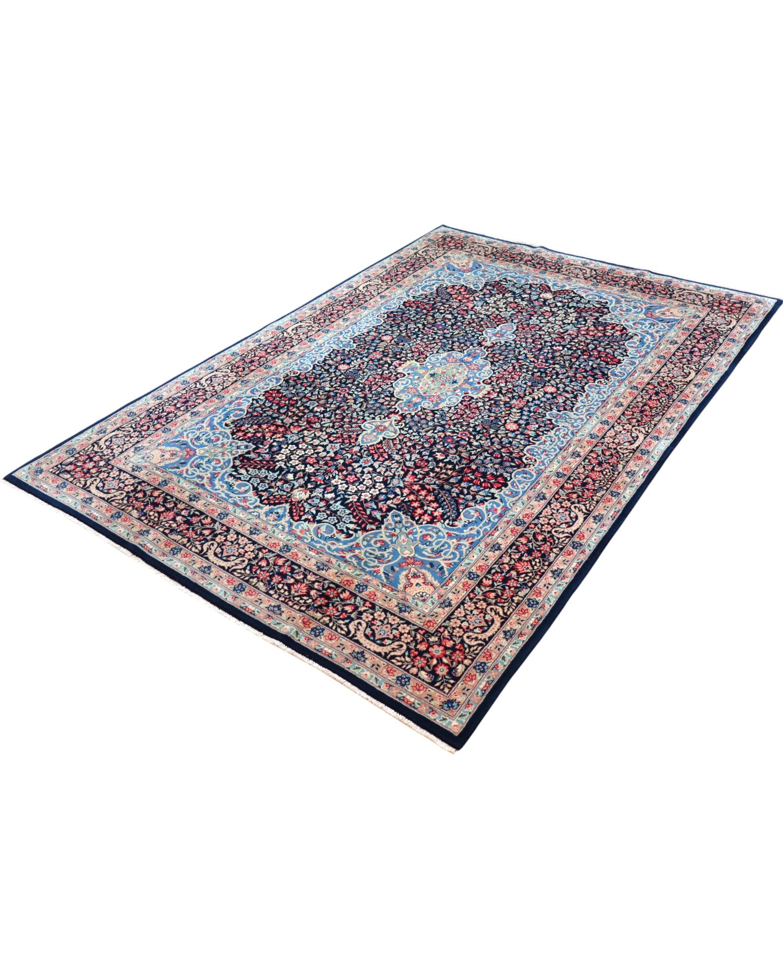 Il Tappeto Kerman è un capolavoro artigianale che rappresenta l'eleganza della tradizione persiana. Realizzato con vello in lana tinta con colori naturali e trama in cotone resistente, presenta un fondo blu profondo decorato con un ricco motivo floreale che si sviluppa con armonia in tonalità di rosso, blu e avorio. La lavorazione artigianale, eseguita a mano, garantisce la resistenza nel tempo e la bellezza del design. Con dimensioni di 280 x 189 cm, questo tappeto è ideale per ambienti ampi e sofisticati, aggiungendo un tocco di lusso e raffinatezza a qualsiasi stanza.