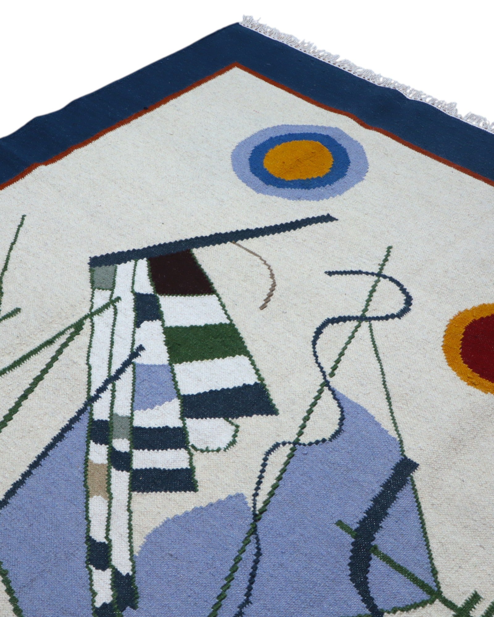 Un tappeto unico che unisce tradizione artigianale e creatività contemporanea, perfetto per interni moderni e spazi di design.