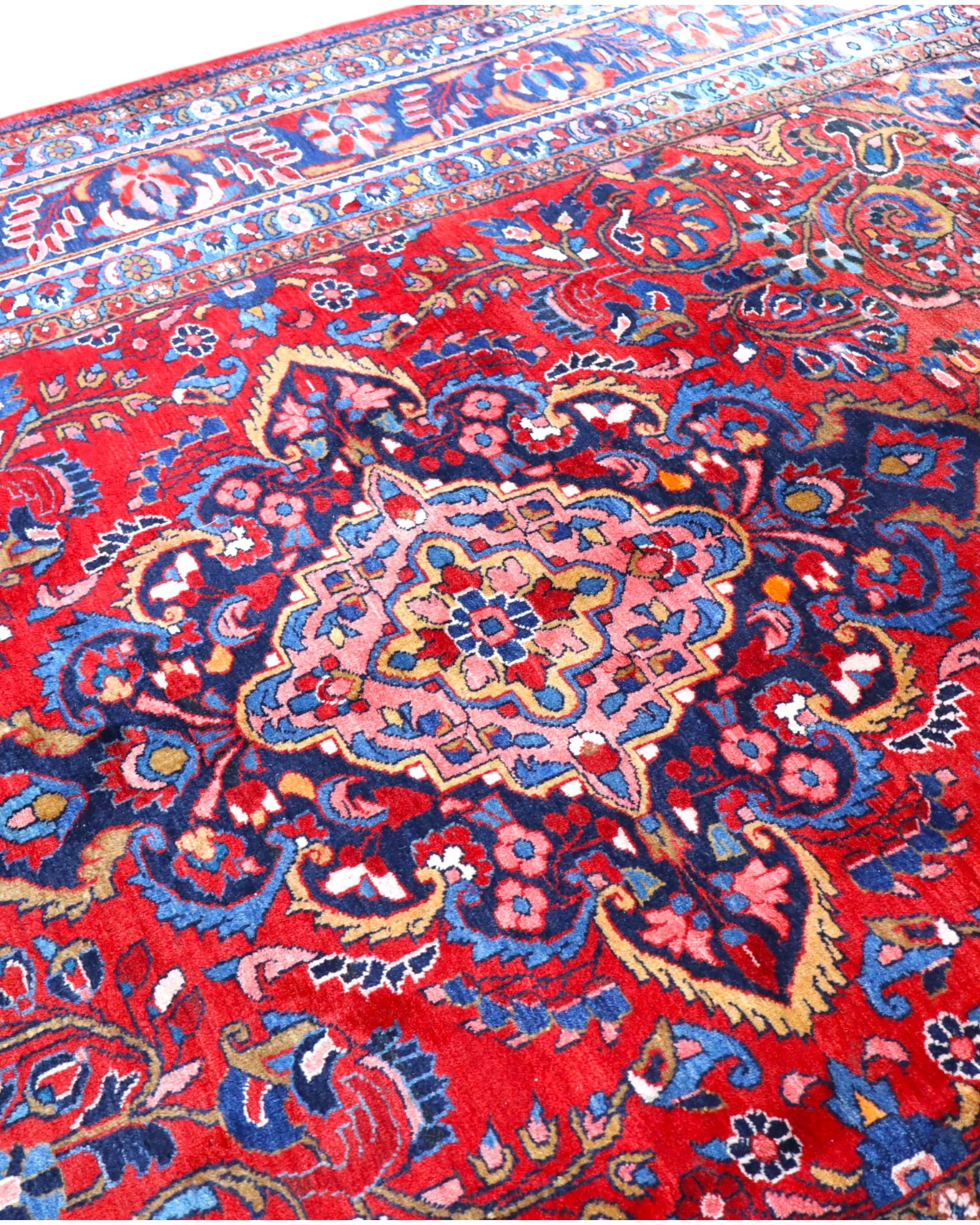Un autentico tappeto Lilian, annodato a mano con maestria e caratterizzato dal tipico stile floreale persiano. Il fondo rosso intenso esalta l’eleganza del medaglione centrale, riccamente decorato nei toni blu, avorio e rosa, mentre i motivi floreali si diffondono con armonia su tutta la superficie.
