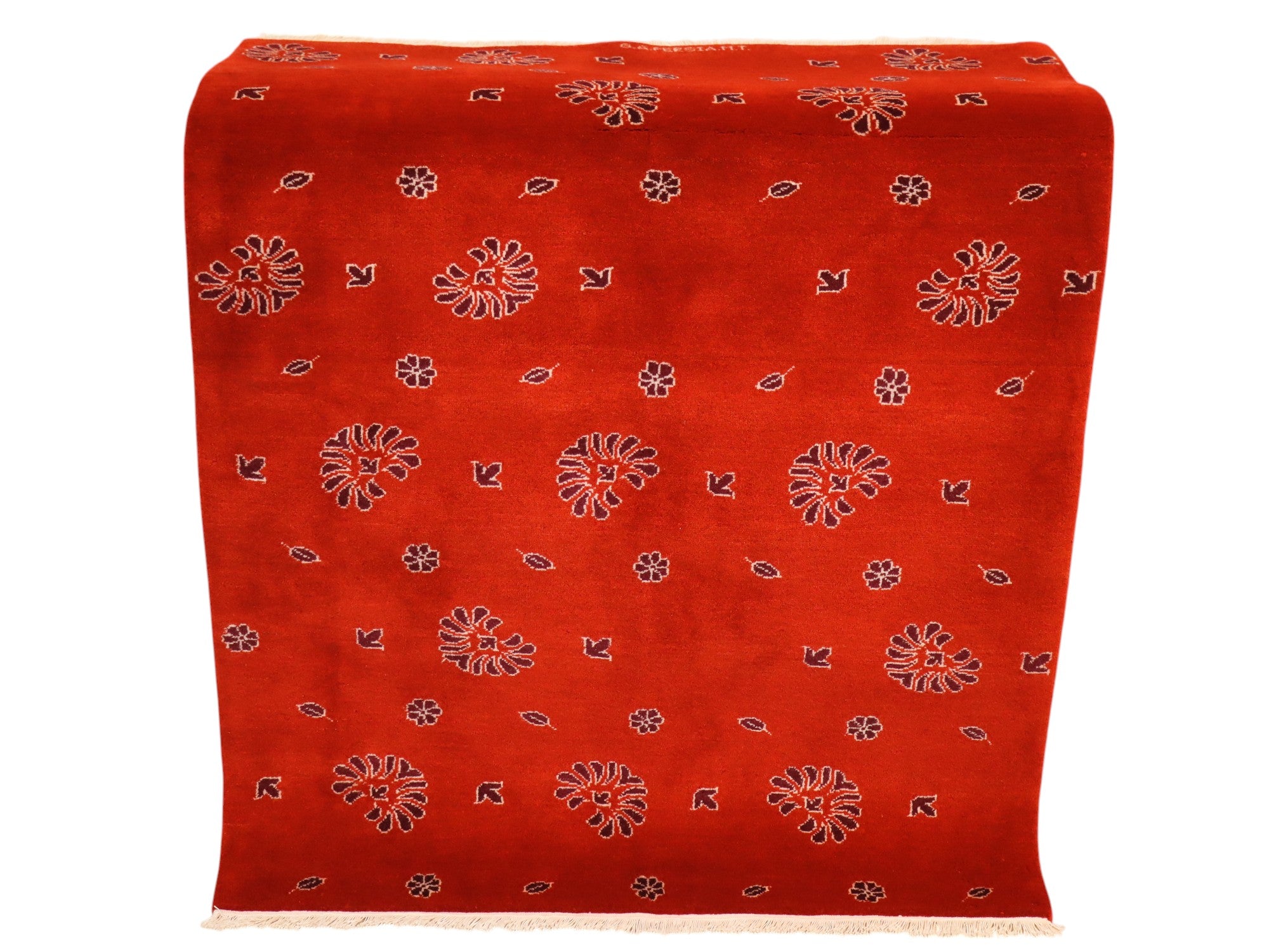 Il Tappeto Moderno 148x107 cm è un elegante pezzo artigianale dal carattere contemporaneo. Il suo fondo rosso intenso è vivacizzato da motivi floreali stilizzati che si ripetono con un ritmo armonico, creando un effetto visivo moderno ma al tempo stesso caldo e accogliente.