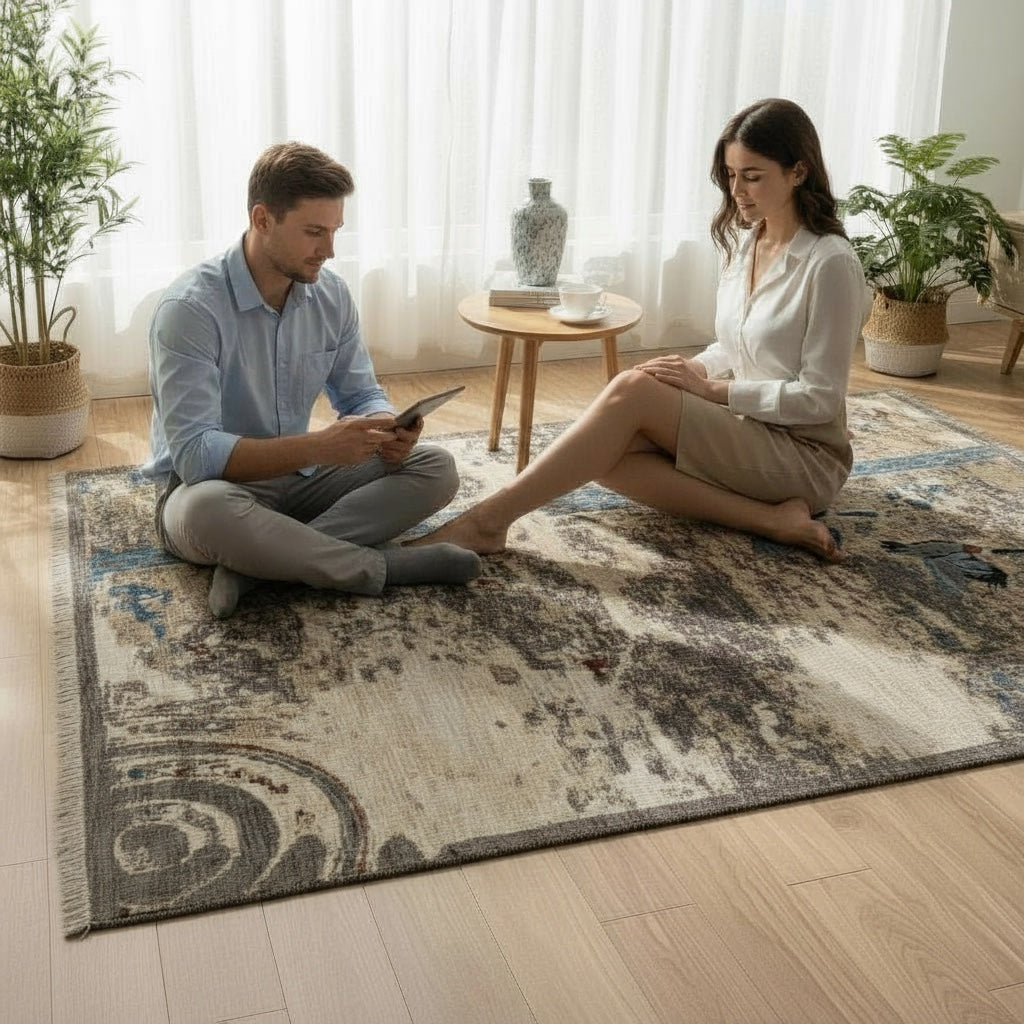 Il design presenta un fondo prevalentemente beige con sfumature che richiamano la terra, sul quale spiccano motivi di anatre in volo e suggestivi richiami alla natura. Questi dettagli creano un effetto visivo dinamico e poetico, conferendo al tappeto un carattere deciso e moderno.