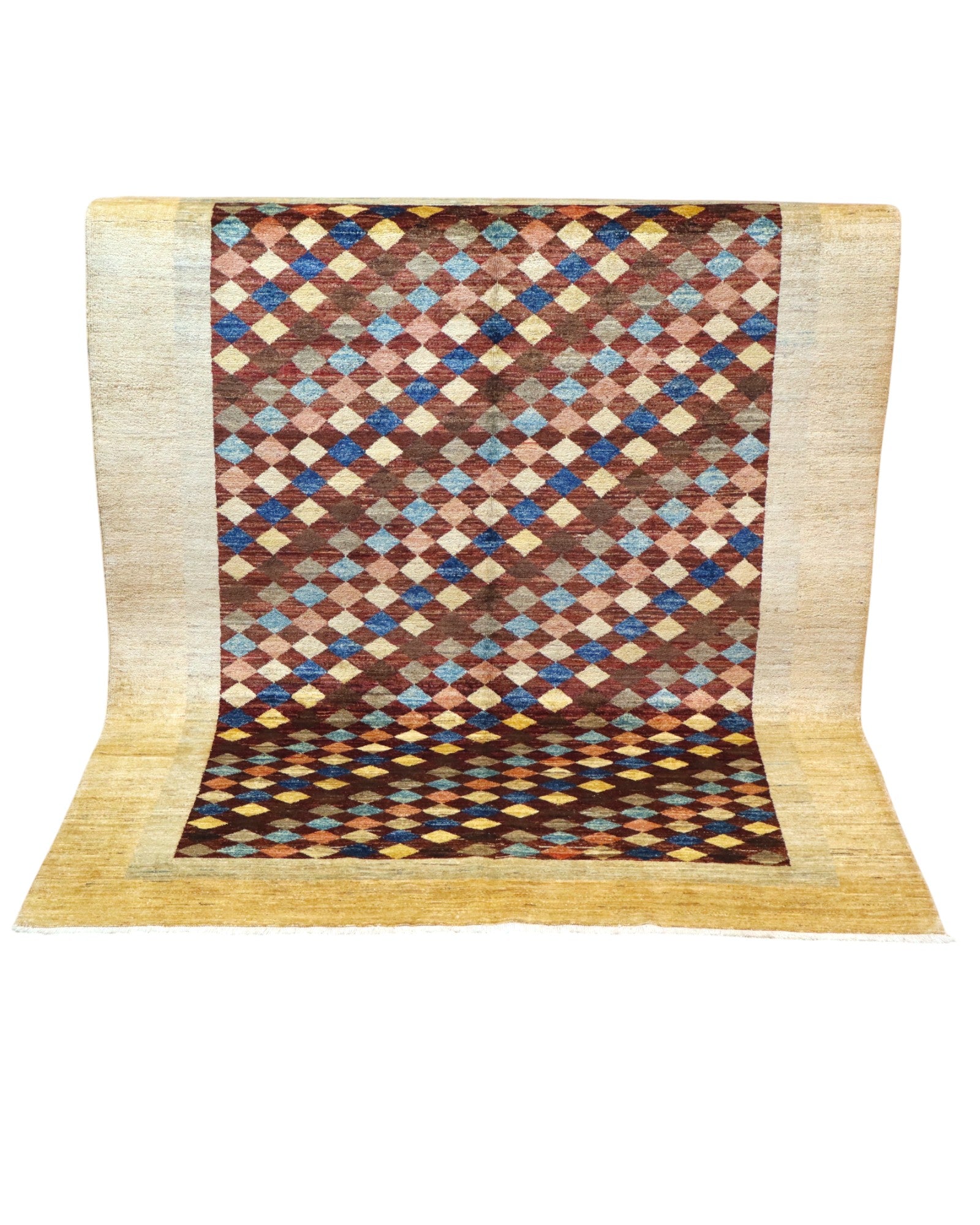 Questo tappeto moderno Gabbhe è un vero e proprio capolavoro di arte e tradizione. Annodato a mano su telaio tradizionale con trama e ordito in cotone resistente e vello in pura lana tinta con colori vegetali, questa creazione di 197 x 149 cm emana un fascino unico e una qualità superiore.