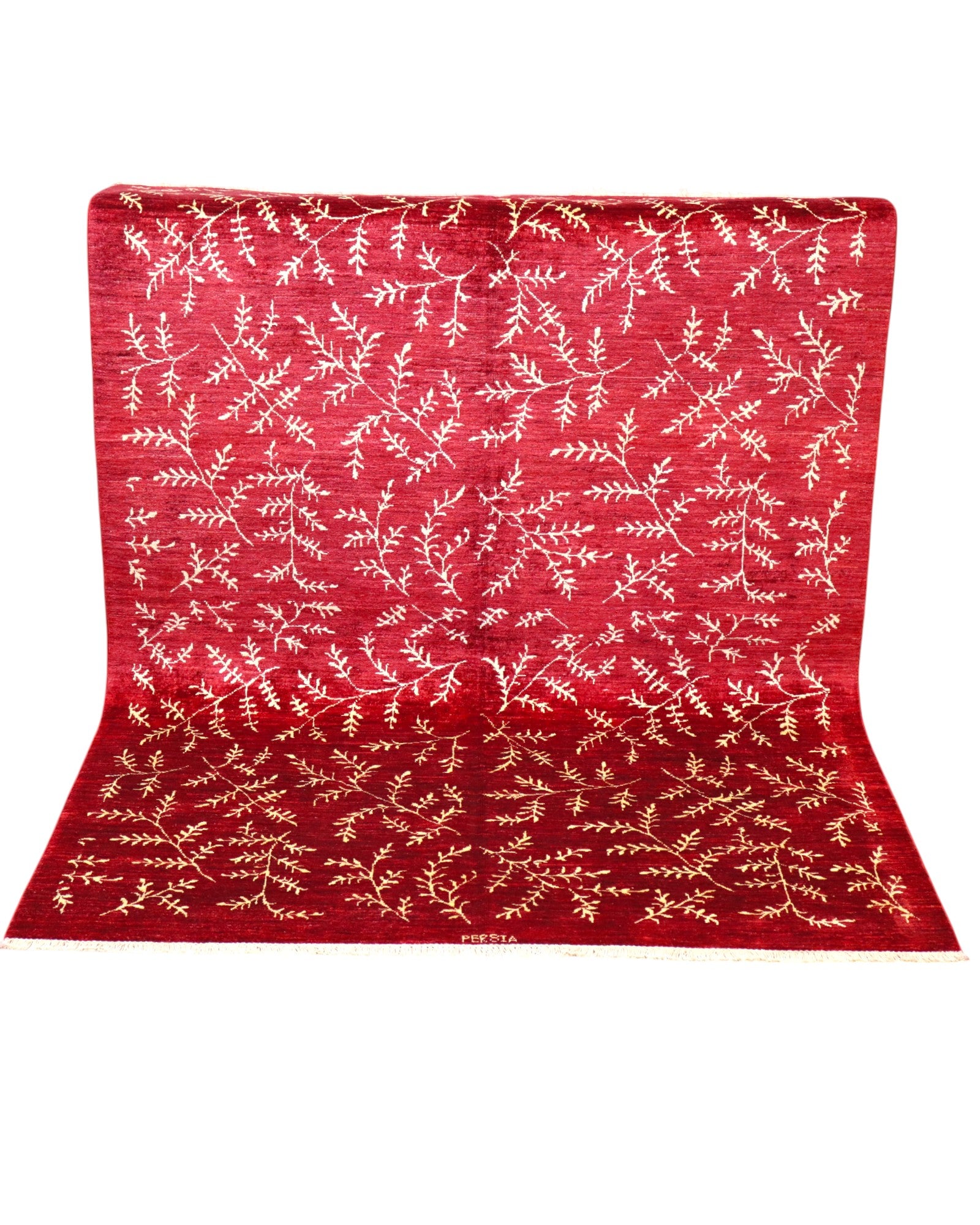 Il design raffigura una fitta trama di rami stilizzati in beige, che si stagliano sul fondo rosso intenso. Le linee delicate e i colori naturali creano un effetto visivo elegante e raffinato.