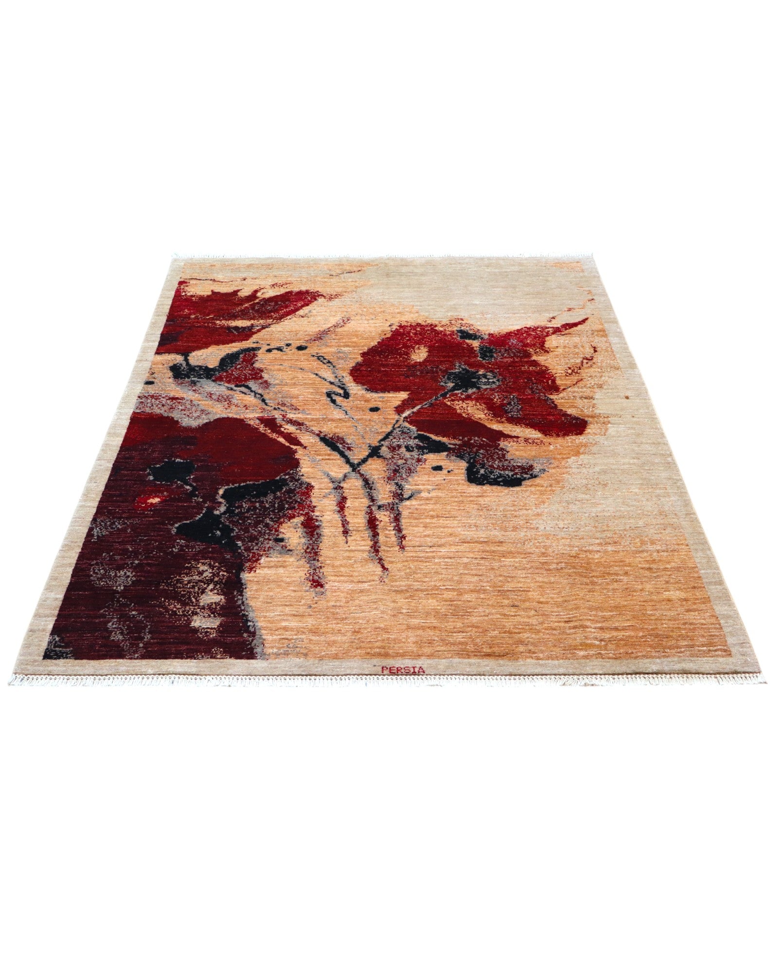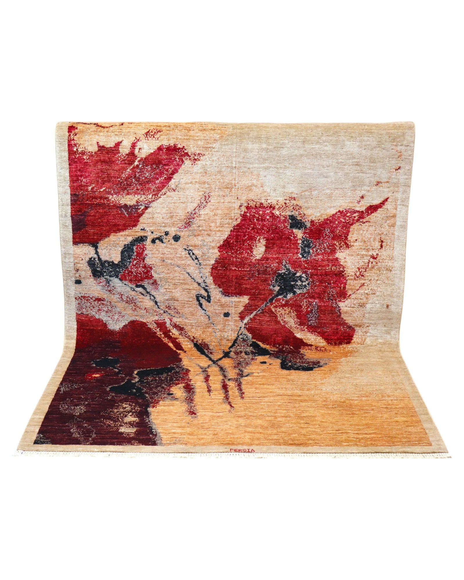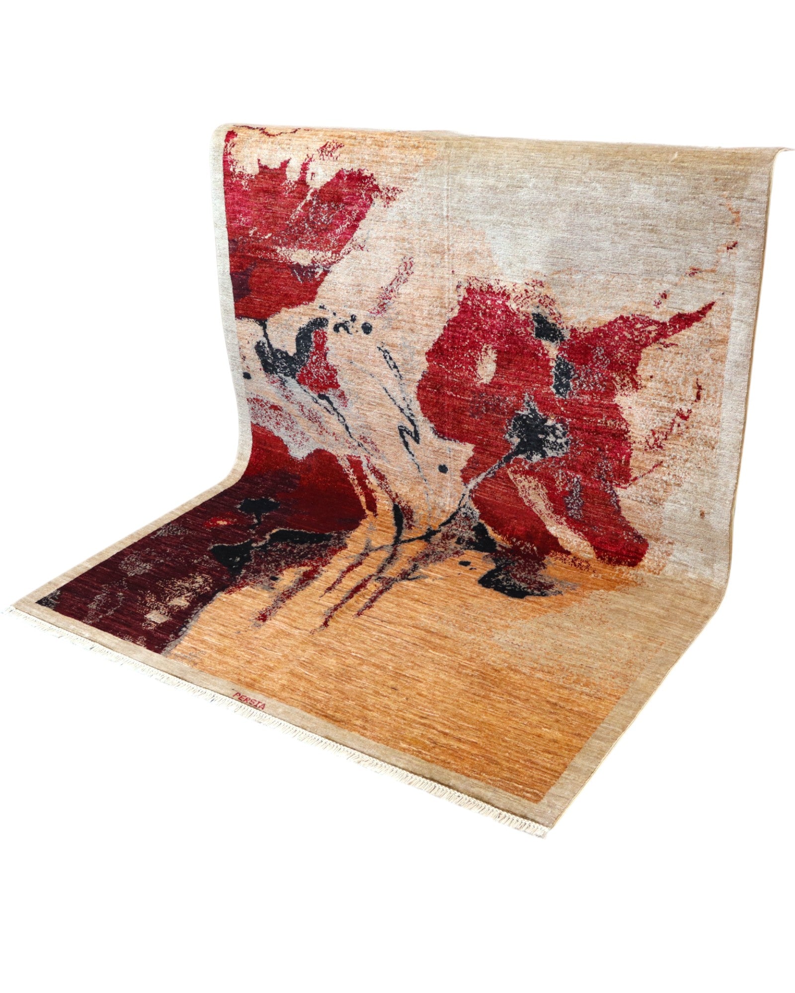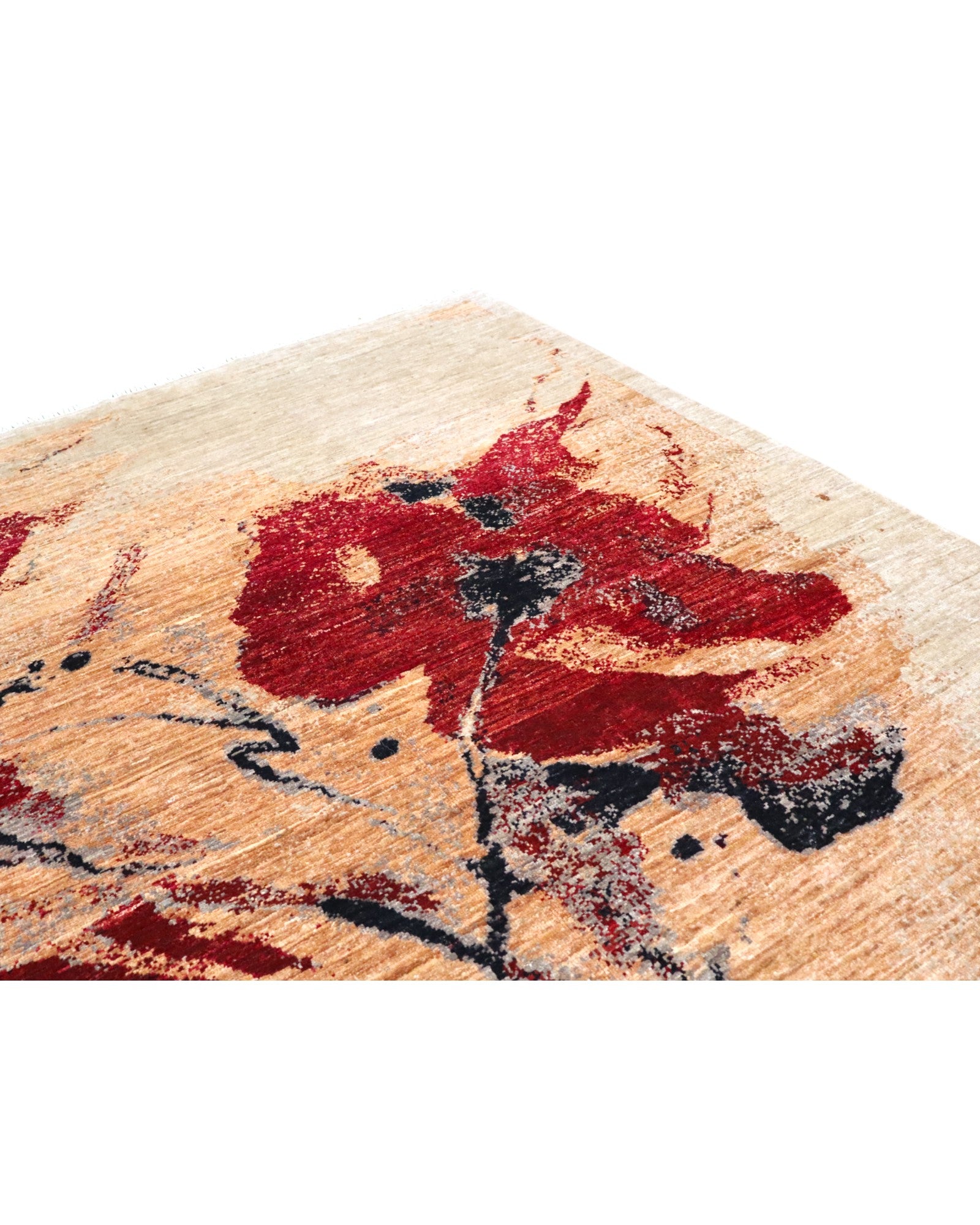 Il design raffigura un papavero stilizzato, che sembra ondeggiare nel vento come una ballerina con un vestito rosso. I colori caldi del rosso e del beige si fondono con il nero intenso, creando un effetto visivo dinamico e suggestivo. Le pennellate decise e i tratti fluidi conferiscono al tappeto un senso di movimento e vitalità.