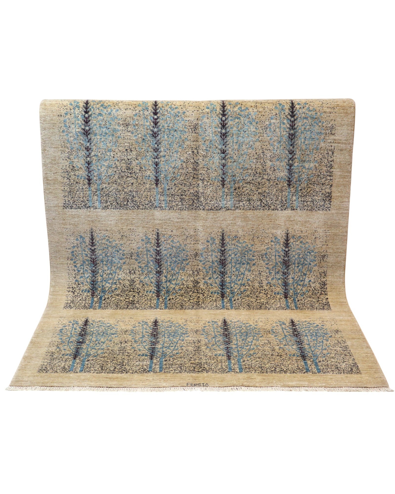 Questo tappeto moderno è un'opera d'arte unica, creata dall'artista Darios, che ha frequentato l'accademia d'arte, e realizzata a mano su telaio tradizionale da esperti artigiani persiani. Con trama e ordito in cotone resistente e vello in pura lana tinta con colori vegetali, questa creazione di 200 x 151 cm porta un tocco di natura e serenità nella tua casa.