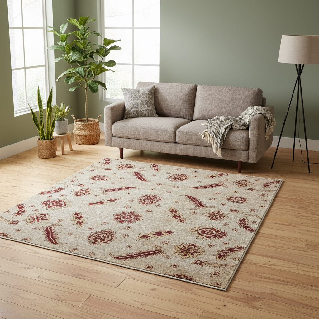 Design: Medaglione centrale floreale, campo beige, bordura floreale