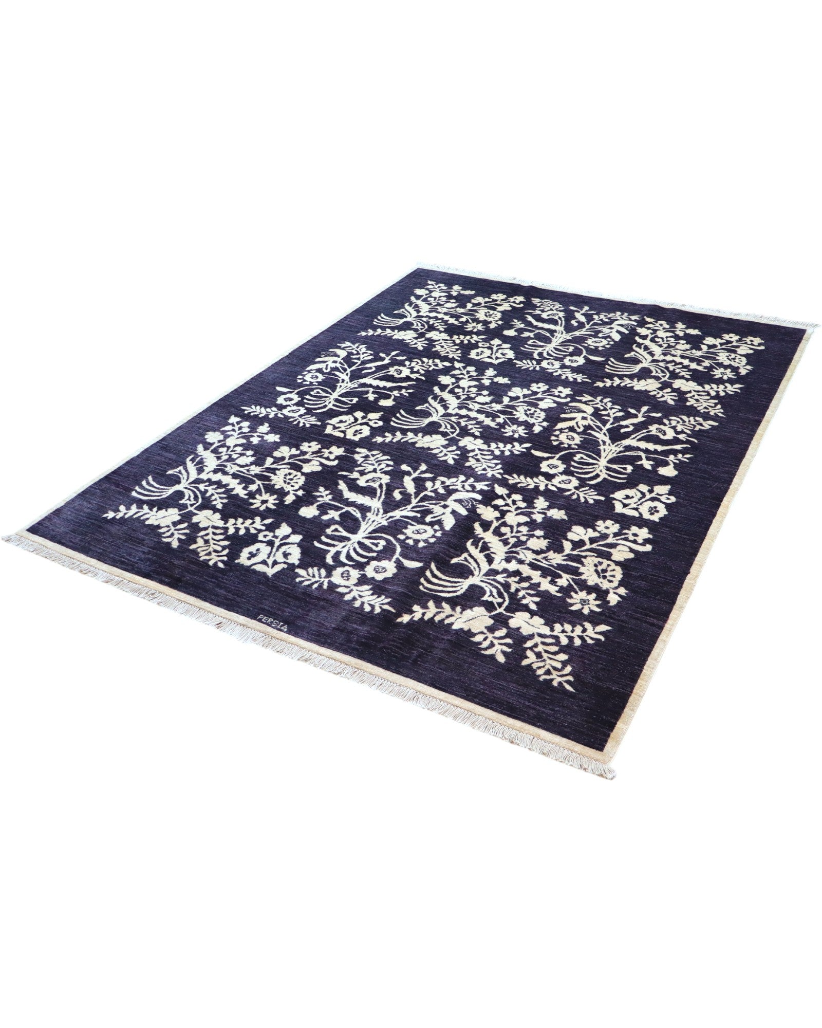 Il design presenta un elegante fondo blu intenso arricchito da motivi floreali stilizzati in avorio, disposti in riquadri regolari che creano un effetto armonioso e bilanciato. L’alternanza di colore tra lo sfondo scuro e i dettagli chiari conferisce luminosità e raffinatezza, rendendo il tappeto un complemento d’arredo di forte impatto visivo.