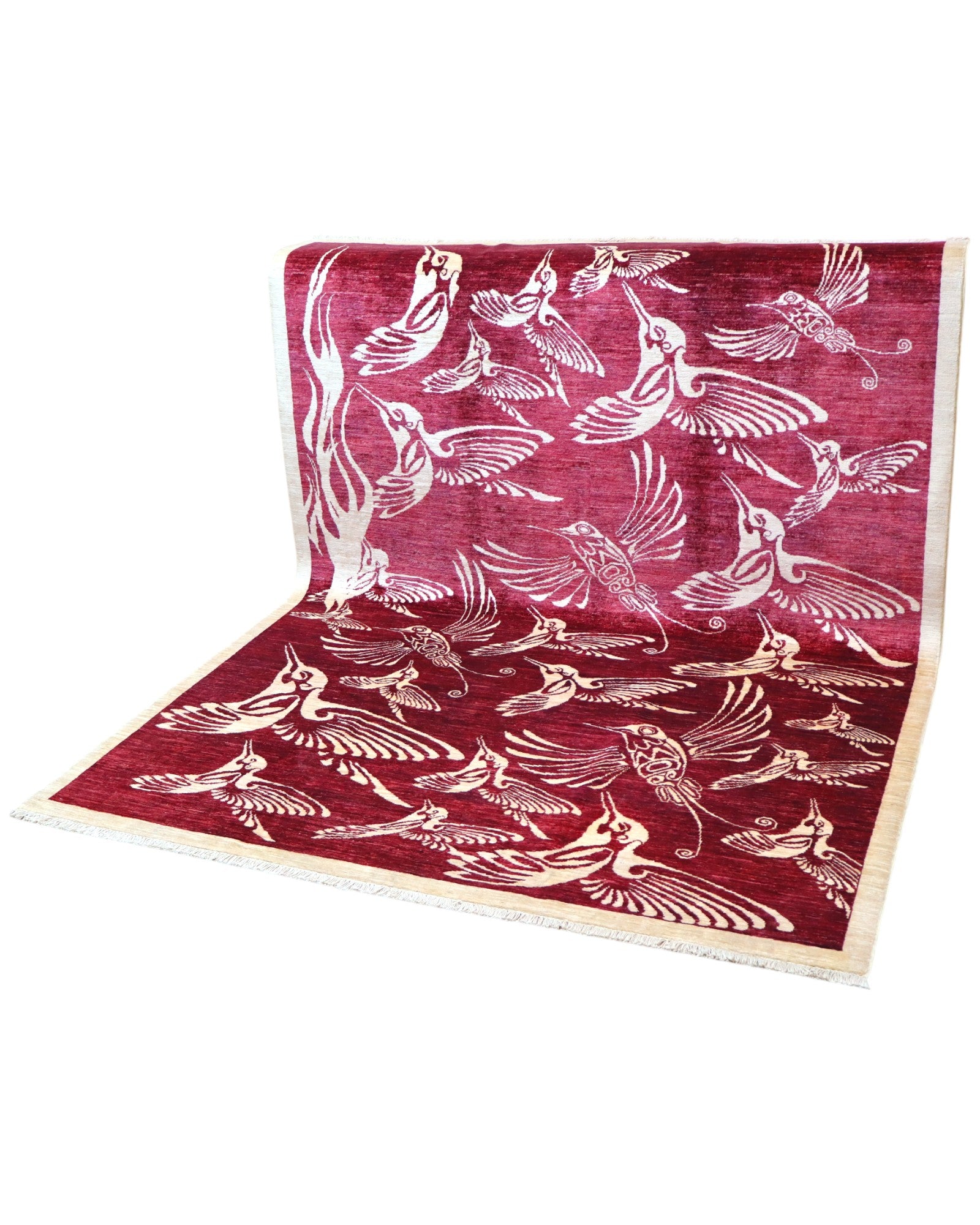 Il design è caratterizzato da un elegante fondo bordeaux animato da una serie di uccelli stilizzati in volo, rappresentati in avorio con linee fluide e dinamiche. La composizione crea un effetto visivo leggero e vibrante, capace di trasmettere energia e movimento agli ambienti in cui viene collocato.