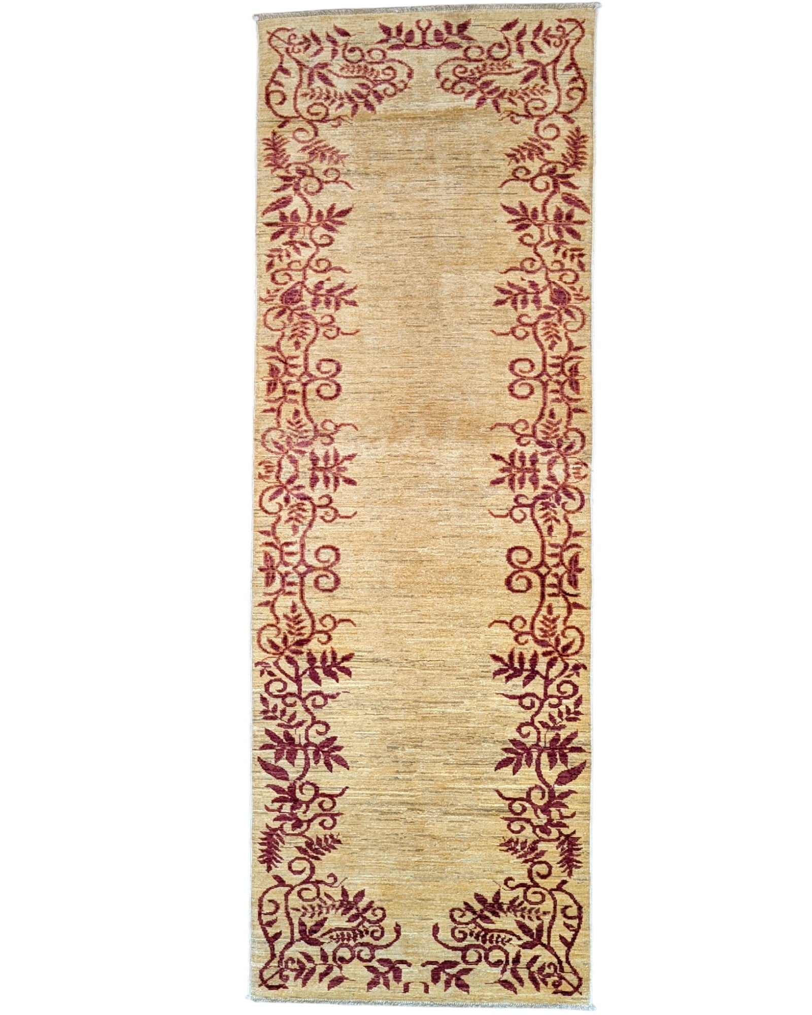 Il disegno si distingue per un fondo sfumato beige–miele su cui si sviluppano decorazioni floreali stilizzate rosse lungo i bordi, creando un contrasto sobrio e moderno. La semplicità centrale valorizza la geometria dello spazio, mentre i dettagli laterali donano movimento e personalità.
