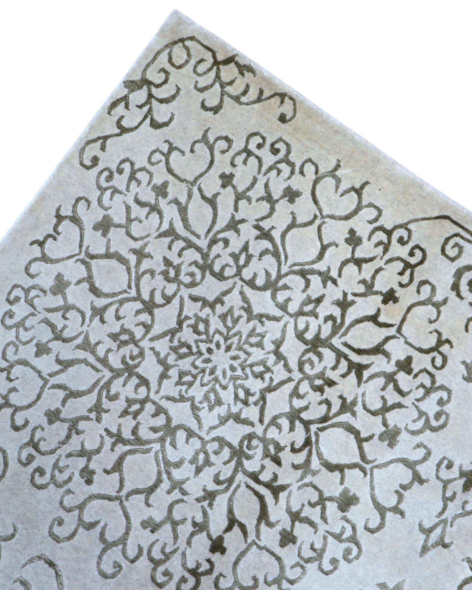 Il design si distingue per un elegante fondo beige arricchito da motivi ornamentali ton sur ton che creano un raffinato gioco di ombre e volumi. La simmetria e la delicatezza del disegno conferiscono al tappeto un aspetto lussuoso e senza tempo.