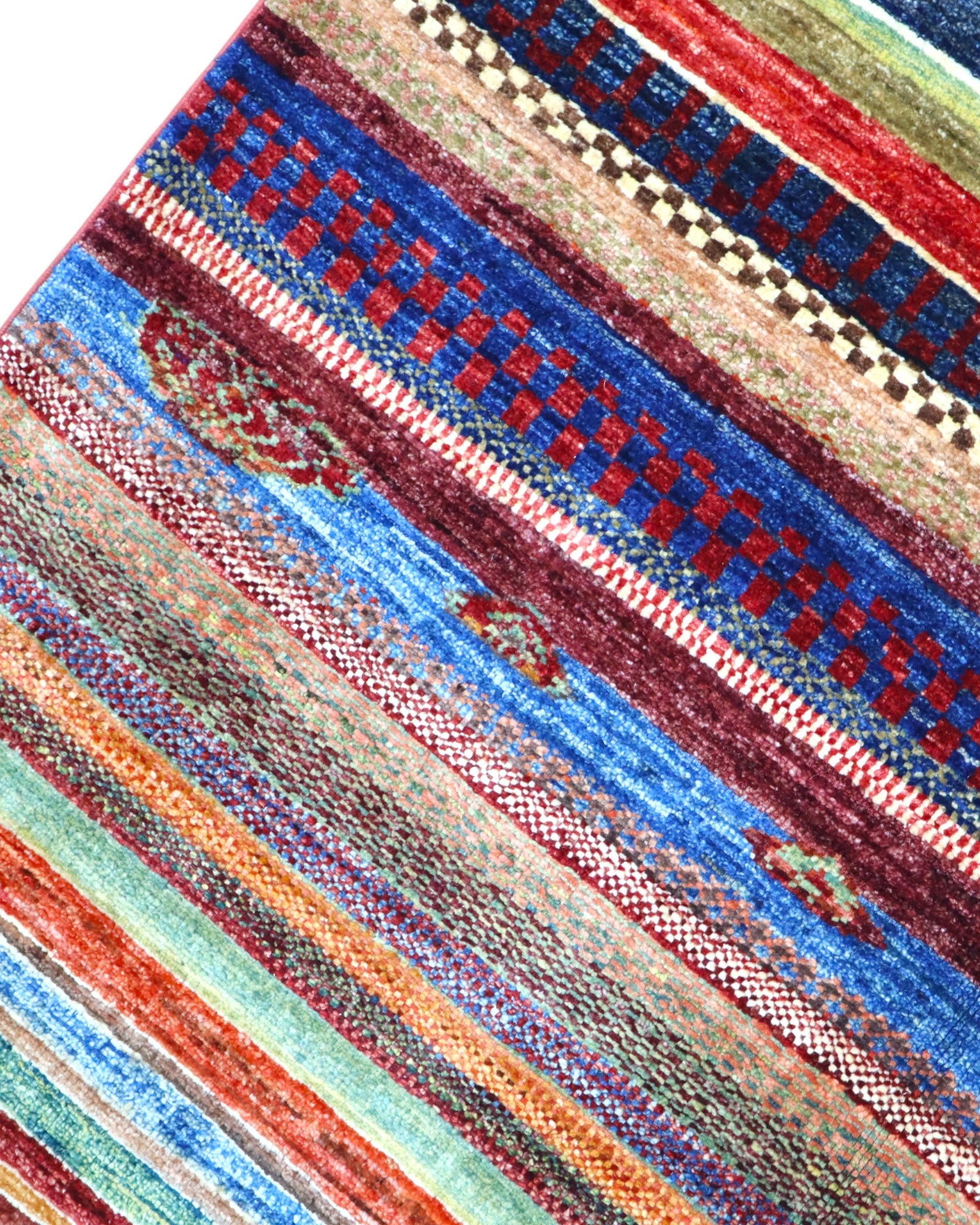 Questo tappeto moderno è un'autentica espressione di arte e design contemporaneo. Annodato a mano sul telaio tradizionale da esperti artigiani, con trama e ordito in cotone resistente e vello in pura lana tinta con colori vegetali. Questa creazione di 240 x 186 cm si rivela un esemplare di notevole bellezza e squisita fattura. Il design si distingue per un vibrante motivo a strisce multicolore, che si snodano con armonia su tutta la superficie, creando un effetto visivo dinamico e accattivante. La ricchezza dei colori vivaci conferisce al tappeto un'eleganza intrinseca e una magnificenza che non passa inosservata, portando energia e carattere in qualsiasi ambiente. Un elemento di design che infonderà nel vostro ambiente un'atmosfera di fascino e un'eleganza che non conosce tempo.