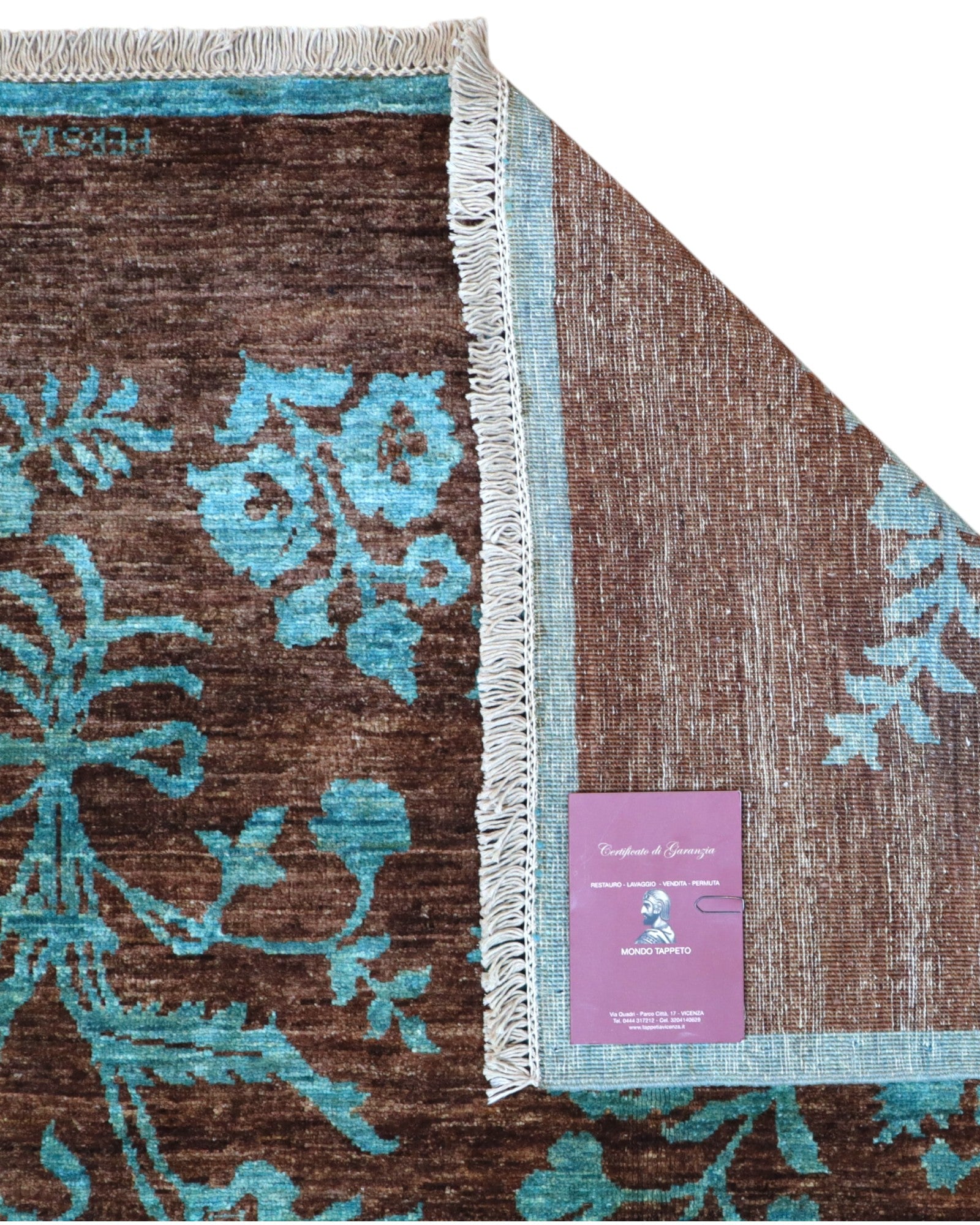 Il design presenta un raffinato fondo marrone impreziosito da motivi floreali turchesi disposti in riquadri ordinati. L’elegante contrasto cromatico tra lo sfondo caldo e i dettagli vivaci dona luminosità e freschezza alla composizione.