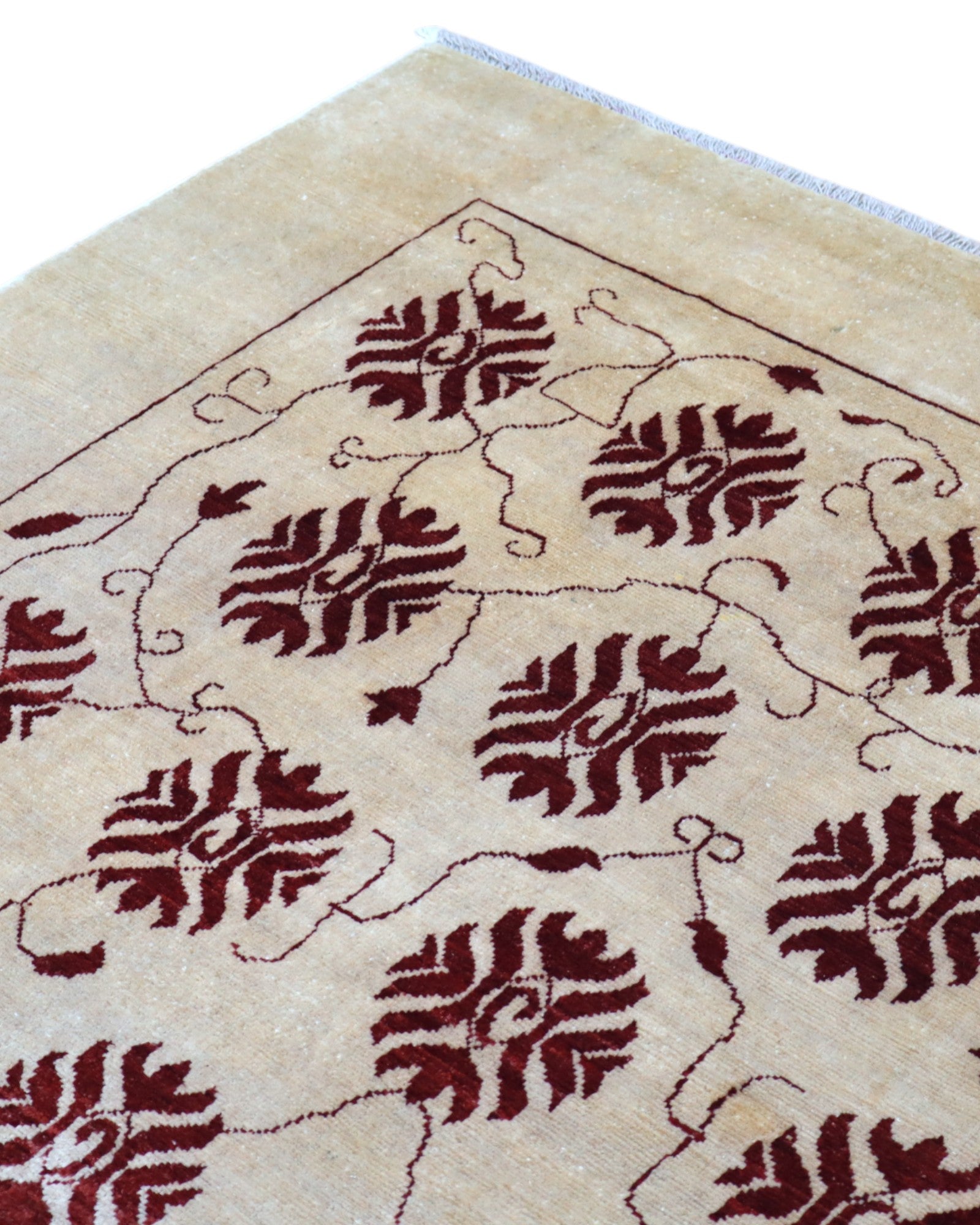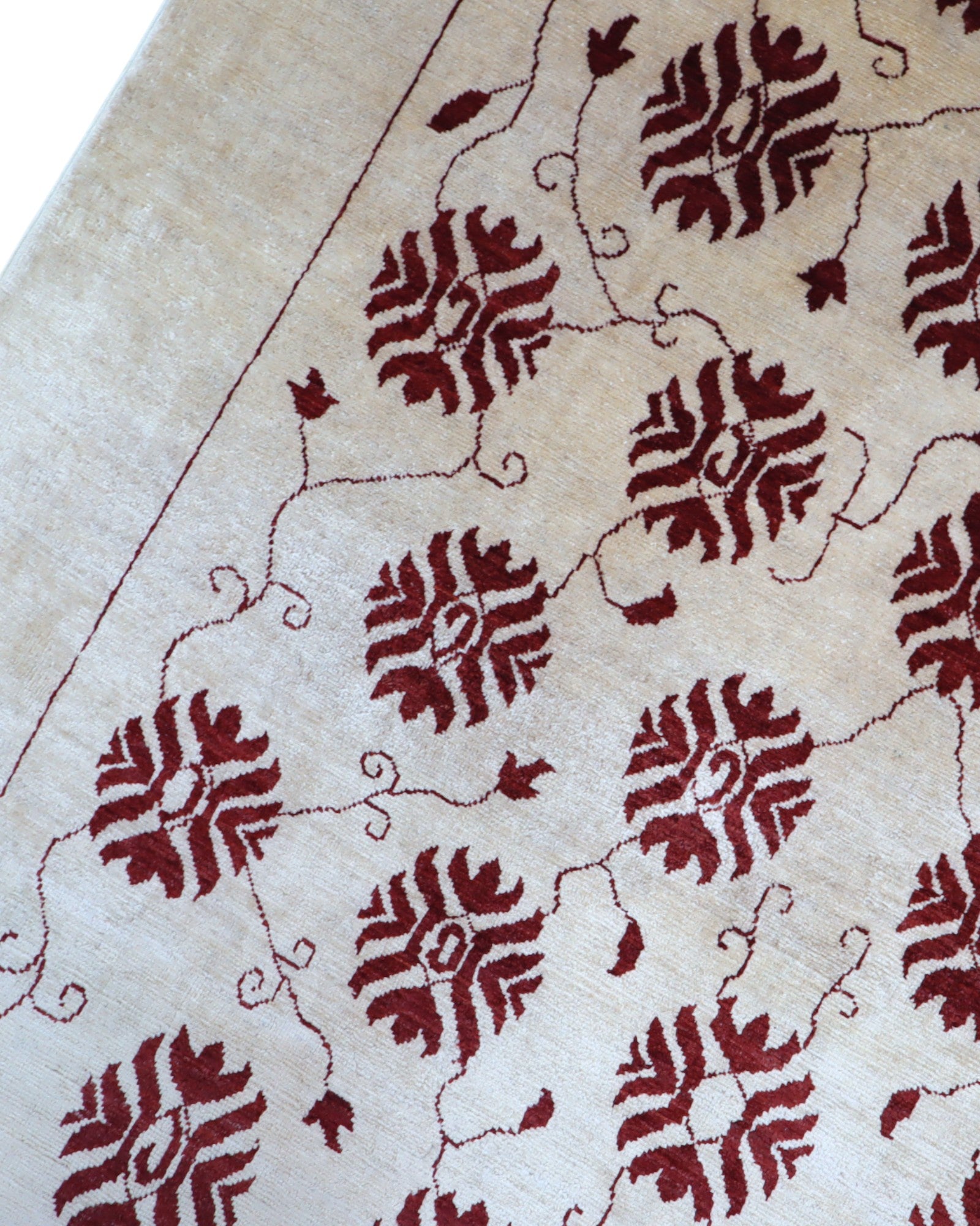 Il design si distingue per il raffinato fondo avorio, su cui si ripetono motivi floreali stilizzati in rosso scuro, creando un ritmo elegante e armonioso. L’essenzialità cromatica unita alla raffinatezza del disegno rende questo tappeto un complemento versatile e di grande classe.