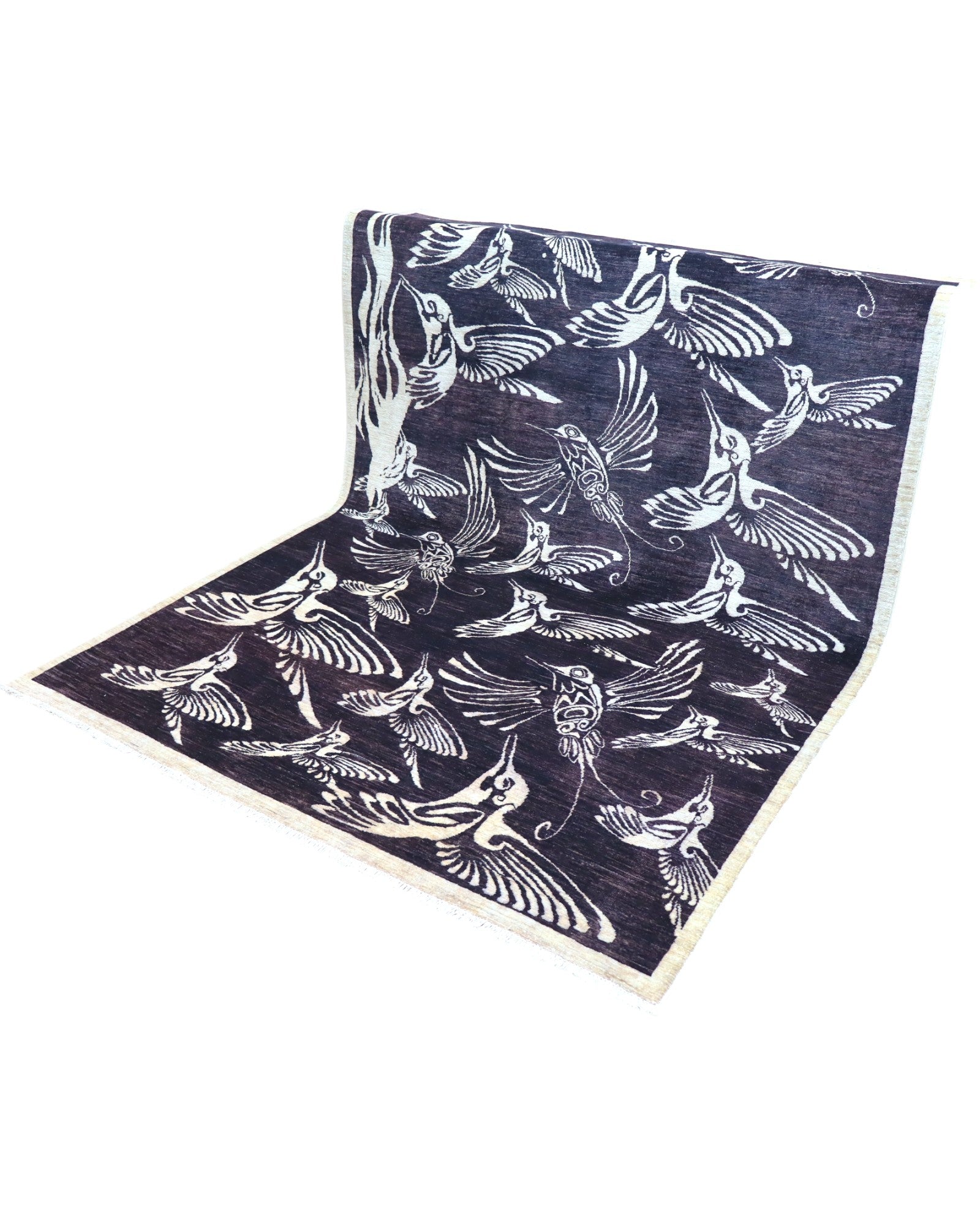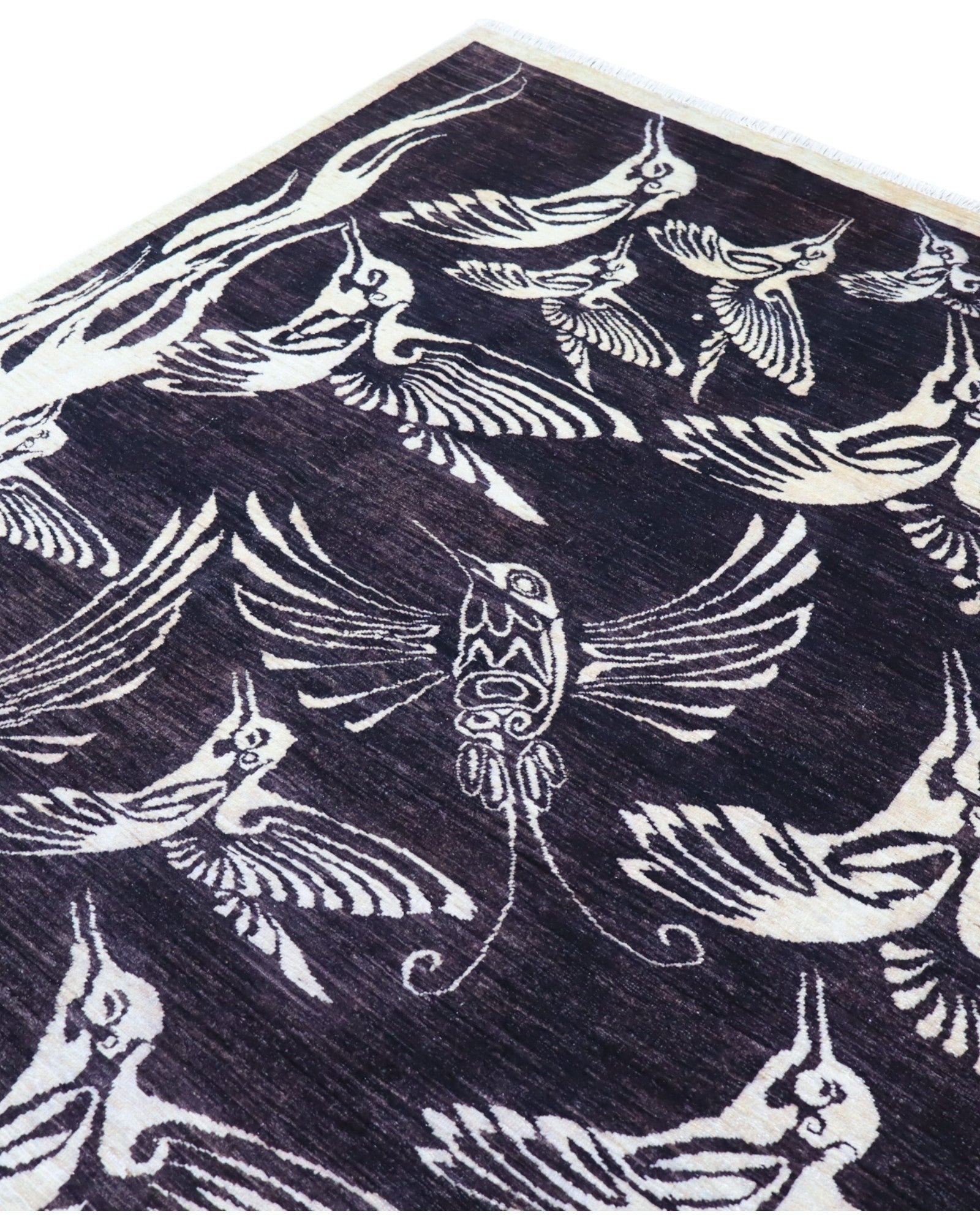 Un tappeto moderno dal forte impatto visivo, decorato con un elegante stormo di uccelli stilizzati che anima l’intera superficie con un movimento fluido e armonioso. Il contrasto tra il fondo nero antracite e le figure avorio crea un effetto grafico di grande raffinatezza, perfetto per ambienti contemporanei che cercano un pezzo d’arte tessile capace di attirare lo sguardo.