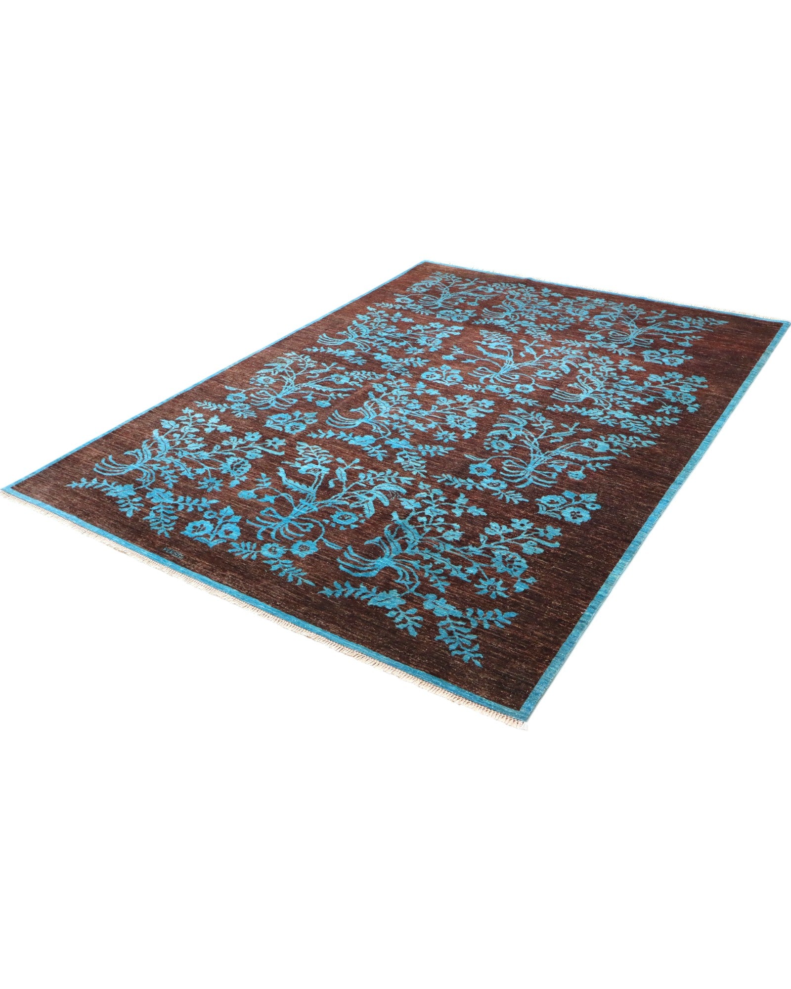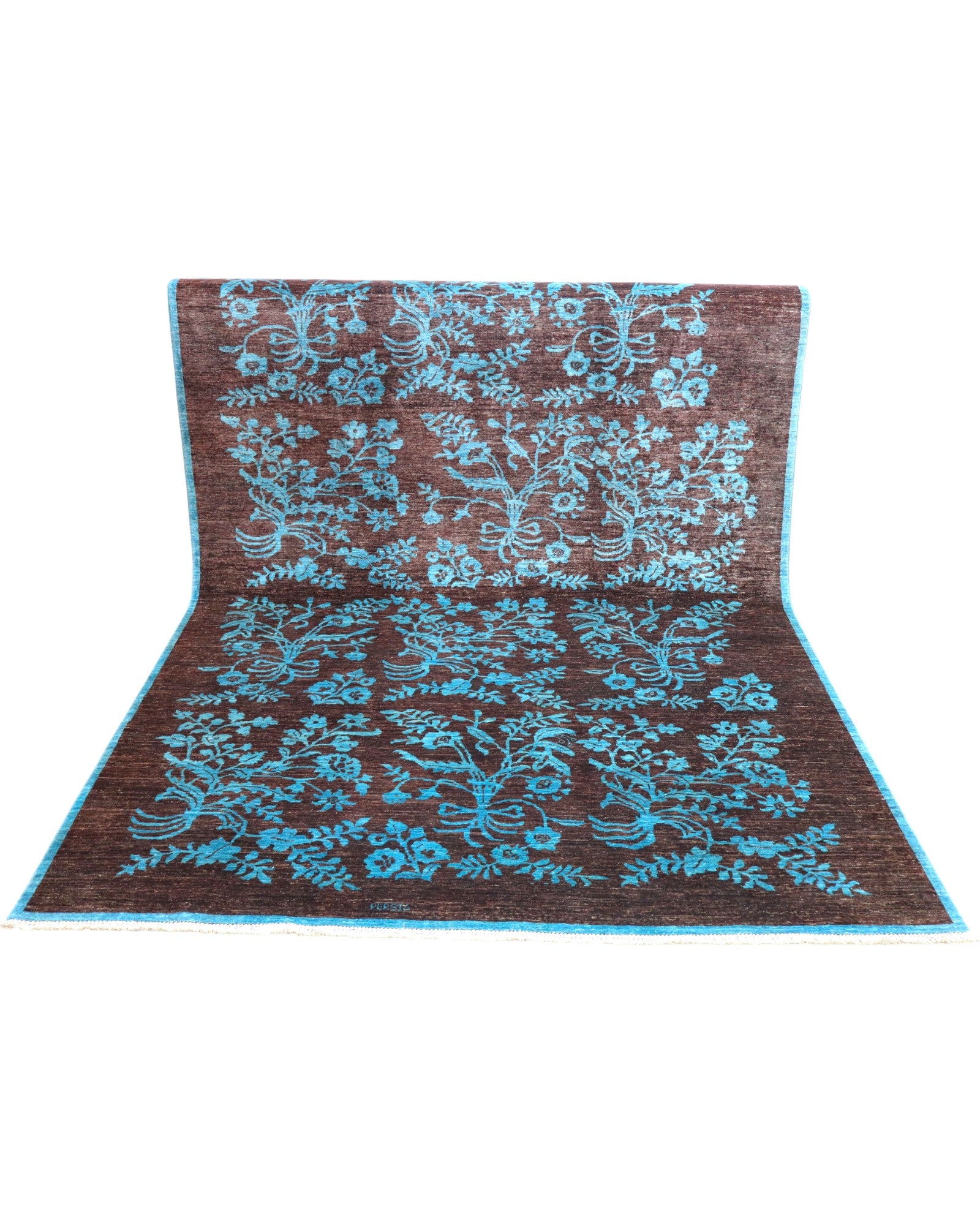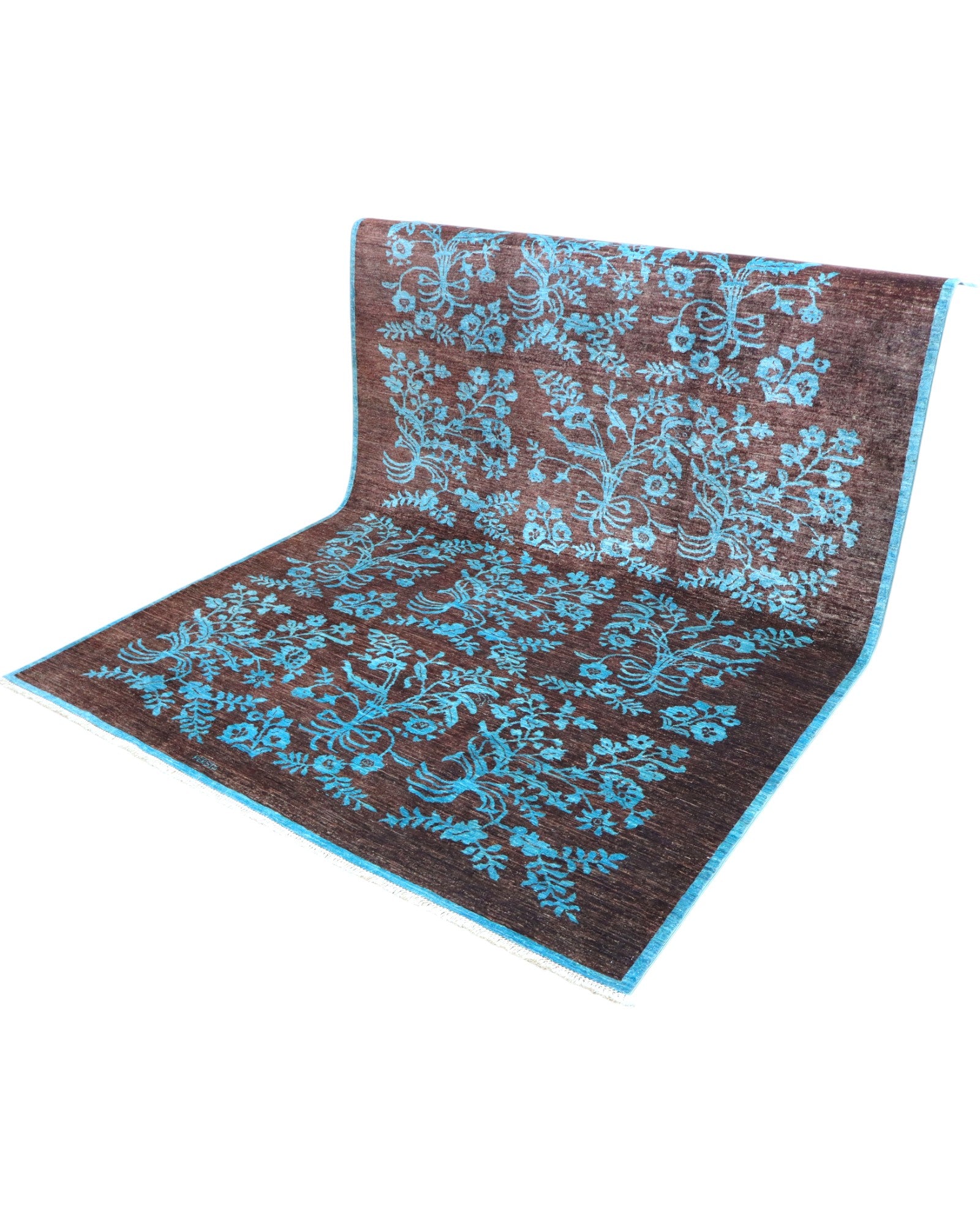 Un tappeto moderno dal fascino elegante e decorativo, caratterizzato da un raffinato motivo floreale ripetuto che si distribuisce sull’intera superficie come un giardino stilizzato. Il contrasto tra il fondo marrone scuro e i fiori turchesi crea un effetto visivo luminoso e armonioso, ideale per chi desidera dare personalità a un ambiente senza eccedere nei colori.