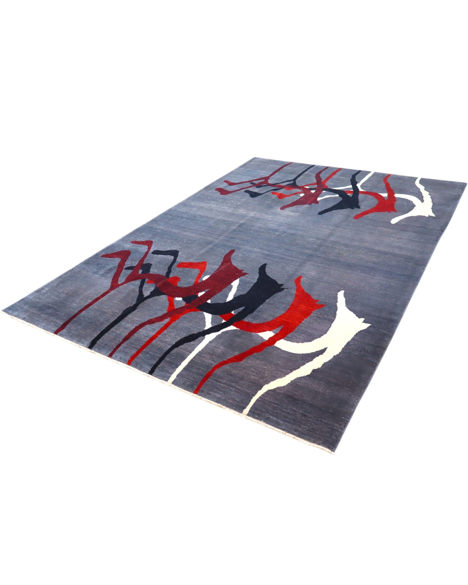 Il design presenta un fondo grigio neutro arricchito da motivi astratti disposti in alto e in basso, con figure stilizzate in rosso, nero e avorio che creano un contrasto dinamico e moderno. La composizione dona movimento e carattere, rendendo il tappeto un’opera unica e di grande impatto visivo.