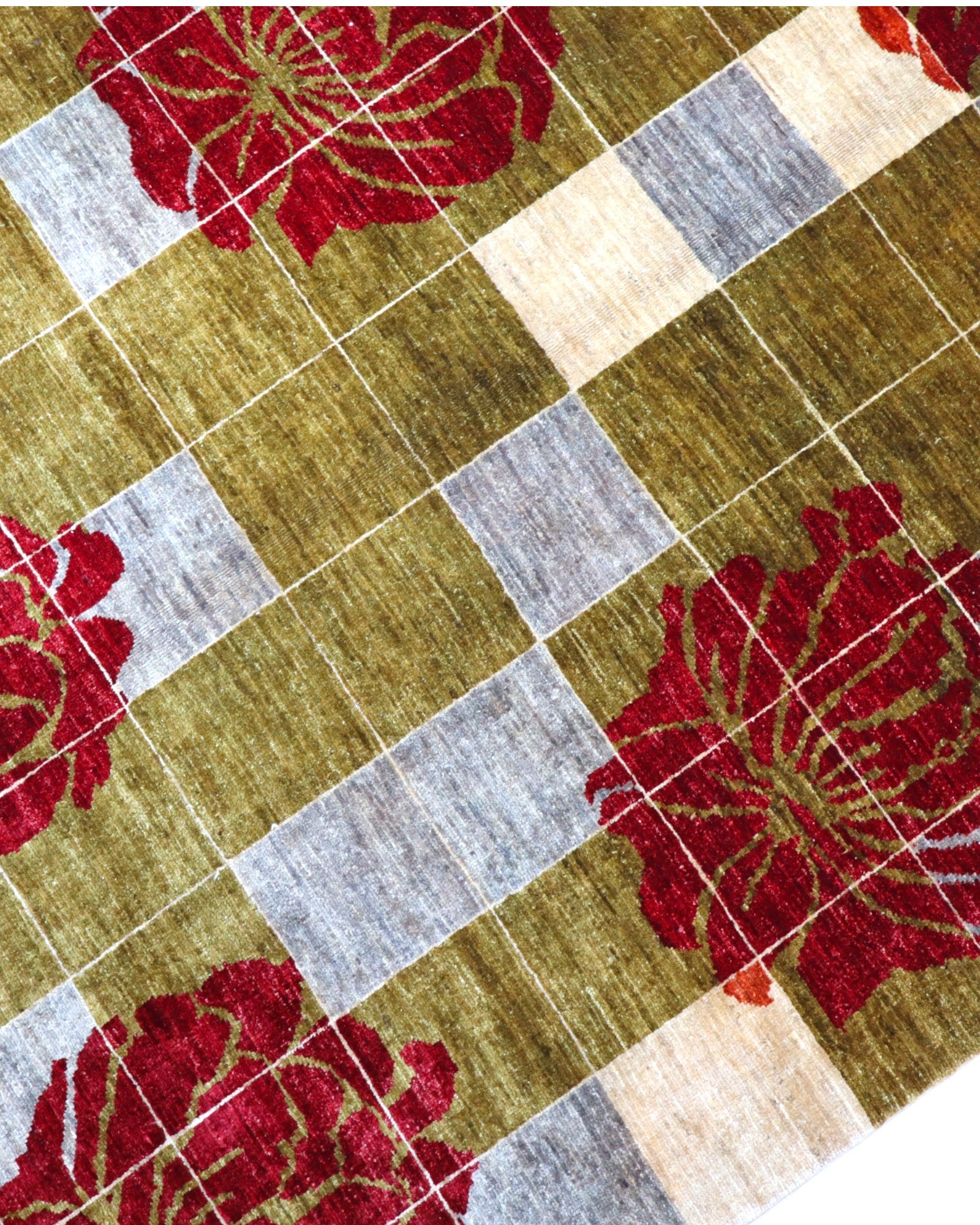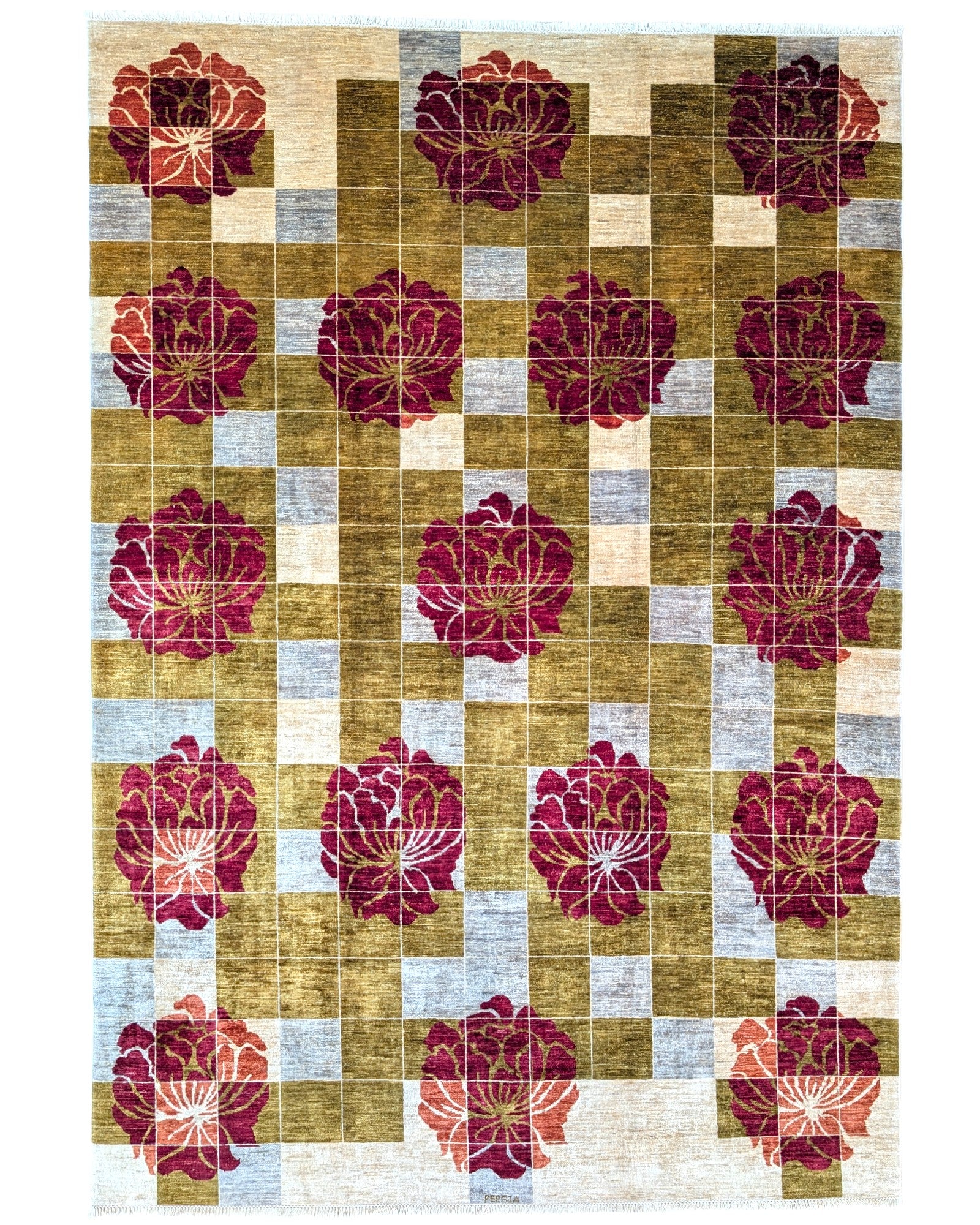 Il Tappeto Moderno 295 x 206 cm presenta un design contemporaneo che combina geometria e natura in un unico linguaggio visivo. La struttura si basa su una griglia irregolare nei toni del verde oliva, beige e grigio, su cui si ripetono eleganti fiori stilizzati bordeaux e rosa, creando un contrasto armonioso e raffinato.