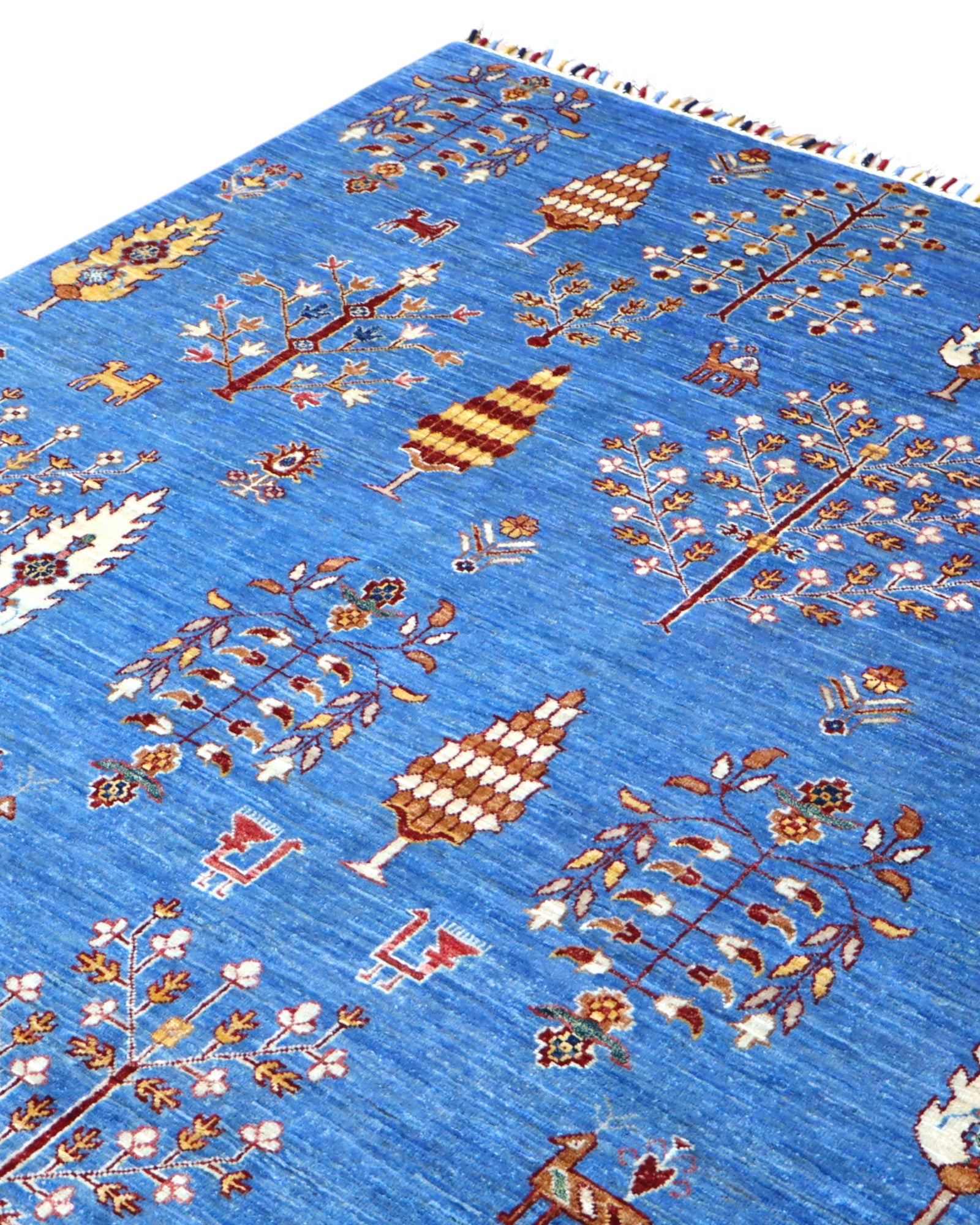 Il Tappeto Moderno 300 x 200 cm si ispira allo stile Gabbeh contemporaneo, con un fondo blu uniforme arricchito da alberi stilizzati, motivi geometrici e piccole figure animali. La palette cromatica, composta da toni caldi come oro, crema e rosso, crea un equilibrio armonioso che porta carattere e vivacità a qualsiasi ambiente.