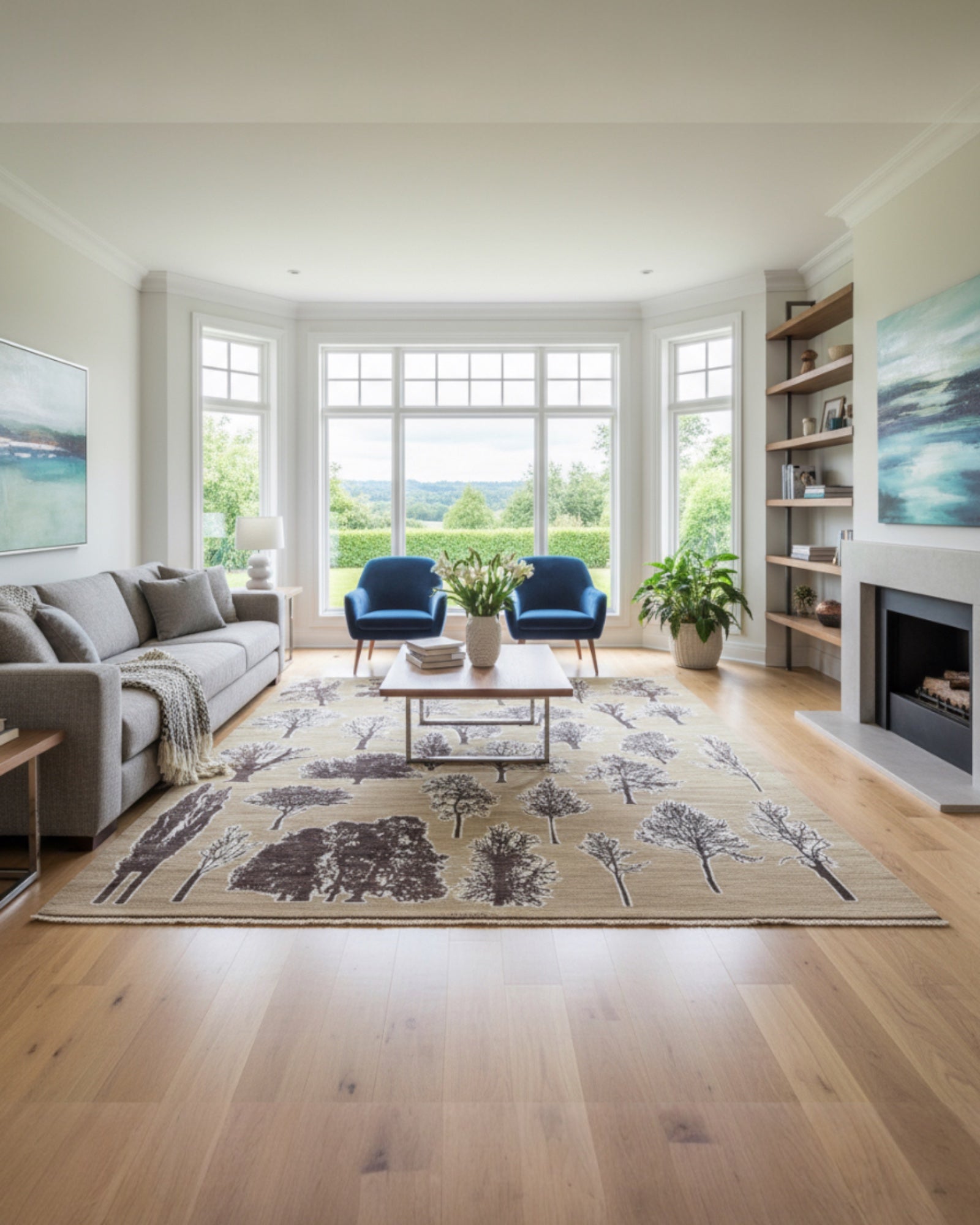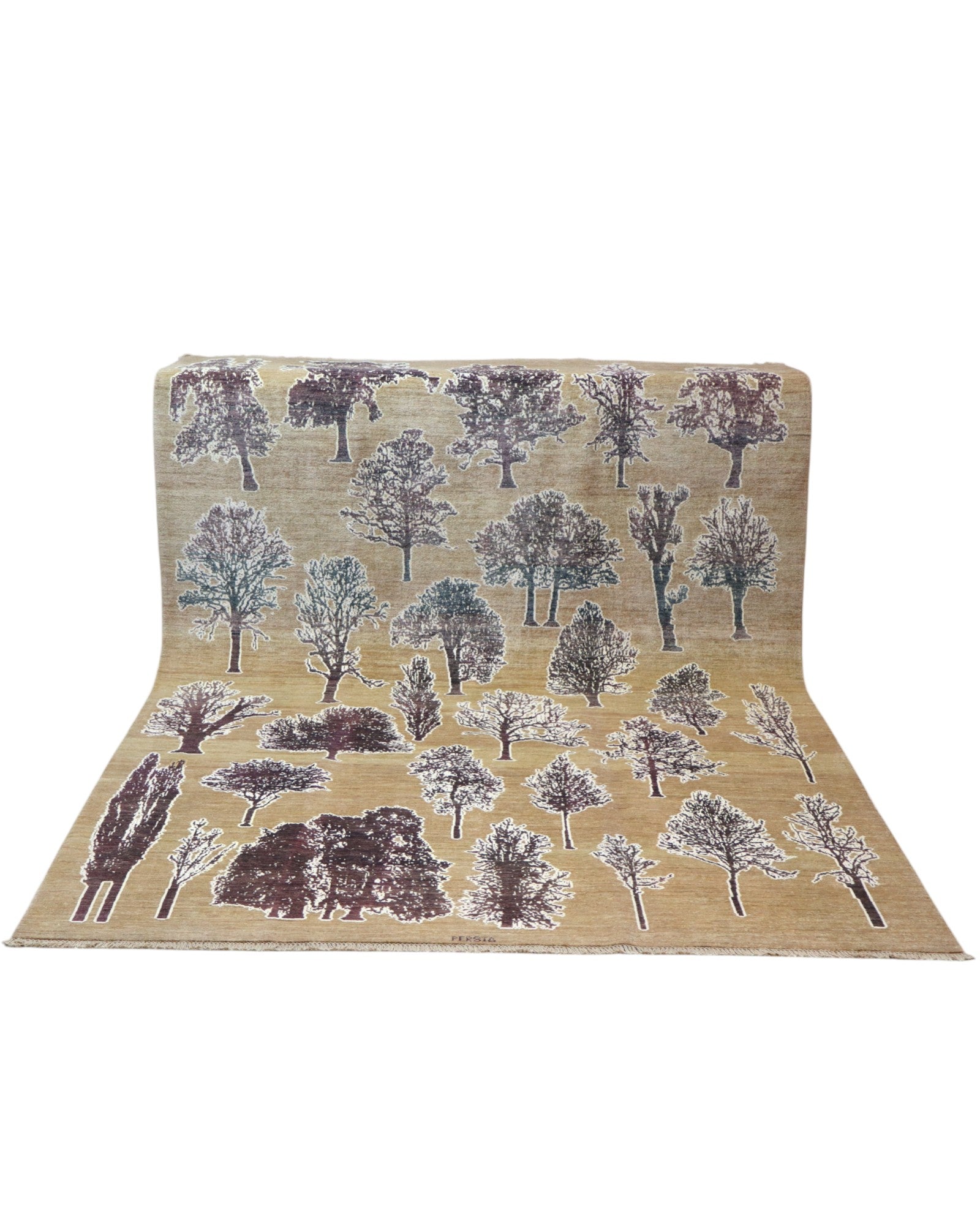 Questo tappeto moderno persiano 300 x 202 cm presenta un suggestivo decoro con alberi stilizzati distribuiti in modo armonioso sull’intera superficie. Le tonalità neutre del fondo beige vengono arricchite dai dettagli naturali in marrone, grigio e viola, creando un effetto che ricorda un paesaggio boschivo astratto.