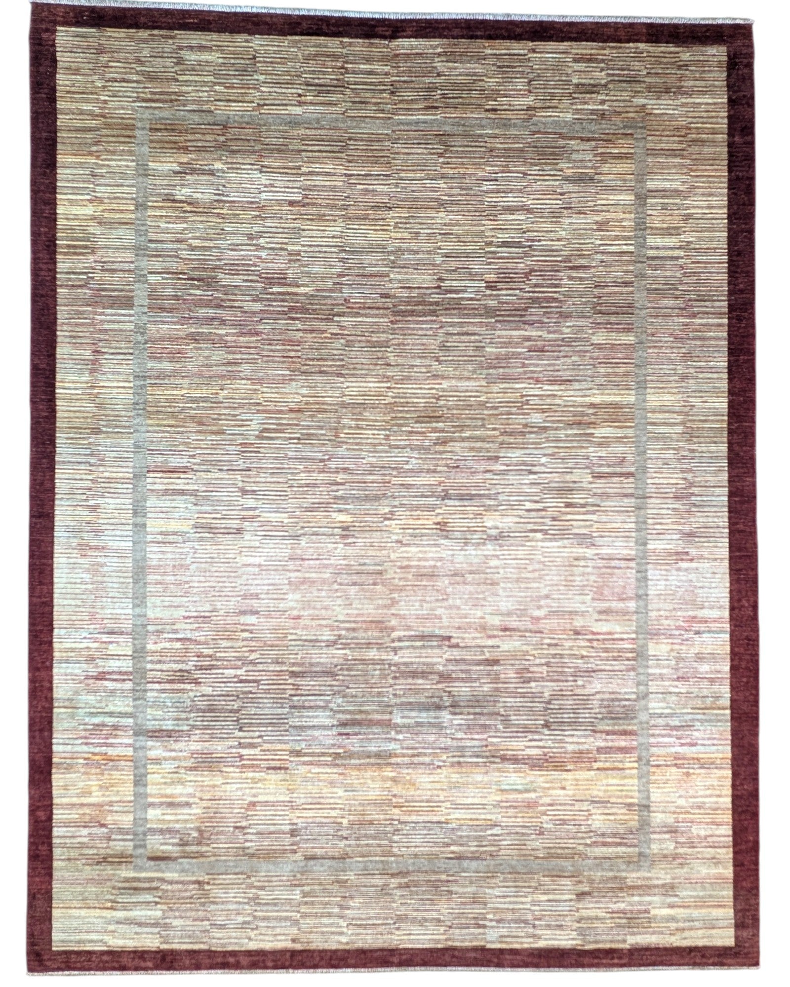 Una cornice esterna marrone e un bordo interno grigio definiscono lo spazio centrale con discrezione, mantenendo l’estetica minimalista del tappeto. La lana di alta qualità, annodata a mano, garantisce morbidezza, durata e una superficie visiva ricca di sfumature naturali.