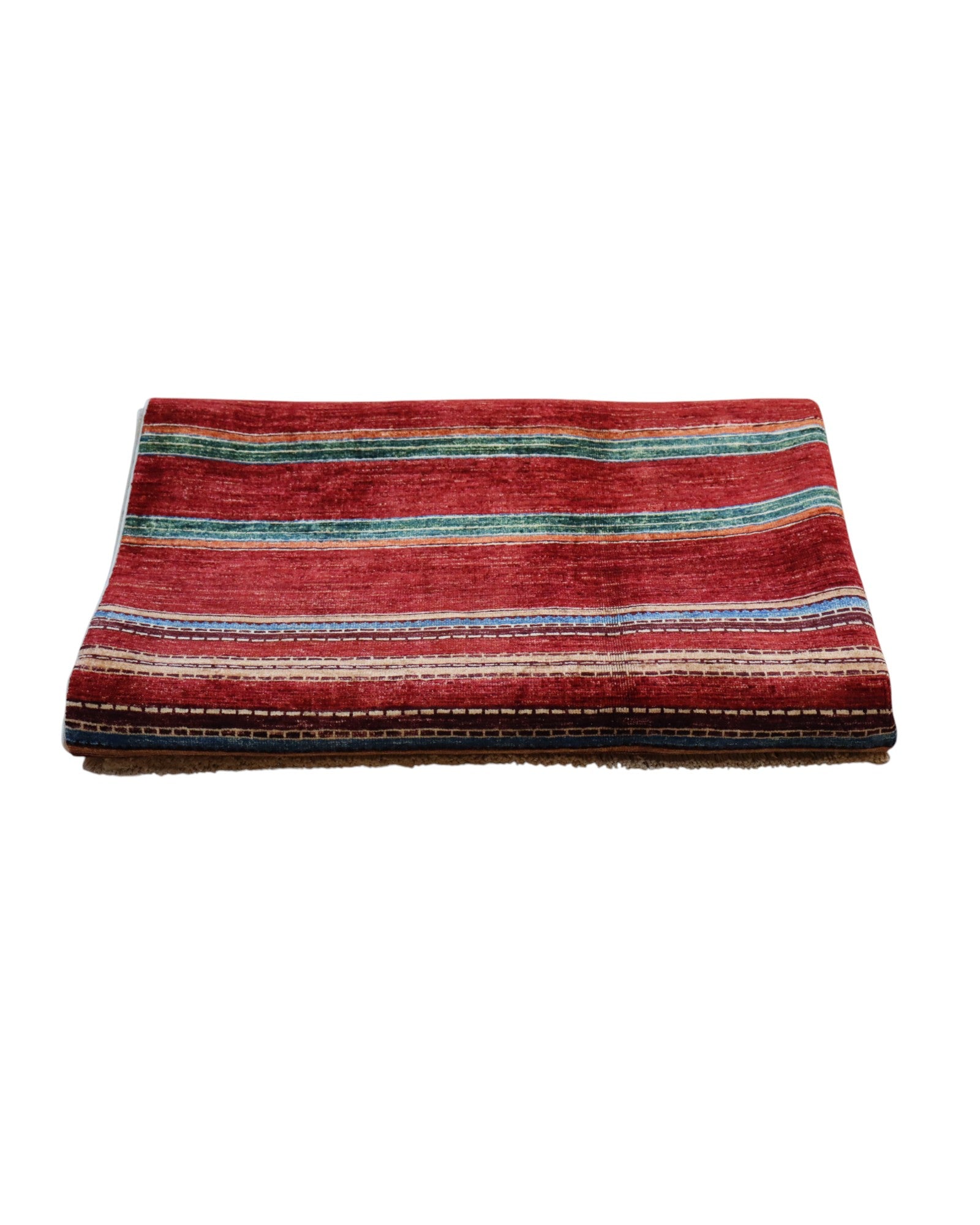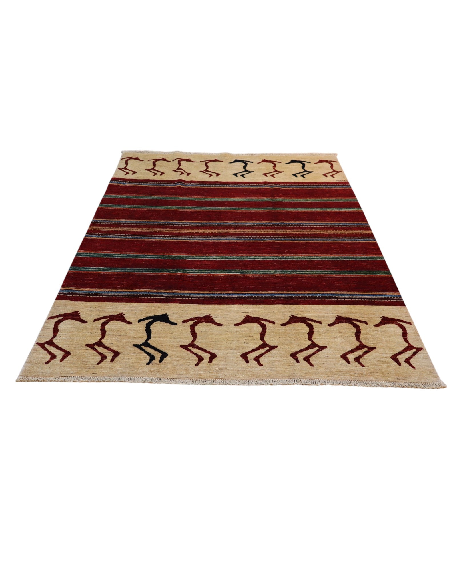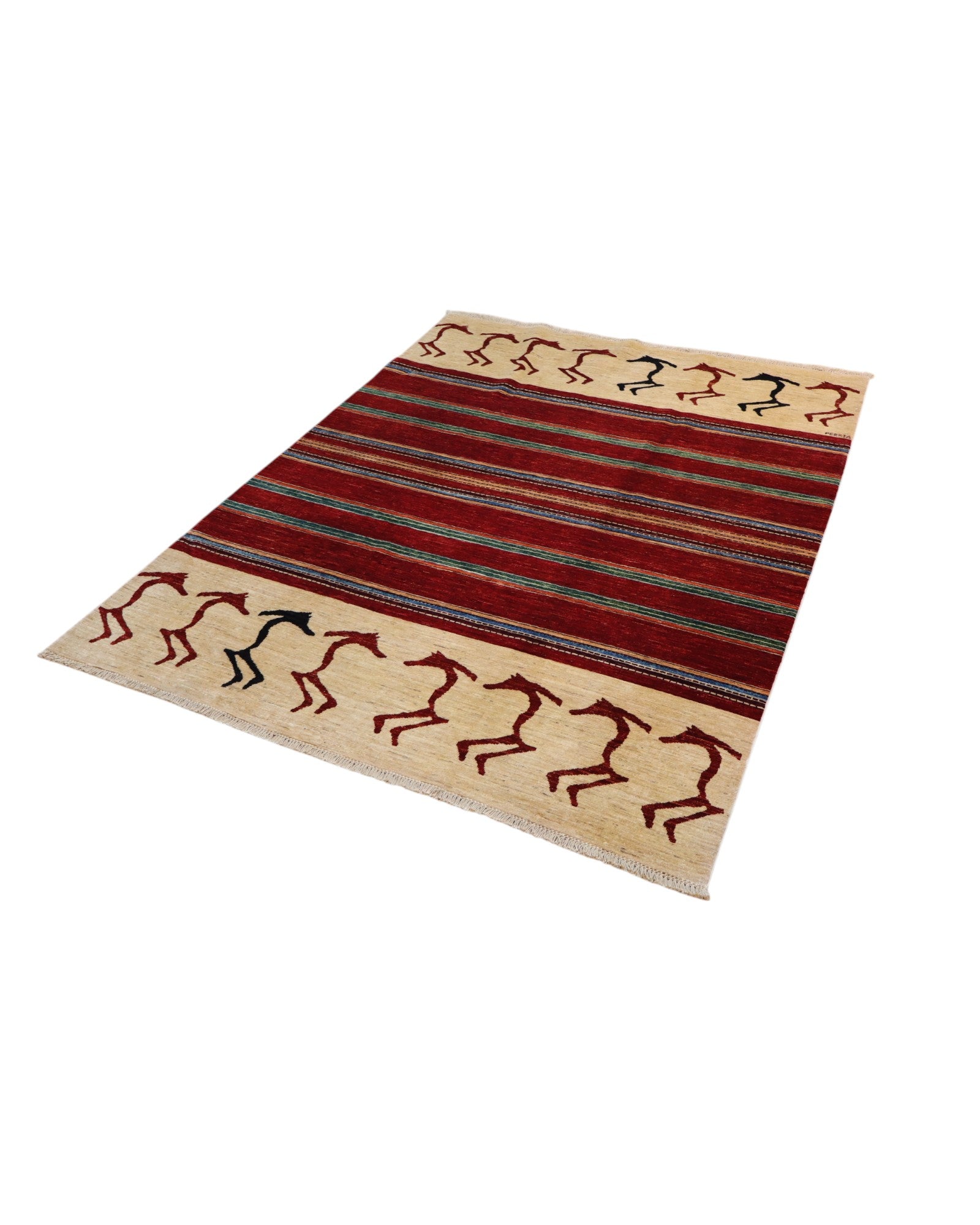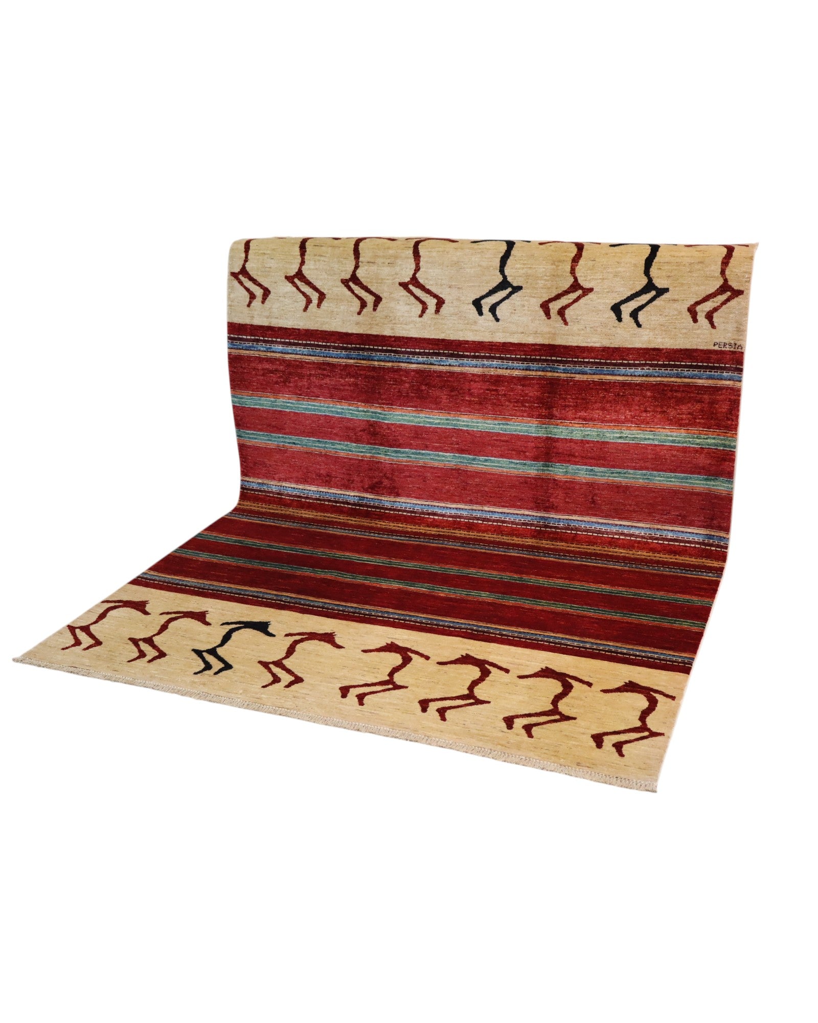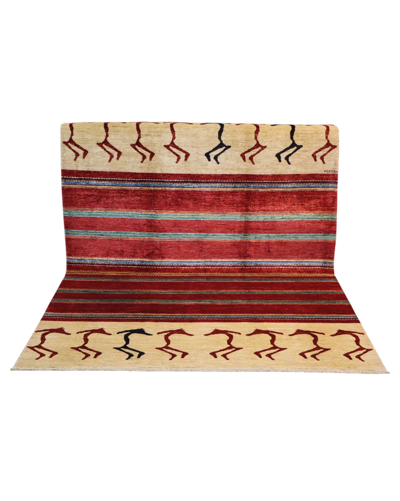 Immergiti in un racconto di storia e arte con questo straordinario tappeto moderno, una creazione esclusiva dell’artista Dario, formatosi alla scuola d’arte. Annodato a mano su telai tradizionali da esperti artigiani, il tappeto reinterpreta la sella dei cavalli del popolo indo-europeo, arricchendola con un dettaglio distintivo: eleganti figure stilizzate di cavalli che impreziosiscono le fasce superiore e inferiore.Il campo centrale è animato da una composizione di righe verticali multicolori che generano un ritmo visivo vivace e moderno. In contrasto, i profili sinuosi dei cavalli stilizzati evocano movimento e richiamano la tradizione equestre, creando un perfetto equilibrio tra simbolismo antico e design contemporaneo.Questo tappeto è molto più di un complemento d’arredo: è un’opera d’arte tessile che unisce maestria artigianale e visione artistica. L’impiego di materiali di alta qualità – cotone resistente per trama e ordito, lana pregiata tinta con colori vegetali – assicura durabilità e bellezza nel tempo.