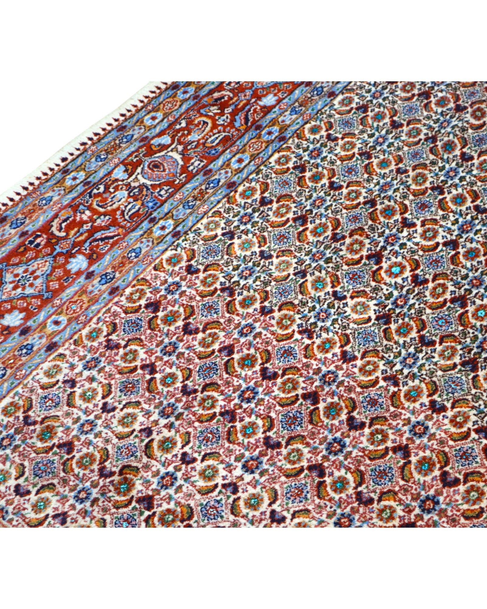 Il campo centrale presenta un raffinato motivo floreale e geometrico, tipico della tradizione di Mud, dove i toni azzurri e crema si intrecciano con dettagli bordeaux e blu, creando un effetto visivo elegante e bilanciato. La cornice decorata aggiunge profondità e incornicia perfettamente la composizione complessiva.
