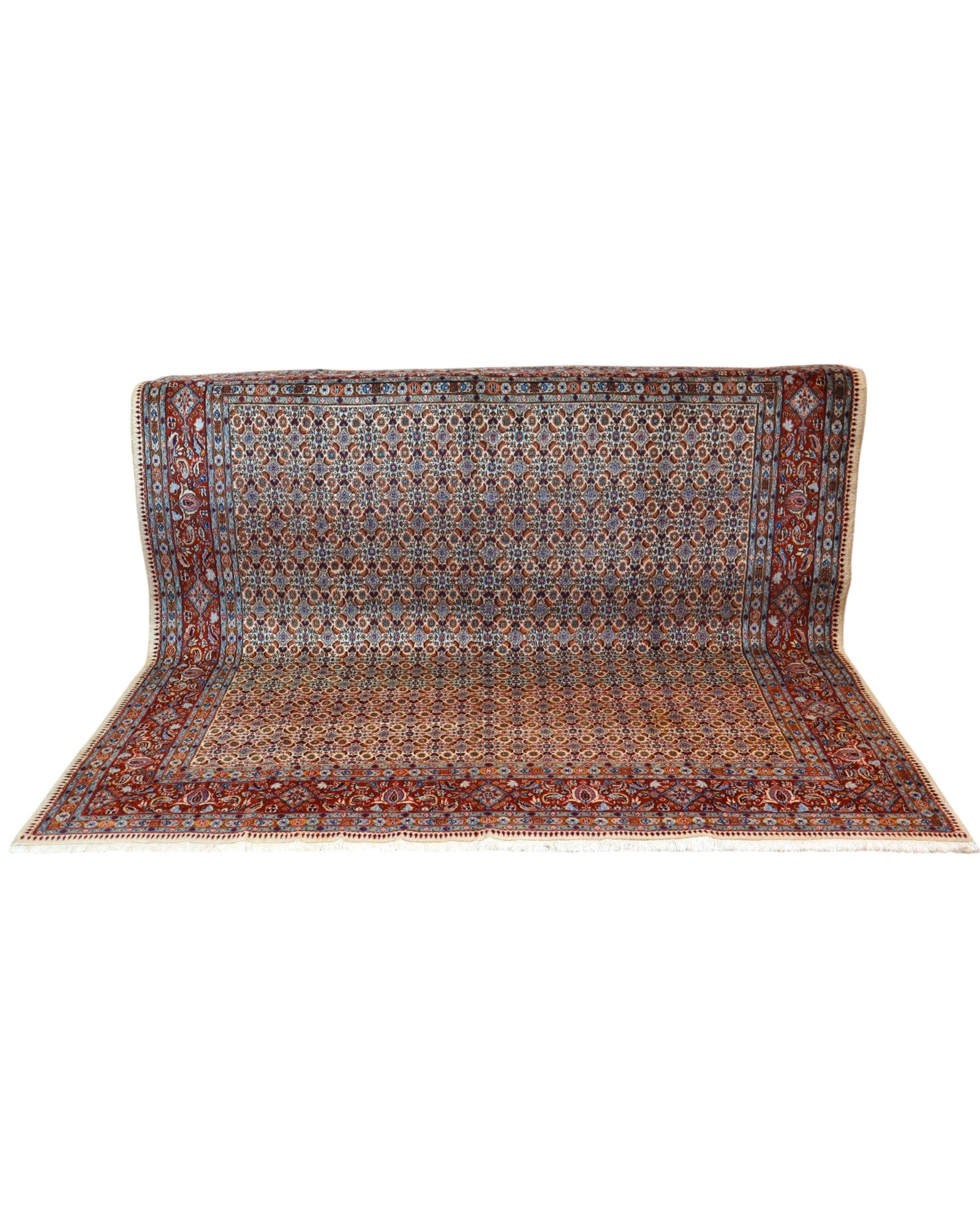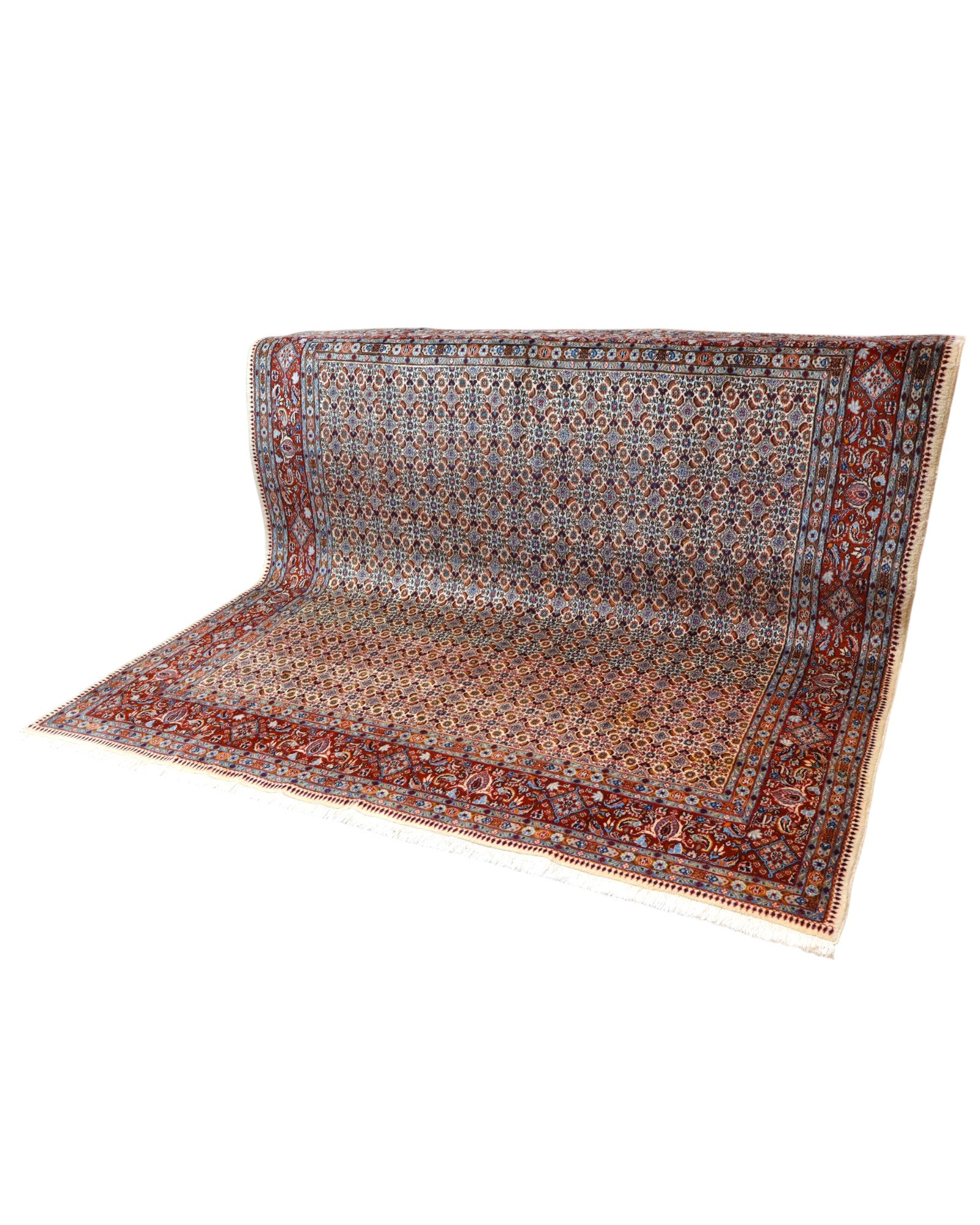 Questo splendido tappeto Mud, proveniente dal cuore della Persia, è un esempio eccezionale di precisione artigianale e armonia cromatica. La sua lavorazione a mano, con nodi fitti e regolari, dona al disegno una straordinaria definizione e una piacevole morbidezza al tatto grazie al vello in lana mista seta.