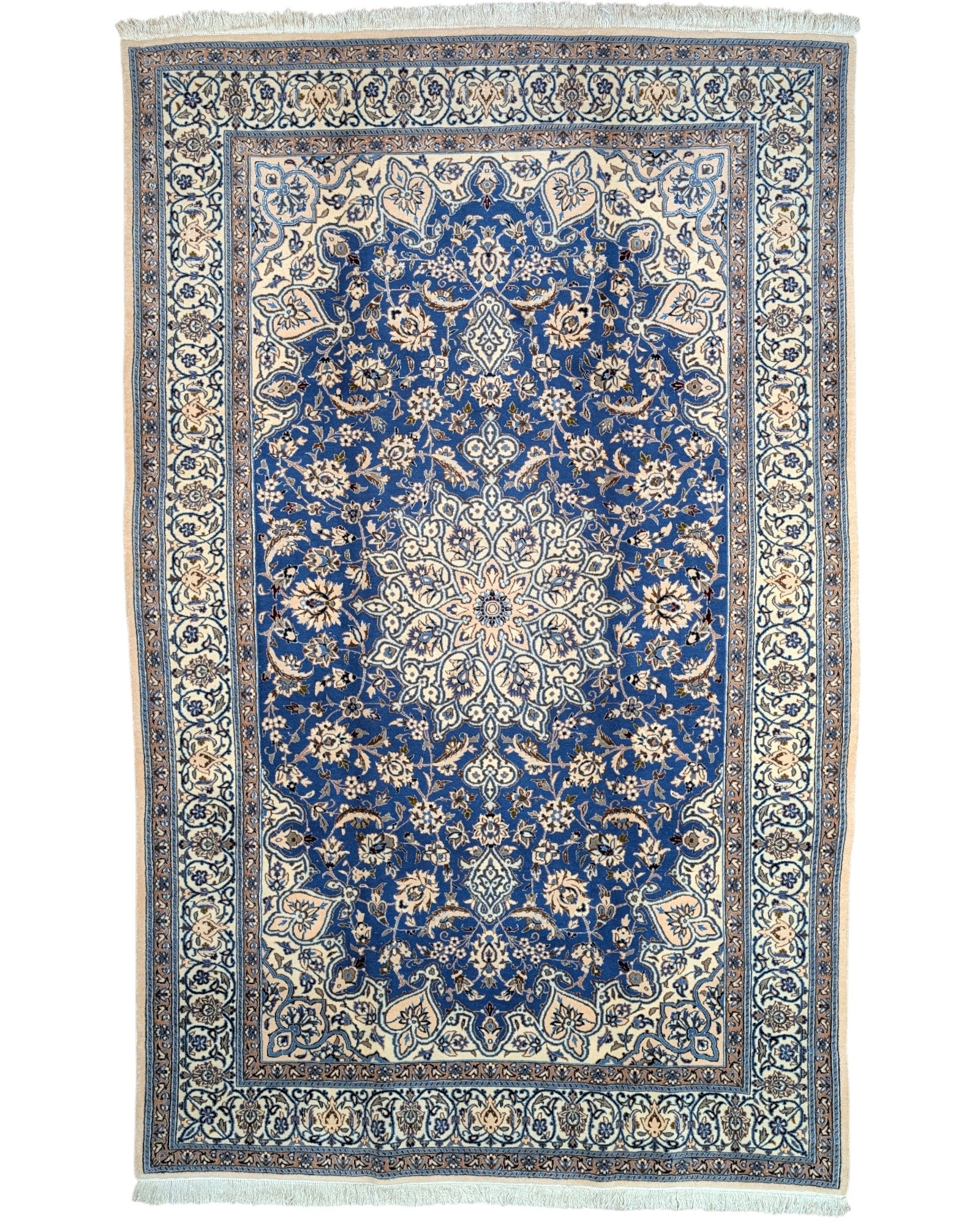 Un raffinato esempio della tradizione tessile persiana, questo tappeto Nain si distingue per il suo elegante campo blu intenso, impreziosito da un ricco disegno floreale che converge verso un medaglione centrale armonioso e finemente dettagliato. Le tonalità avorio e beige illuminano la composizione, creando un contrasto equilibrato e sofisticato tipico degli atelier di Nain.