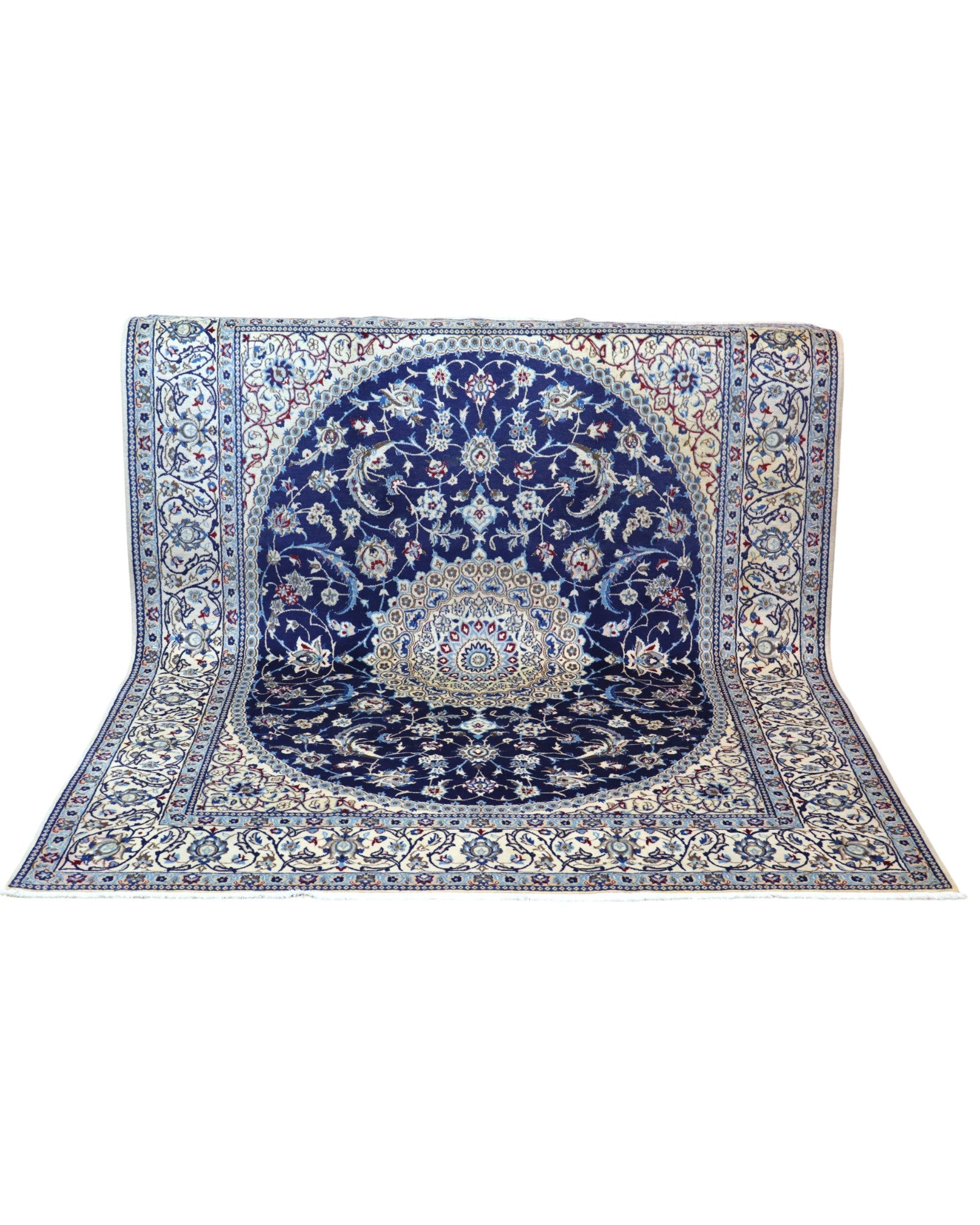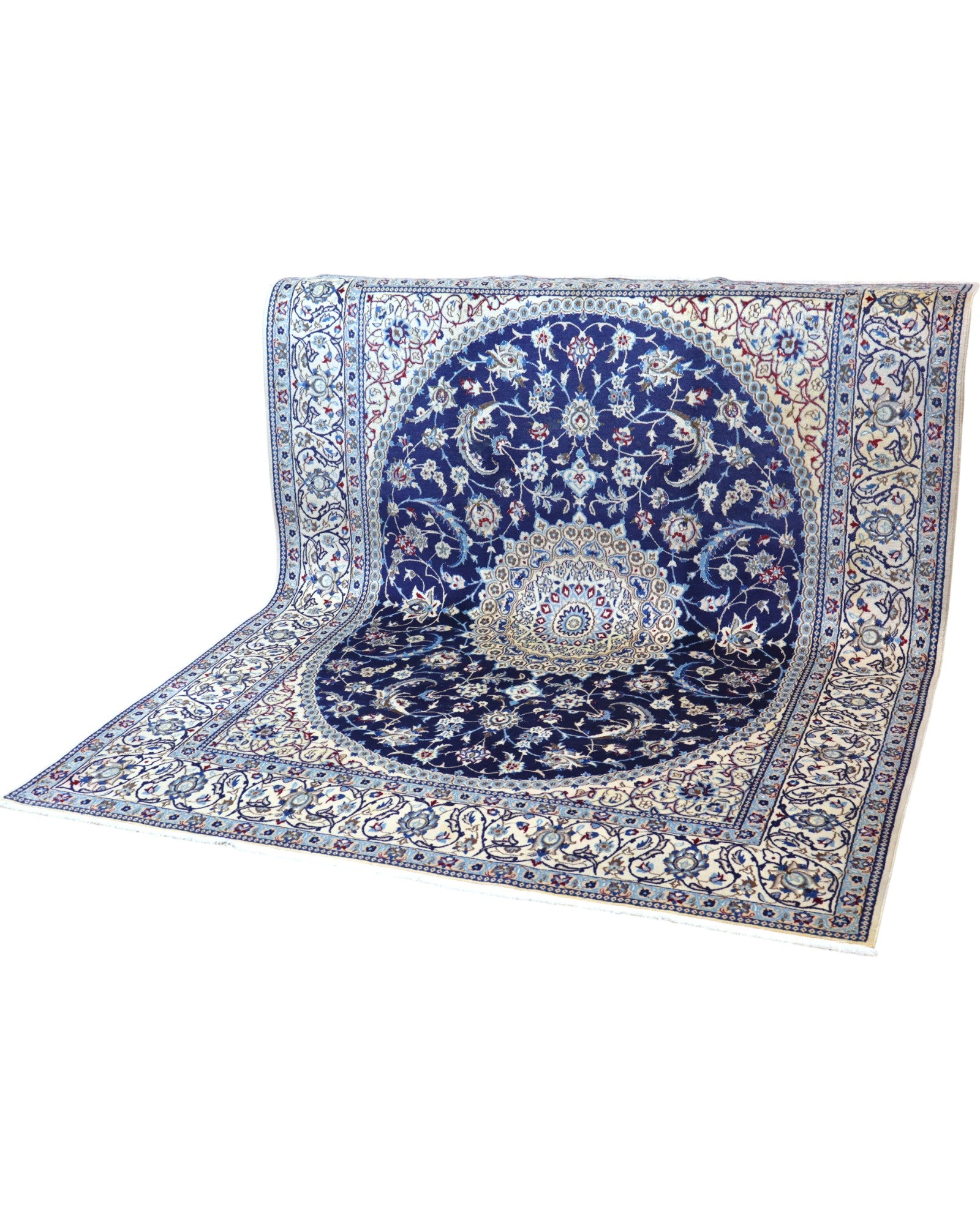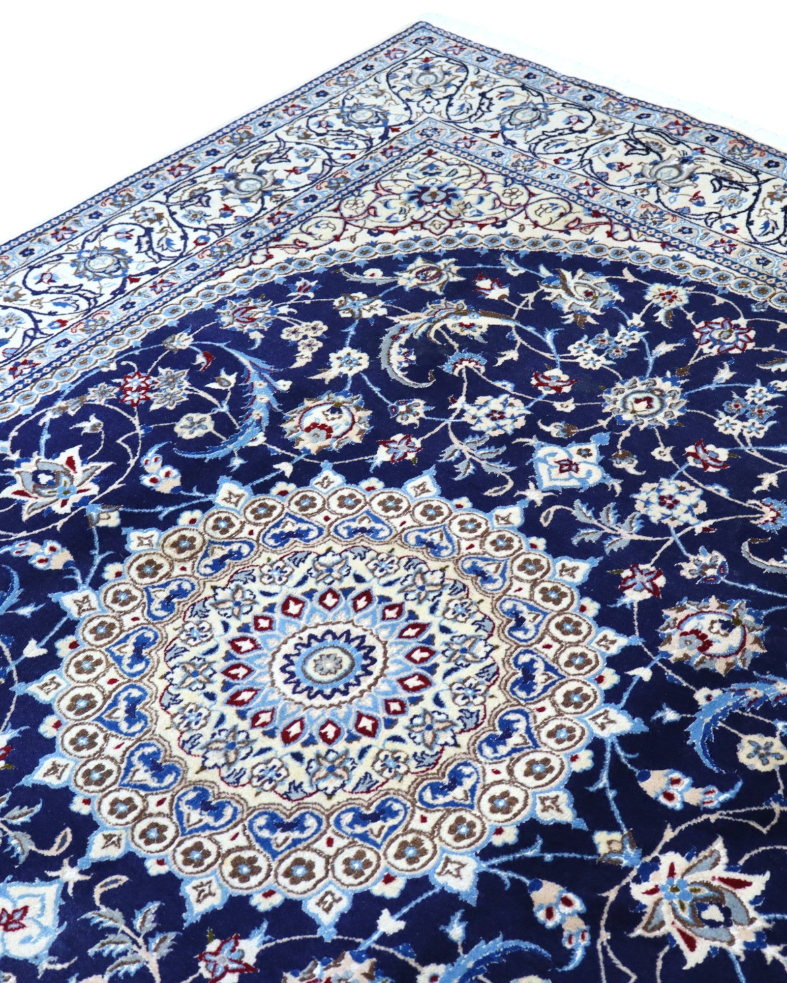 Questo splendido tappeto Nain si distingue per il suo elegante contrasto cromatico tra il blu notte intenso del campo centrale e l’avorio raffinato della bordura. Il grande medaglione centrale, riccamente decorato con dettagli in seta, presenta una struttura radiale armoniosa che dona equilibrio e un raffinato senso di simmetria all’intero tappeto.