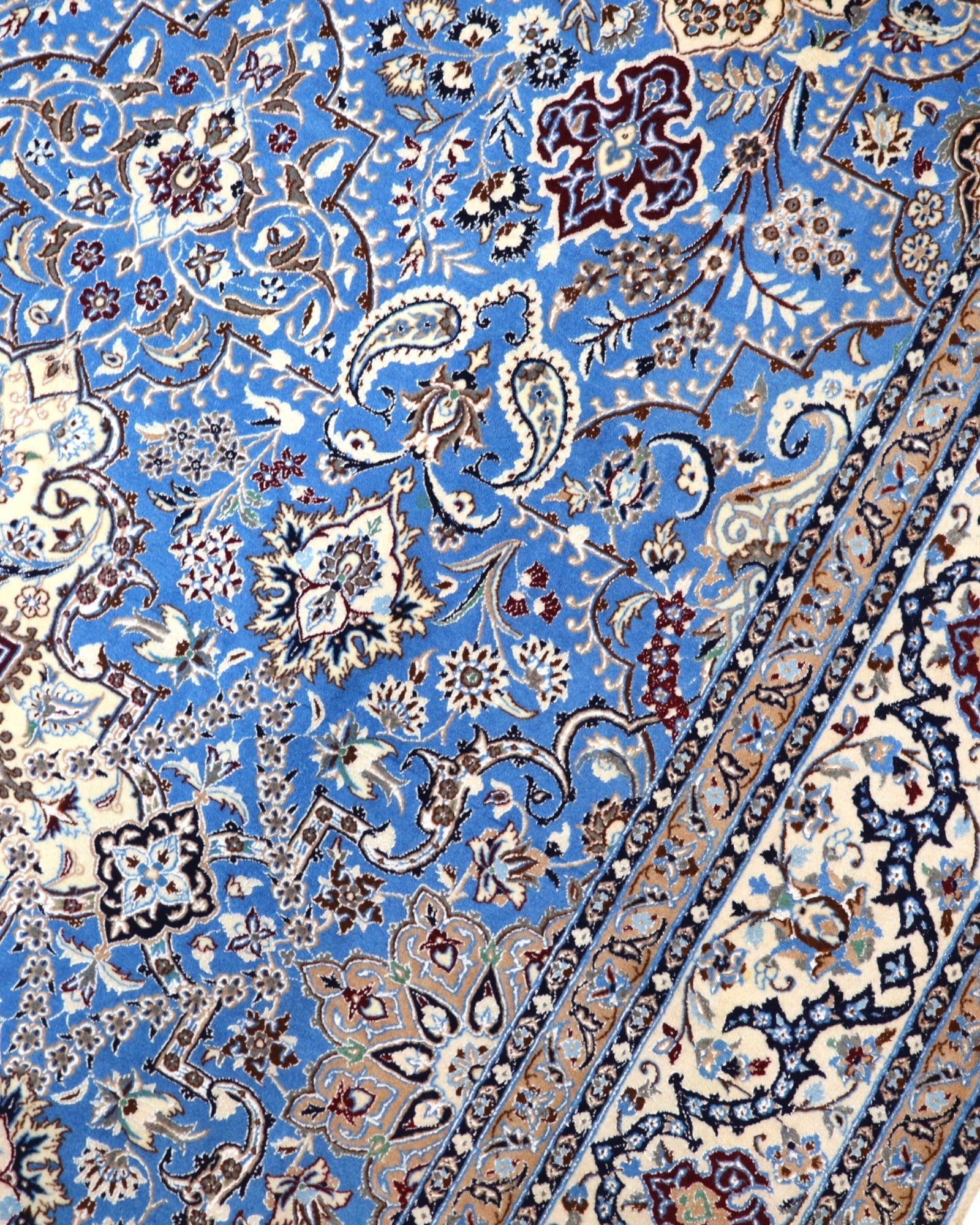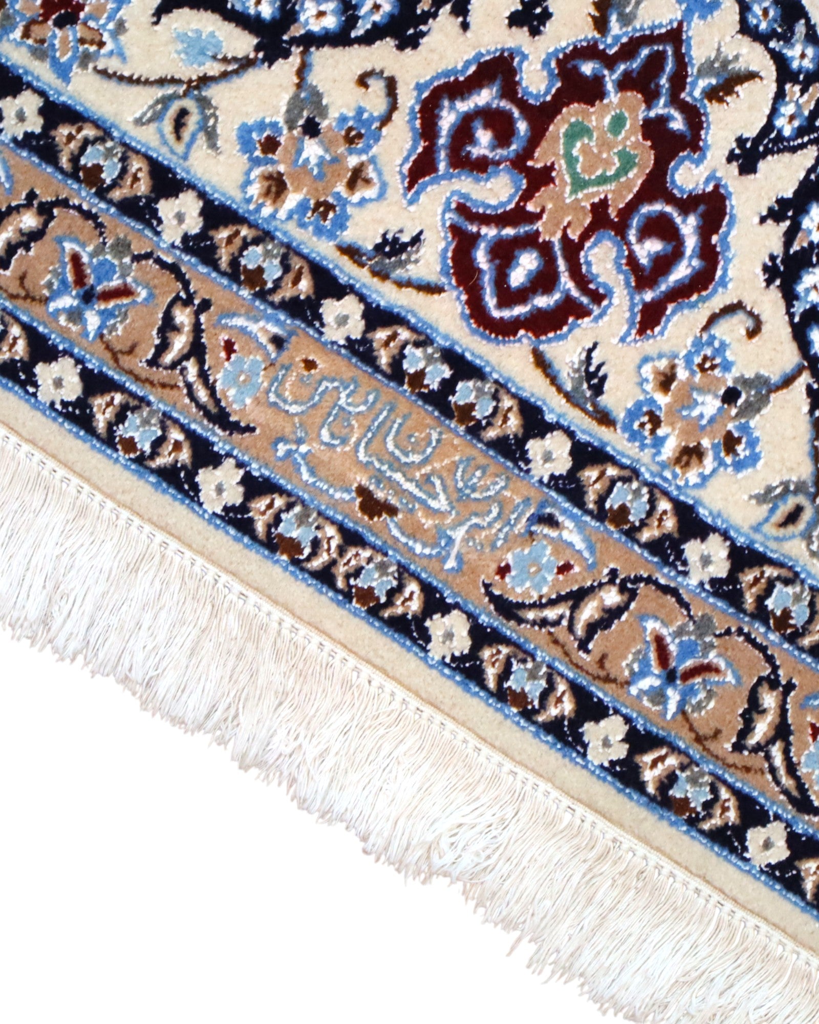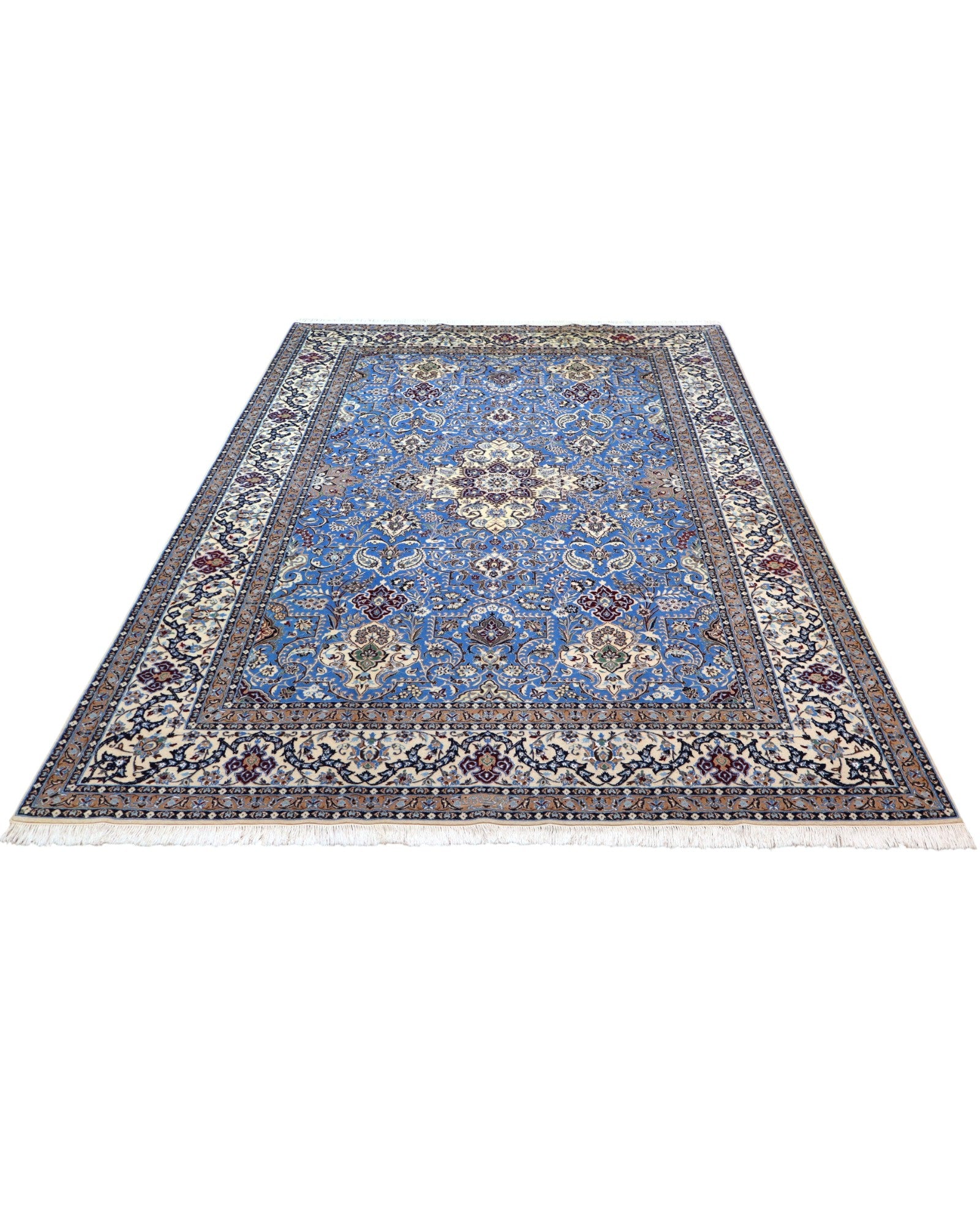 Il Tappeto Nain è un magnifico esempio della tradizione persiana, noto per la sua bellezza sofisticata e l’eleganza senza tempo. Con dimensioni di 310 x 203 cm, questo tappeto è perfetto per arredare grandi ambienti, aggiungendo un tocco di lusso e raffinatezza. Realizzato con vello in lana tinta con colori naturali e trama in cotone resistente, presenta un fondo blu impreziosito da motivi floreali che si intrecciano armoniosamente nei toni del beige, avorio e viola. La lavorazione artigianale, eseguita a mano, conferisce una durabilità straordinaria e un design impeccabile, che si distingue per la precisione e la ricchezza dei dettagli.