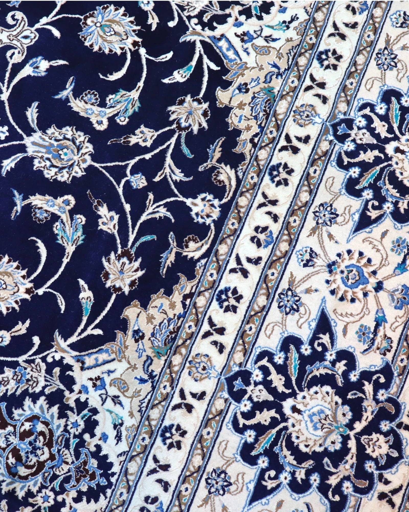 Il tappeto Nain è tra i più apprezzati per la sua raffinata eleganza e la delicatezza cromatica. Questo esemplare è stato annodato a mano con vello in lana di alta qualità tinta con colori vegetali, garantendo pregio e durabilità. Le dimensioni di 390 x 297 cm lo rendono ideale per grandi ambienti, capaci di accogliere un capolavoro di equilibrio ed armonia.