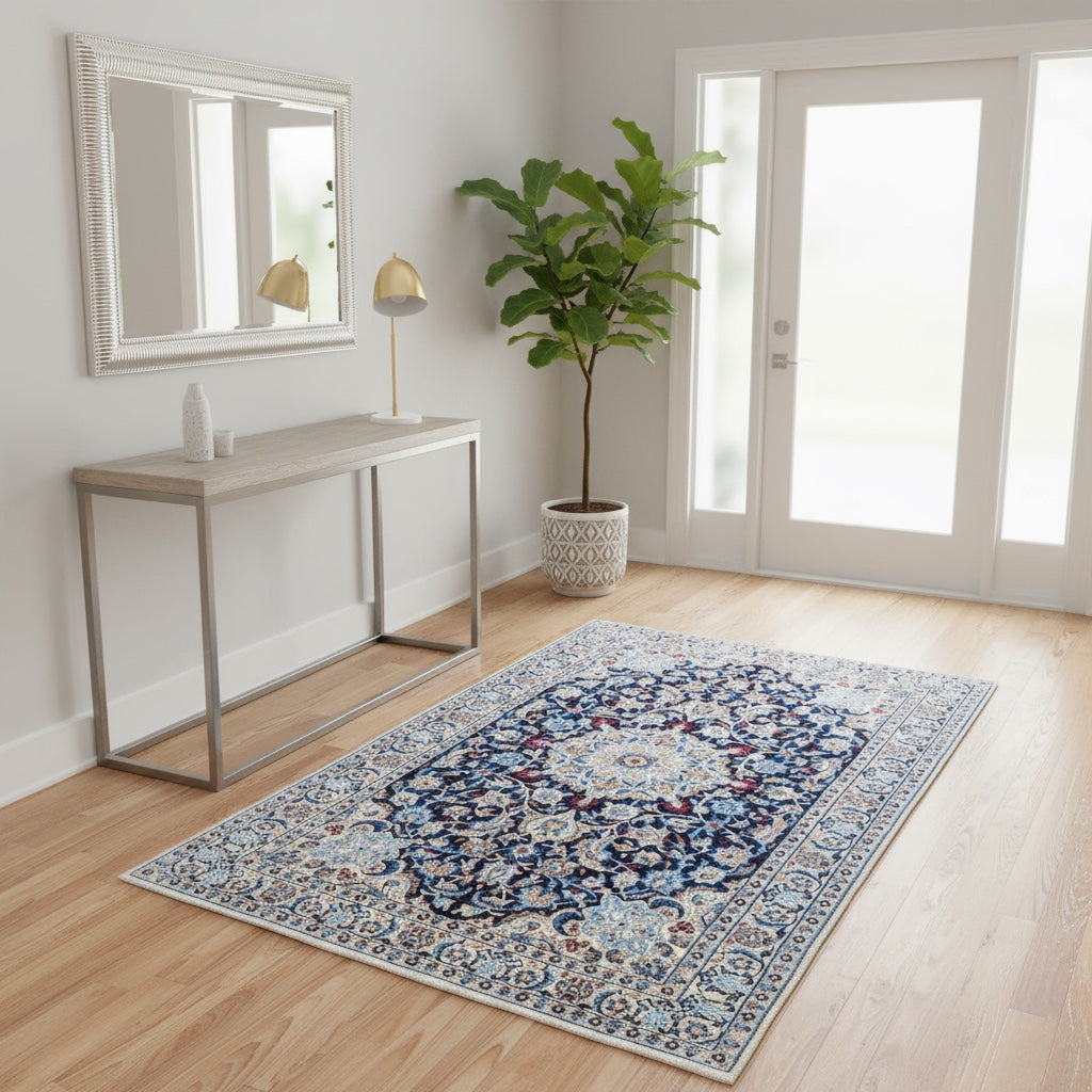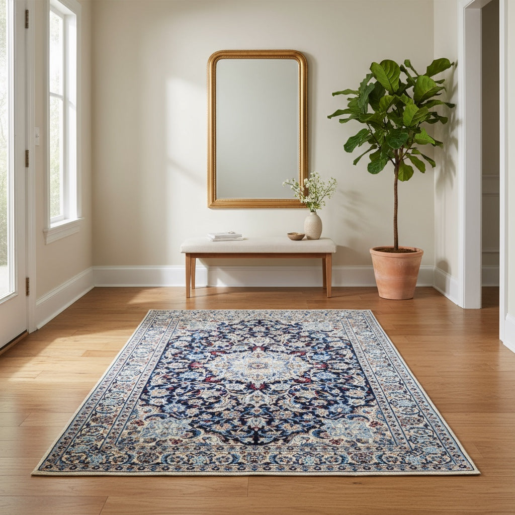 Il fondo blu scuro è arricchito da un raffinato motivo floreale chiaro che mette in risalto la precisione e la maestria della lavorazione. La ricchezza dei dettagli e la combinazione armoniosa delle tonalità conferiscono al tappeto un’eleganza intramontabile, ideale per arricchire qualsiasi ambiente con prestigio e stile.