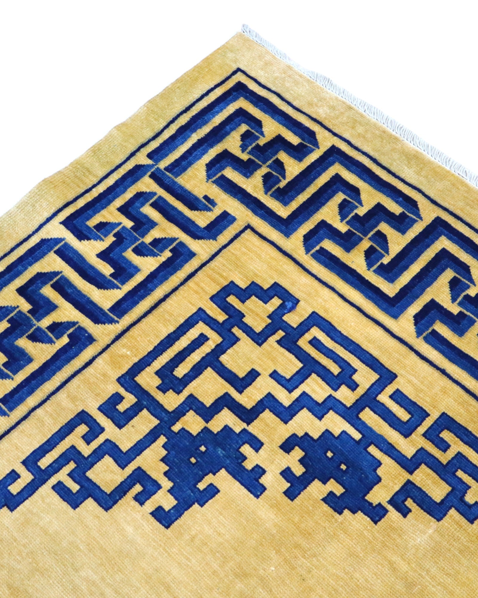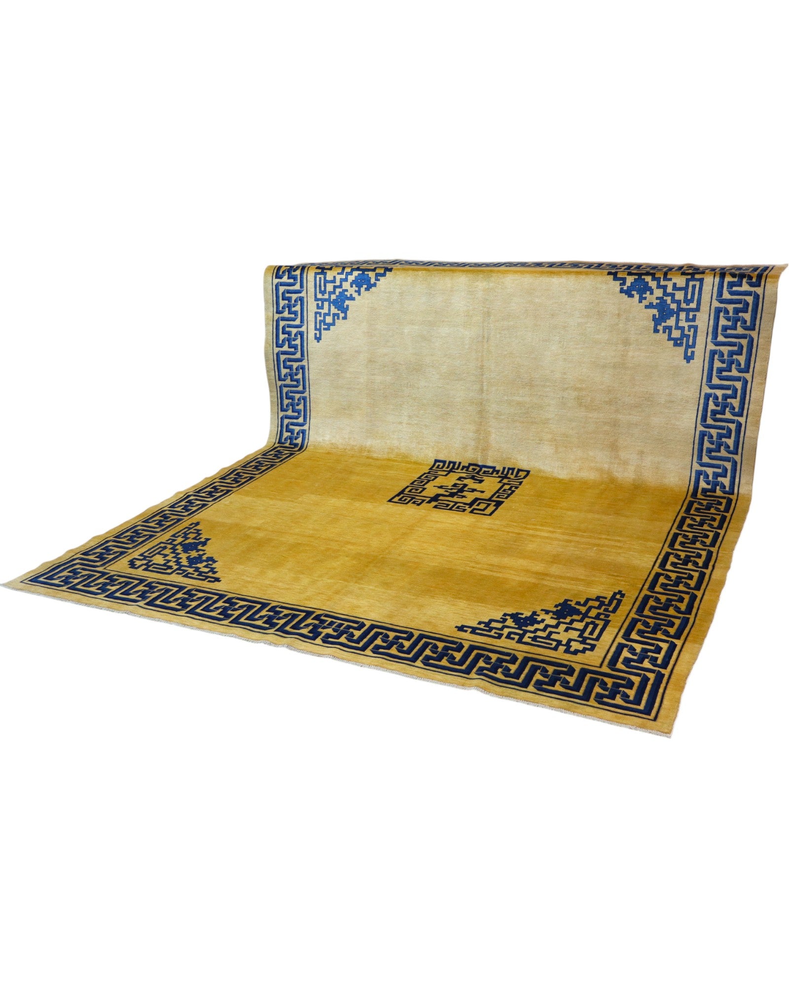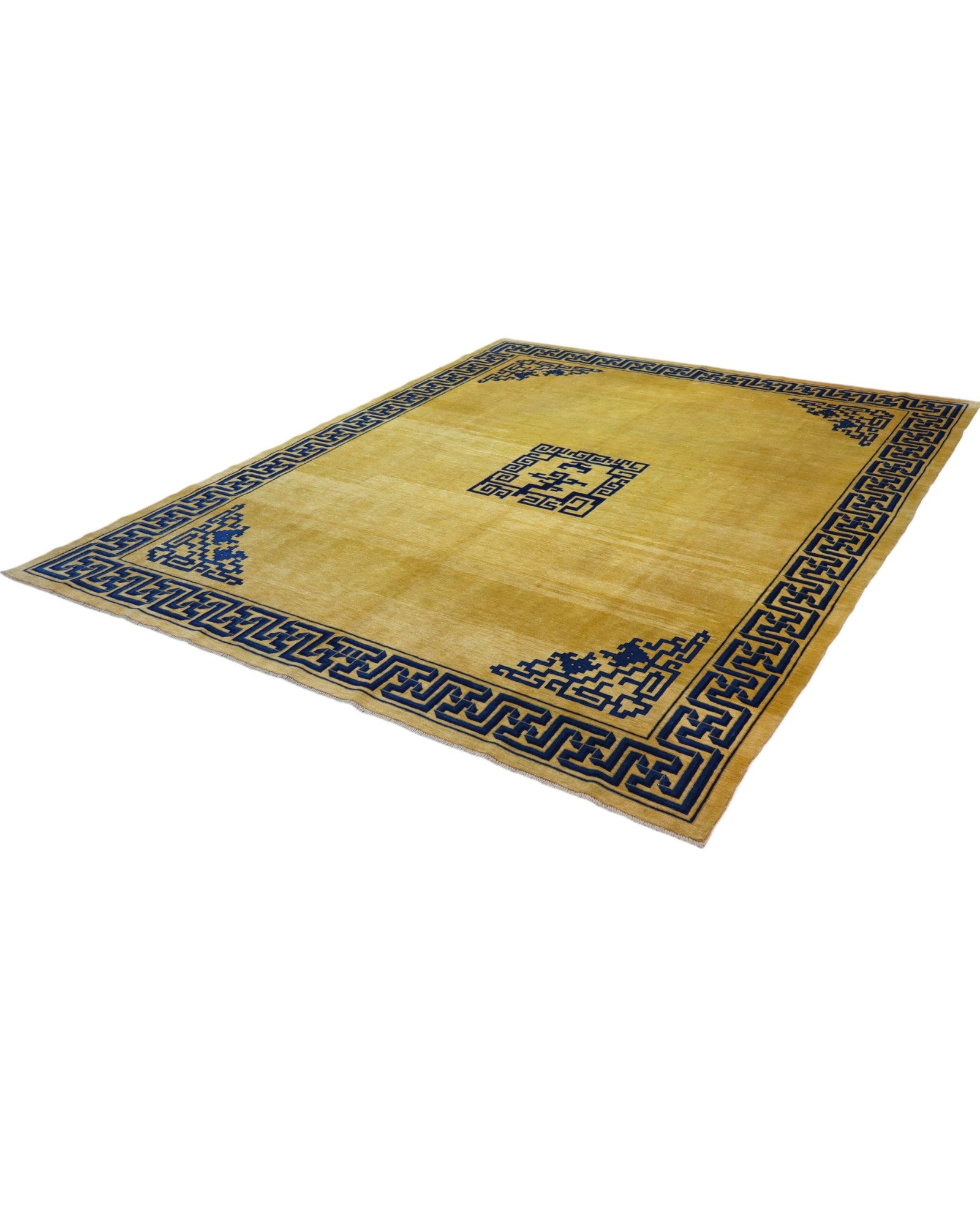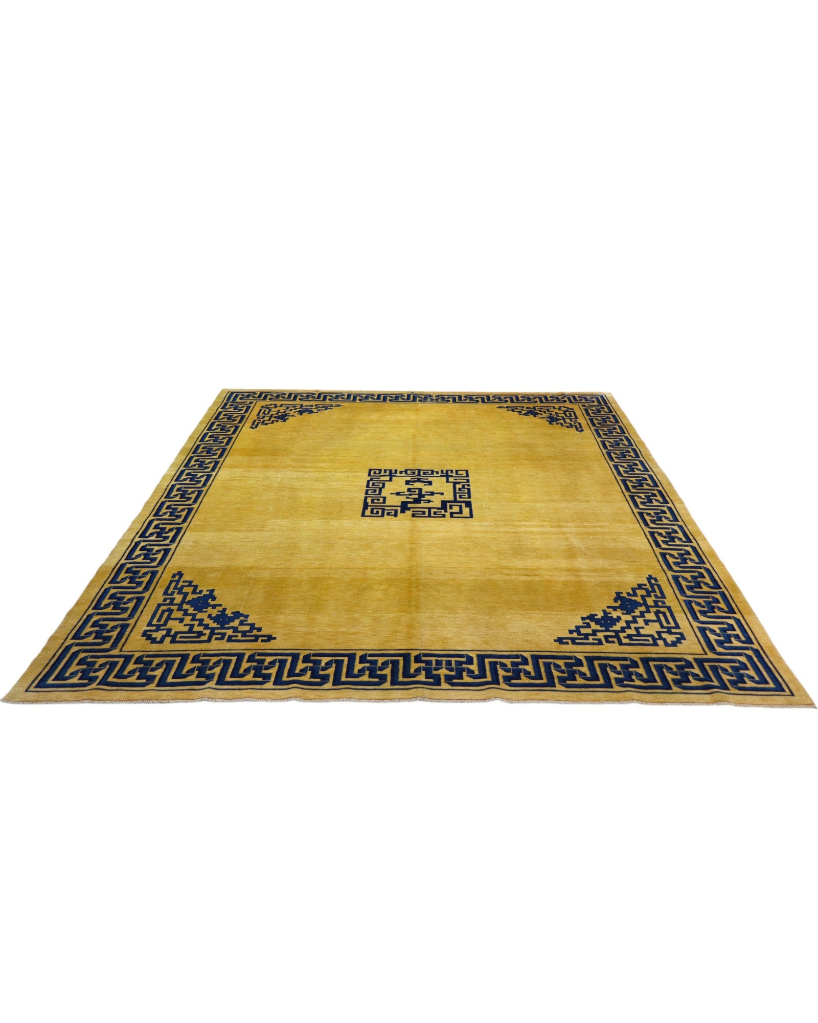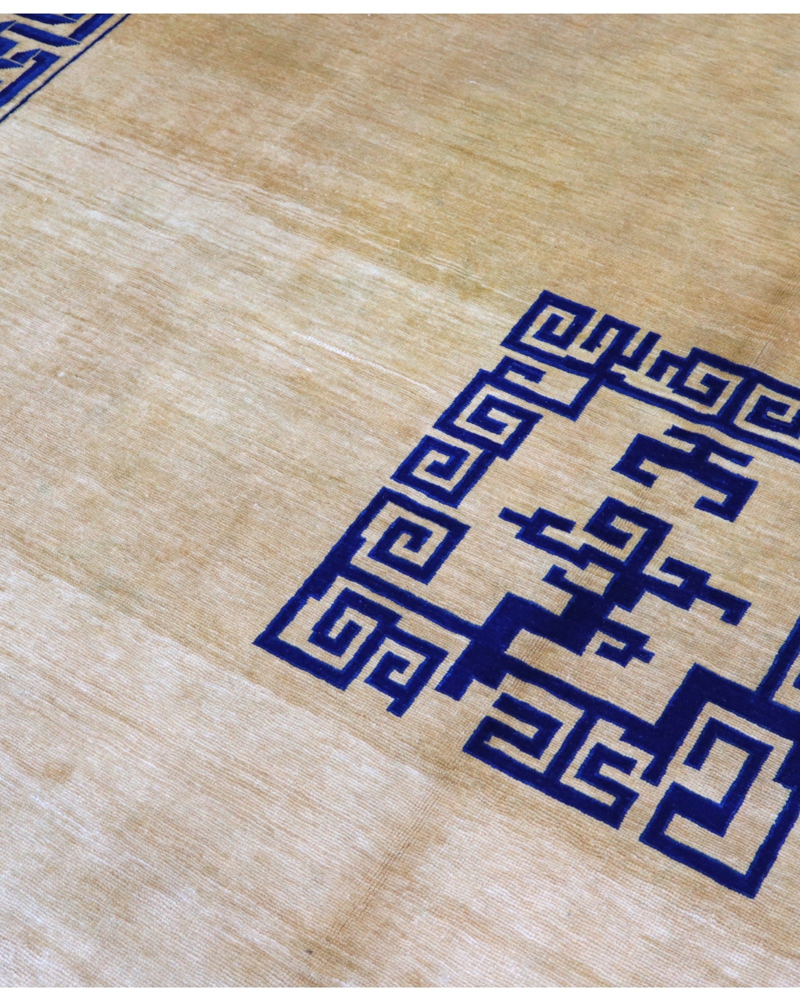 Il design presenta un fondo beige, sul quale si sviluppano motivi geometrici e stilizzati in blu, tipici dell'arte cinese. Un medaglione centrale quadrato e angoli decorati con gli stessi motivi definiscono il campo, mentre una cornice blu, riccamente ornata da simboli e linee intricate, avvolge l'intero tappeto in un'armonia visiva distintiva e affascinante. I colori vegetali donano al tappeto una profondità e una bellezza autentiche che si manterranno inalterate nel tempo.