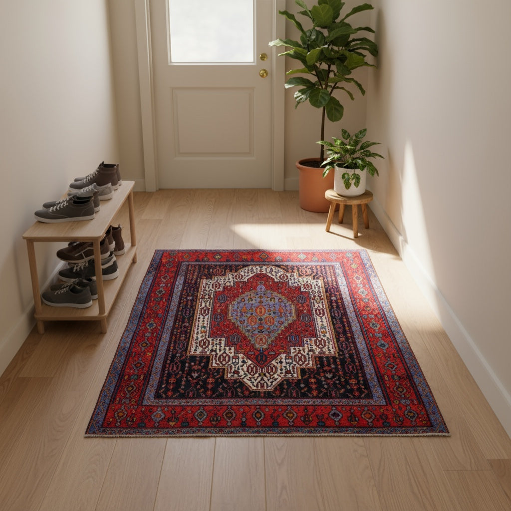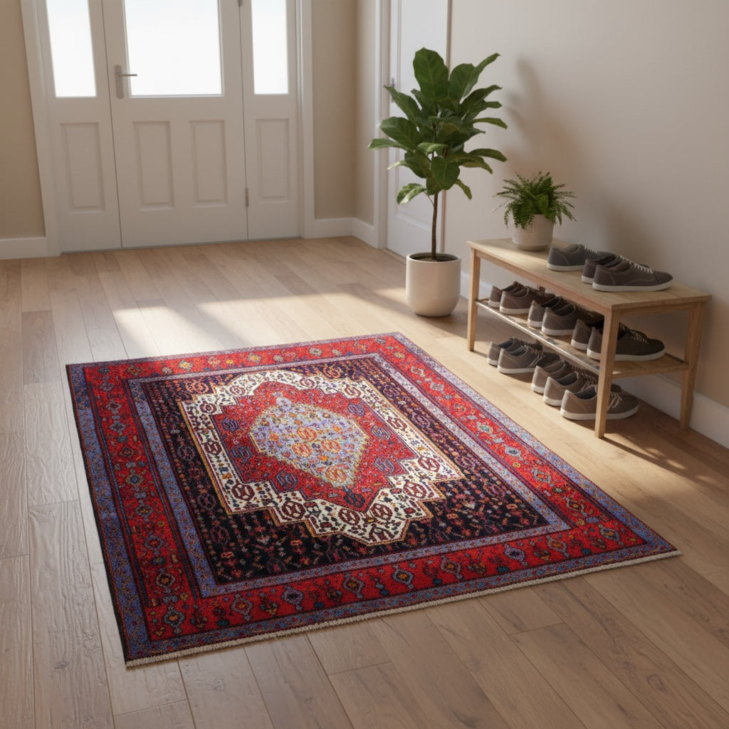 Questo tappeto Senneh 168x143 cm si distingue per la sua raffinata composizione geometrica: al centro si apre un medaglione sfumato in blu e rosso, incorniciato da motivi a gradini su fondo avorio, che creano un elegante contrasto cromatico. Il campo è decorato da una fitta trama di piccoli motivi romboidali e geometrici, tipici della tradizione Senneh, noti per la loro precisione e armonia.