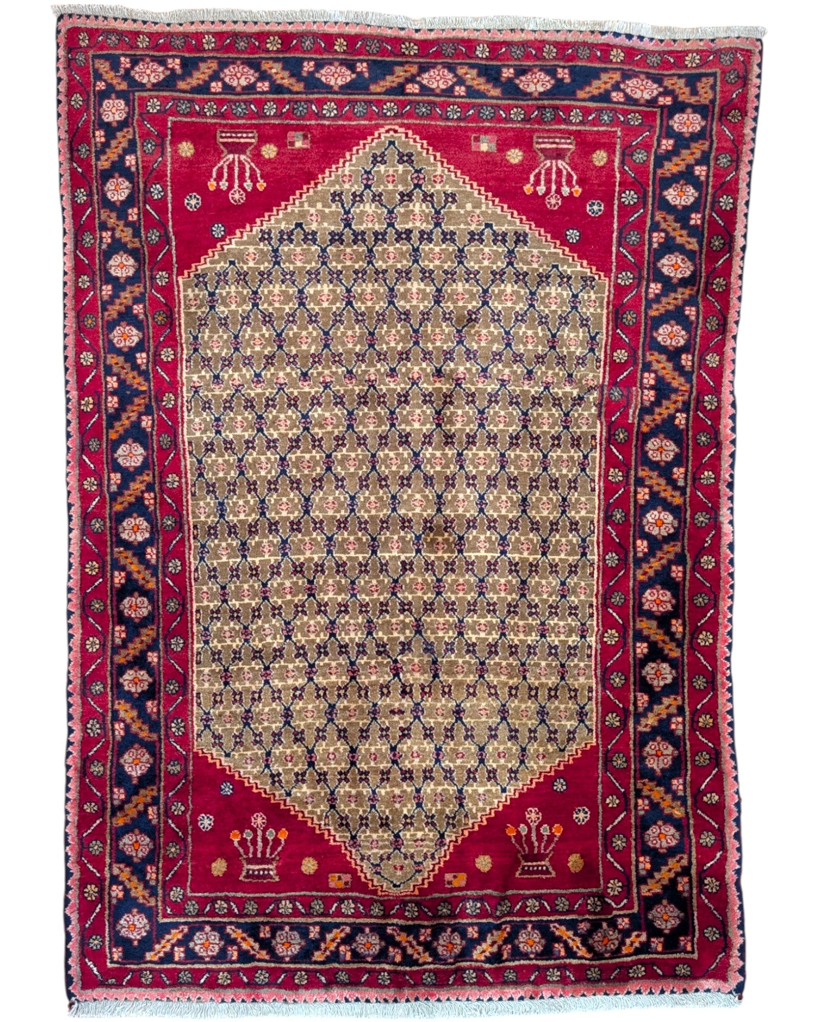 Il design presenta un campo beige sul quale si sviluppa un intricato motivo geometrico, tipico dei tappeti Senneh. La cornice rossa, finemente decorata con motivi geometrici tradizionali, crea un elegante contrasto e avvolge l’intero tappeto in un’armonia visiva accogliente e raffinata. I colori vegetali conferiscono profondità e bellezza duratura, esaltando la qualità artigianale del pezzo.