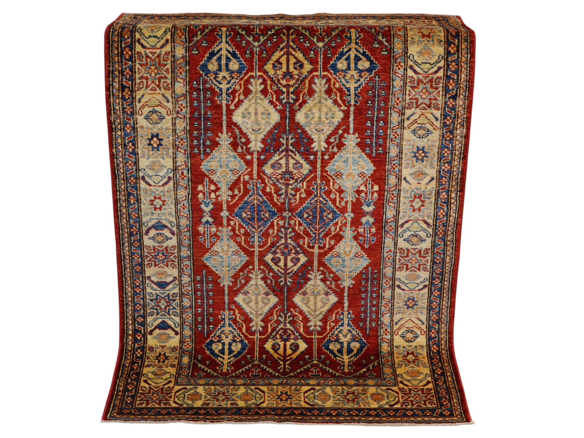 Il design del tappeto si distingue per il fondo rosso intenso, impreziosito da motivi geometrici in blu, giallo e beige, creando un contrasto vivace ma elegante. La cornice elaborata e la disposizione simmetrica dei motivi geometrici conferiscono al tappeto una bellezza strutturata e armoniosa, tipica dei tappeti Shirvan.