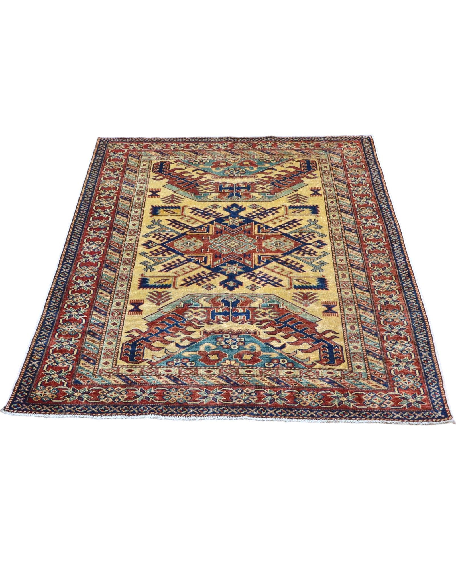 Il tappeto Shirvan Afghan 159x120 cm è un raffinato esempio della tradizione caucasica, reinterpretato con la maestria degli artigiani afghani. Il disegno geometrico centrale, con medaglioni e motivi a gancio, è tipico dei tappeti Shirvan, mentre la tavolozza di colori vivaci – rosso intenso, blu profondo e avorio – dona eleganza e luminosità all’ambiente.