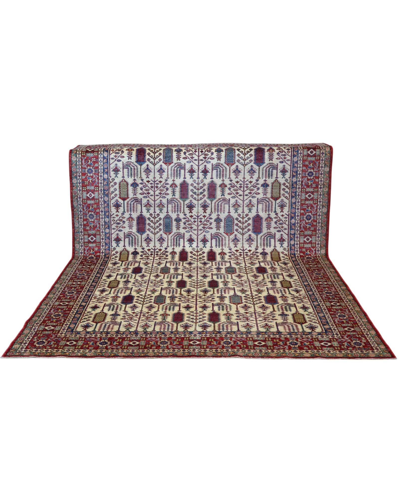 Il disegno si caratterizza per un fondo avorio impreziosito da una sequenza regolare di motivi geometrici stilizzati in rosso, blu, verde e giallo, che donano vivacità e armonia visiva. Le bordure riccamente decorate completano l’opera, conferendo equilibrio e forza cromatica.