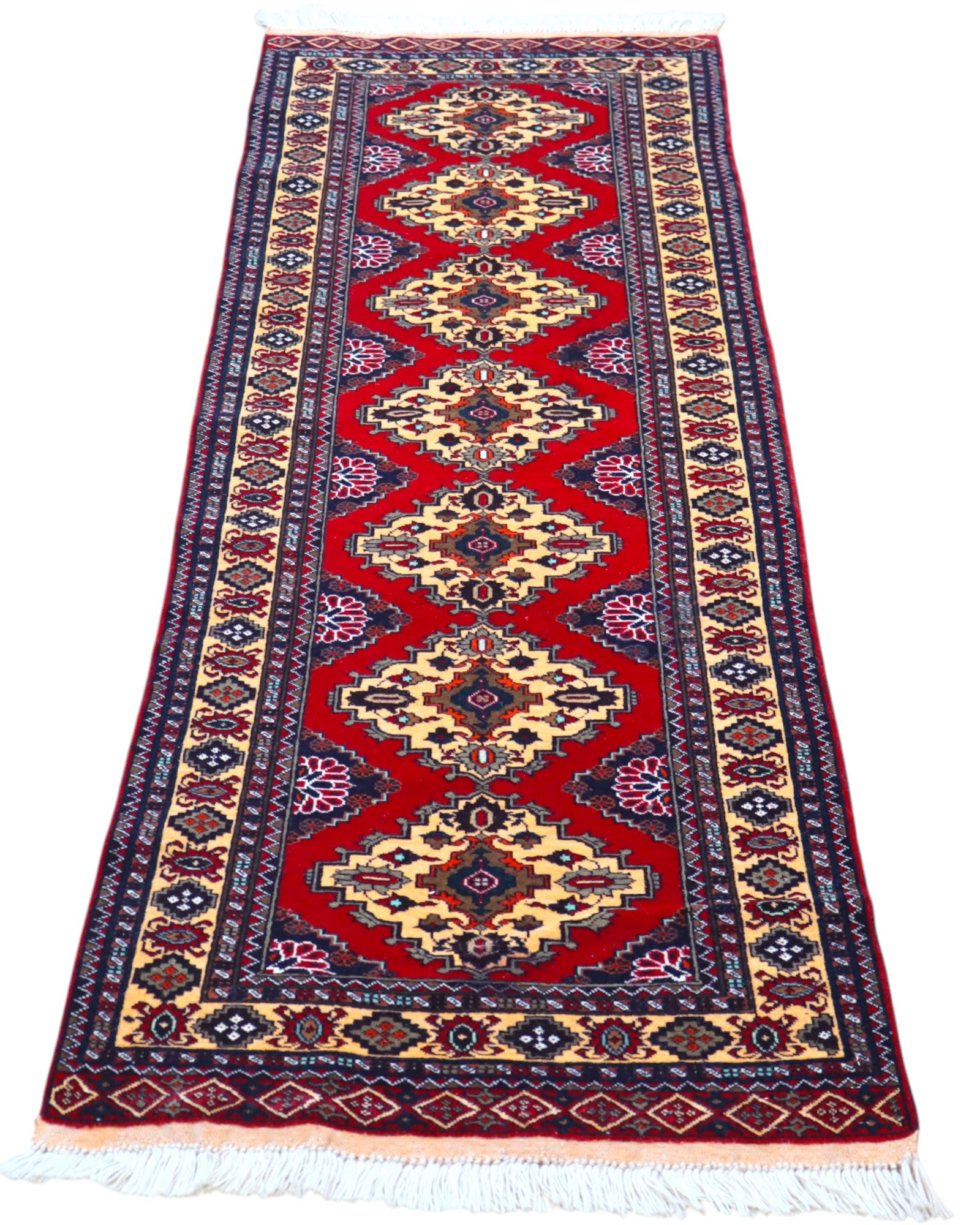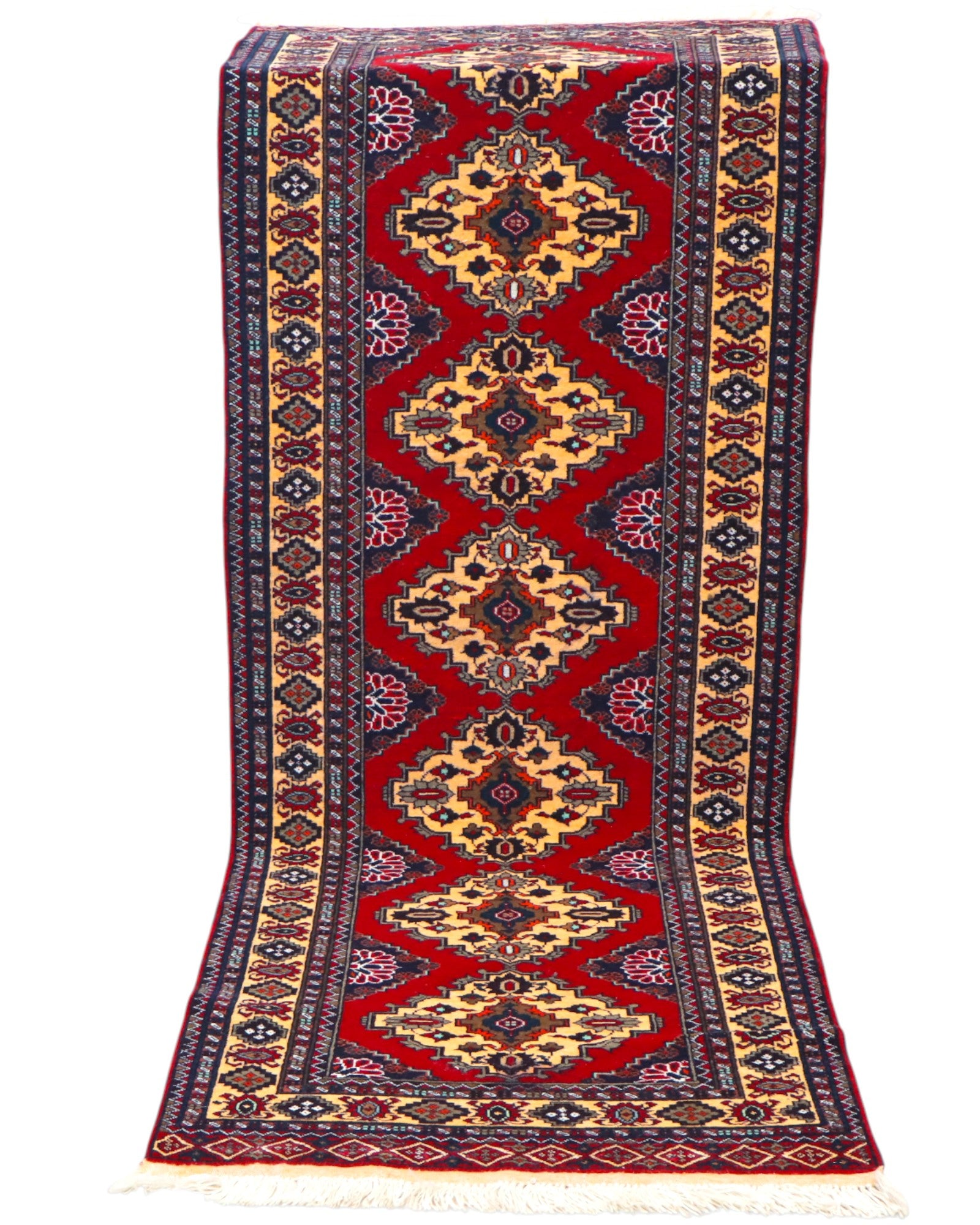 Il tappeto Turkman si distingue per i suoi motivi geometrici audaci e per il caratteristico fondo rosso intenso, tipico delle produzioni tribali persiane. Questo esemplare, di dimensioni 192 x 70 cm, è stato annodato a mano con vello in lana di alta qualità e colori vegetali naturali.